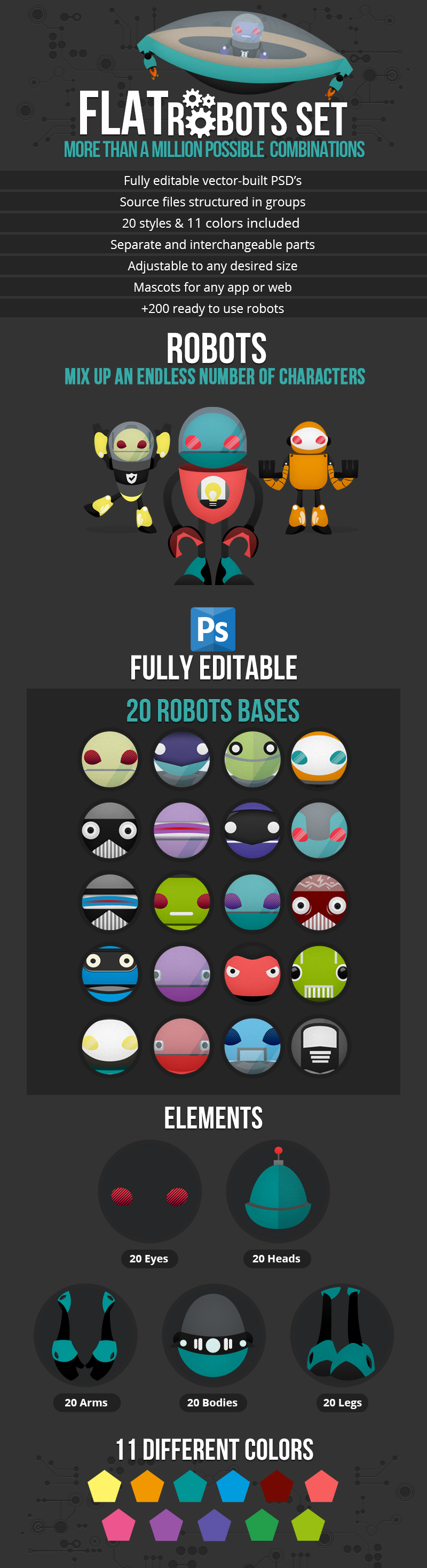 A set of flat robots that allows you to create over 1000 different robot characters by combining bits and pieces. This set consists 20 heads, 20 eyes, 20 arms, 20 legs and 20 bodies fully color-customizable in 11 different colors. On top of all this, you’ll get 20 preset robot bases for you to start combining and creating cool characters.