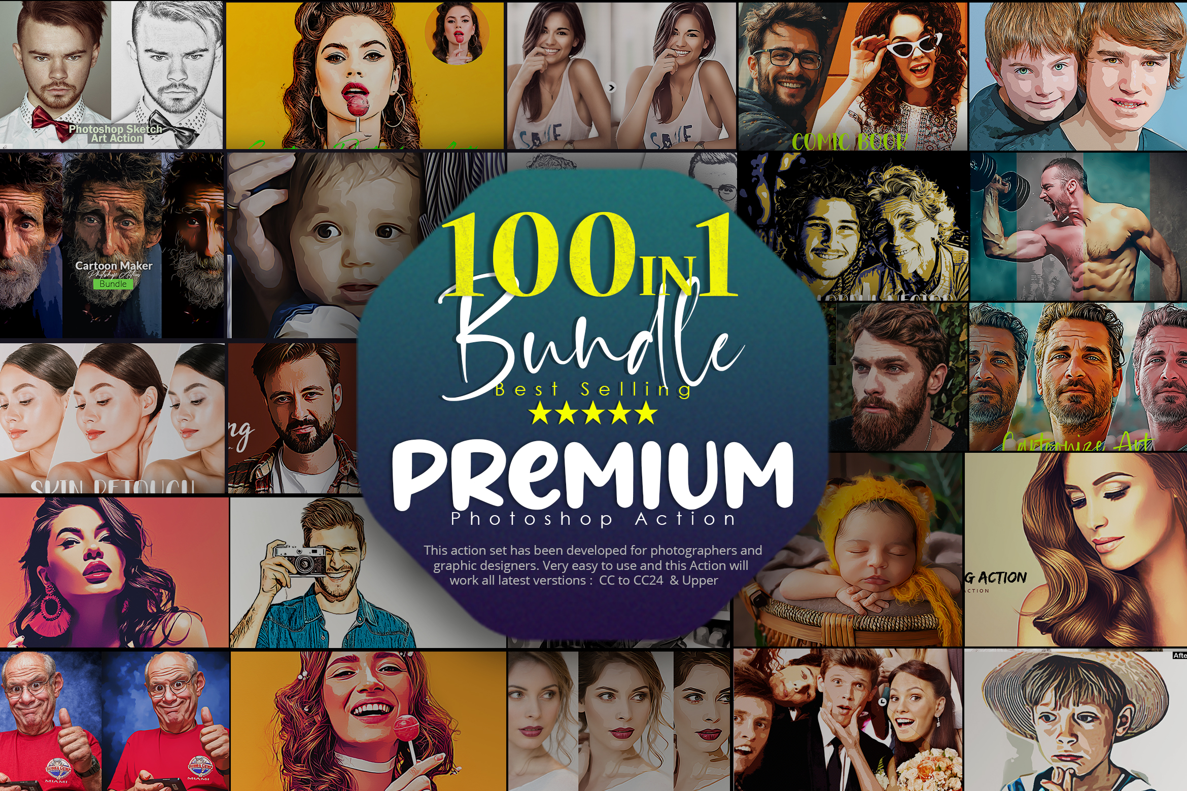 A 100-in-1 Bundle featuring best-selling premium Photoshop actions to simplify the process of creating realistic effects and add unique touches to your images, allowing you to effortlessly transform ordinary photos into artistic and highly personalized creations.
