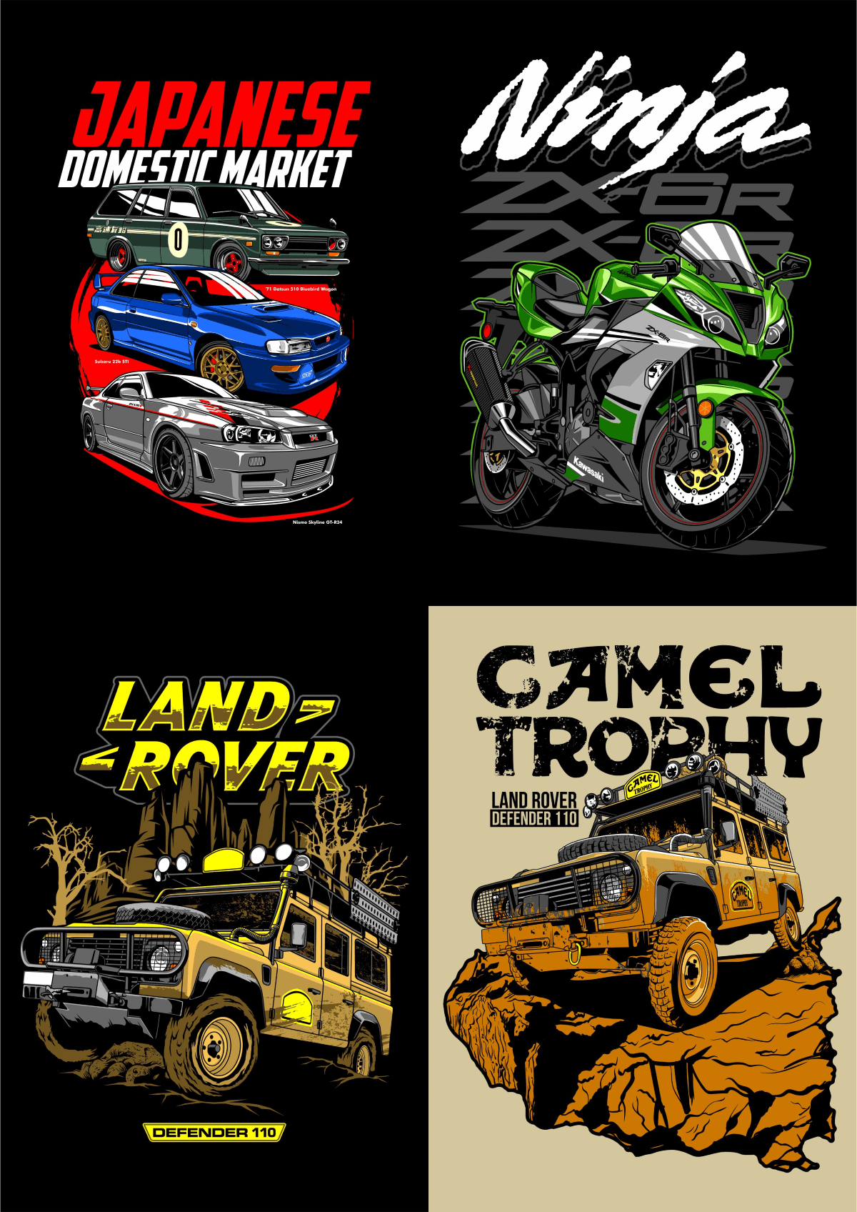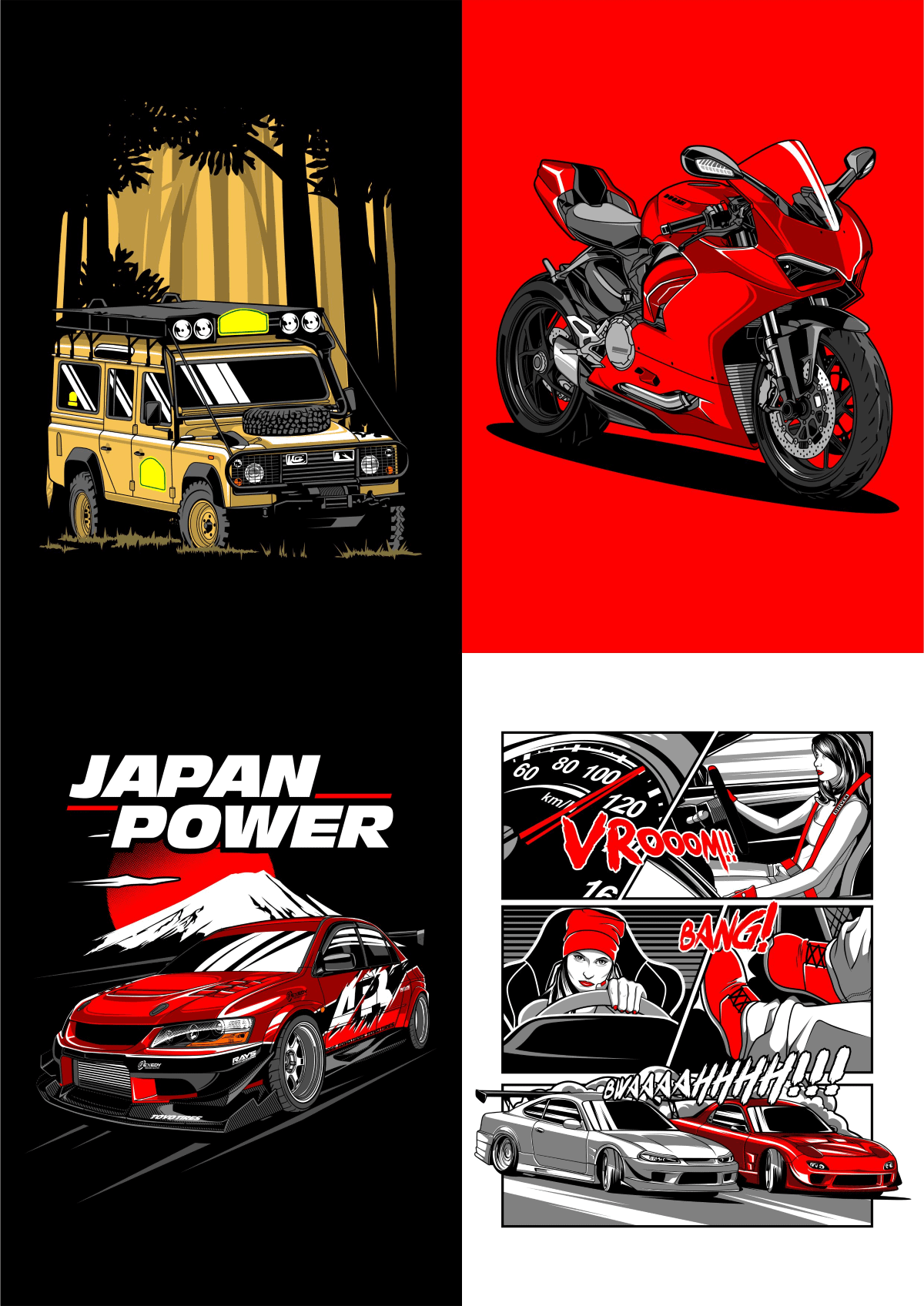 Every illustration in this package is delivered with Ai & PDF vector source files, 100% editable shapes that you can customize however you want: recolor the cars or elements, resize, add/remove elements, etc. The text elements are also fully editable, you can modify fonts, change lettering style and customize the texts and slogans.