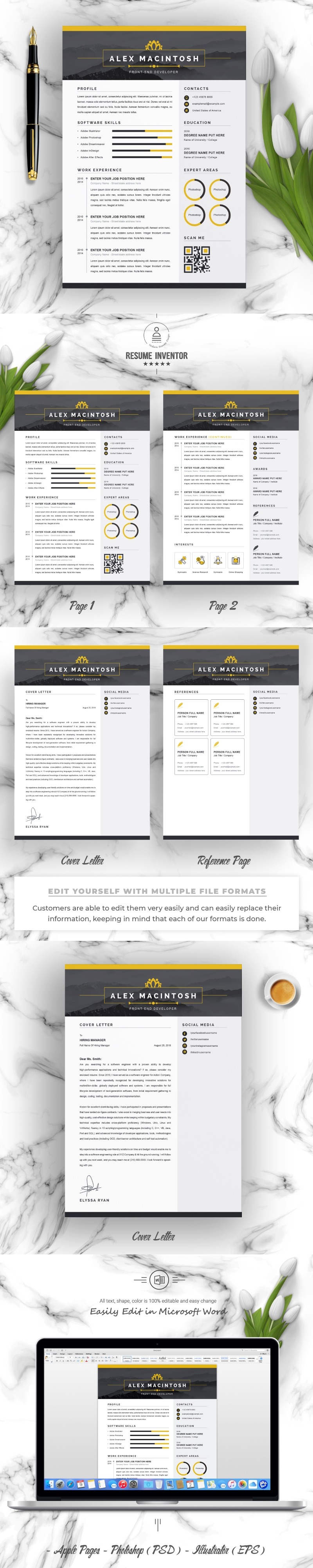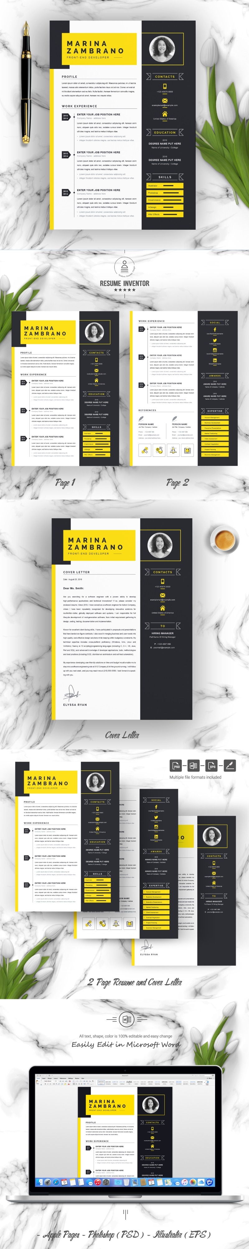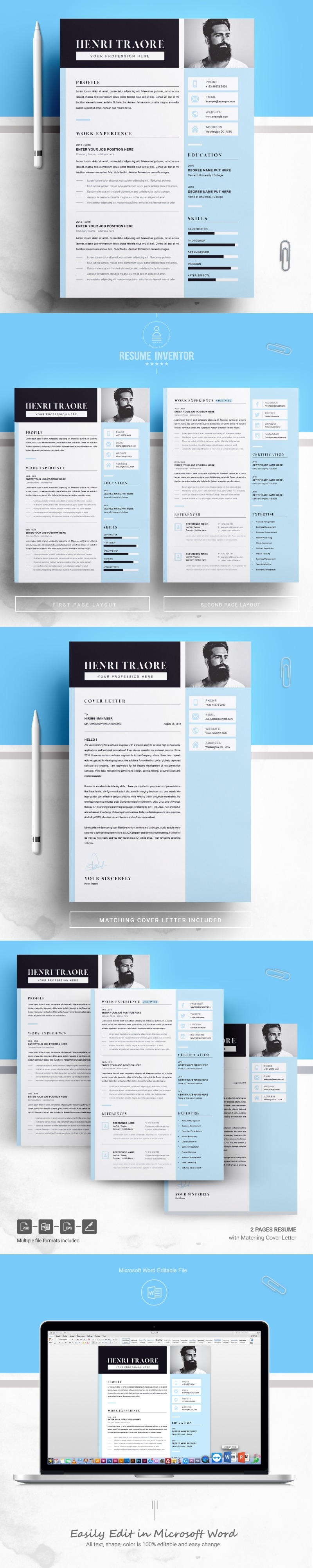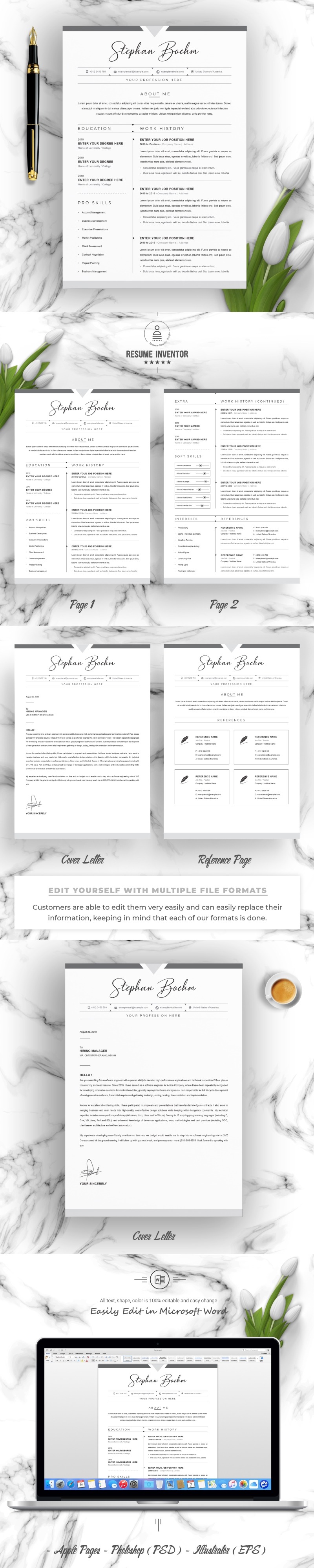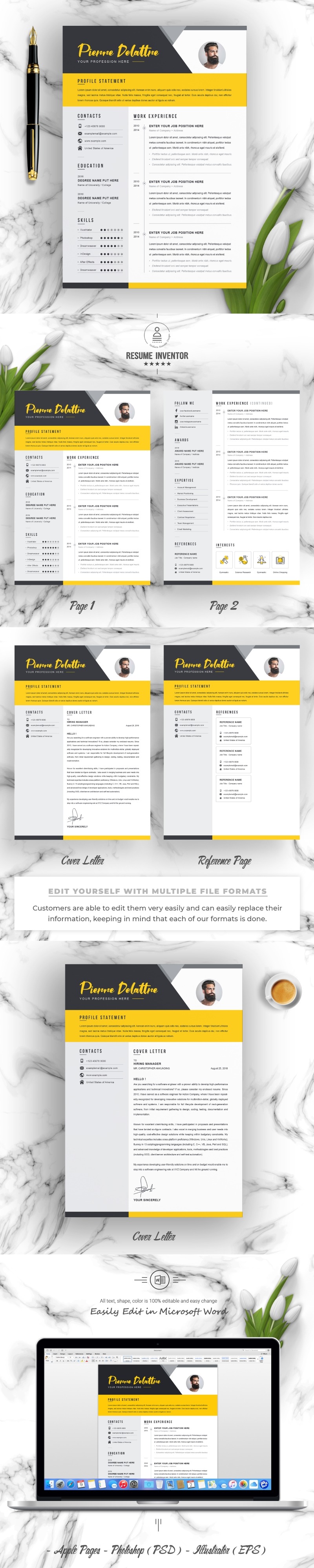 Every template features 2-3 unique page layouts and includes a matching Cover Letter template, all delivered in Docx, Apple Pages, PSD & EPS file formats, fully editable & customizable to your liking, with links to the free fonts used on the dummy texts
