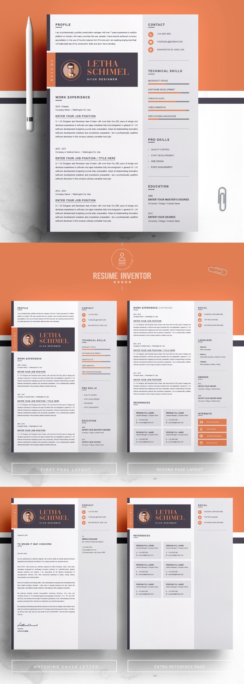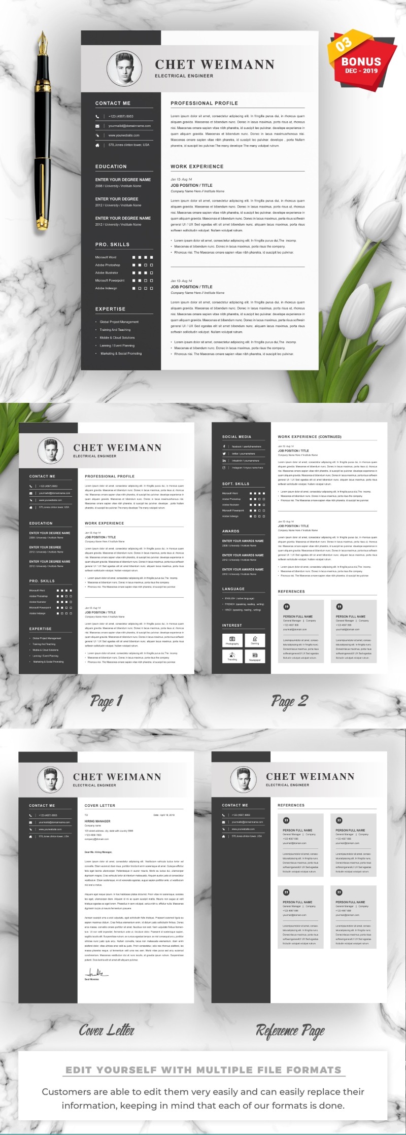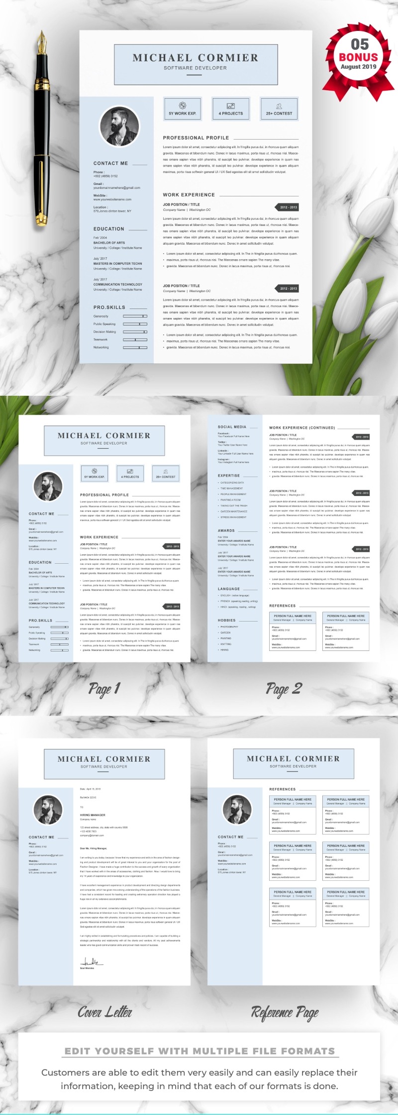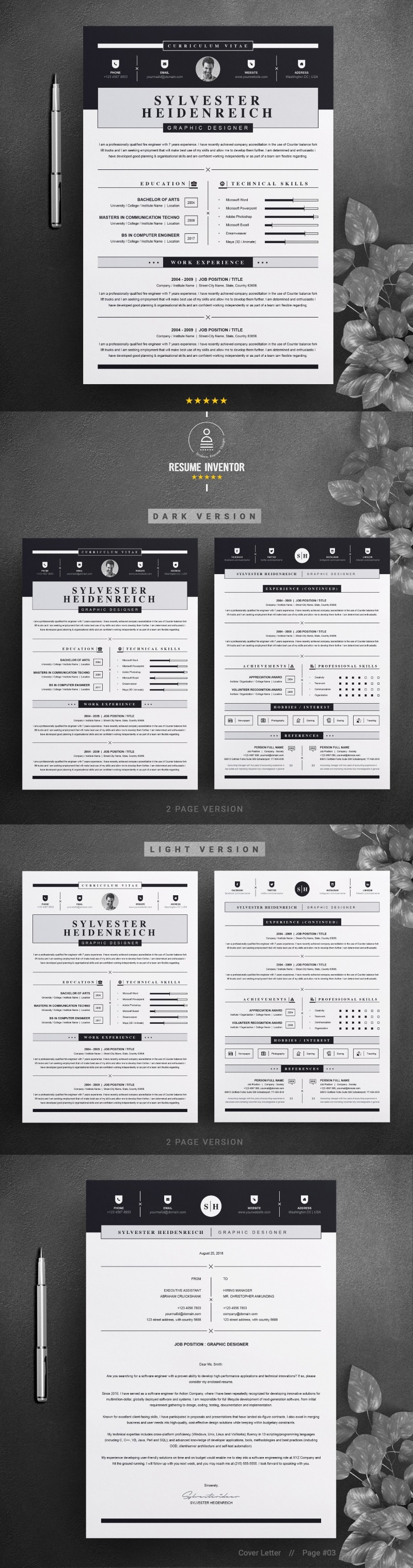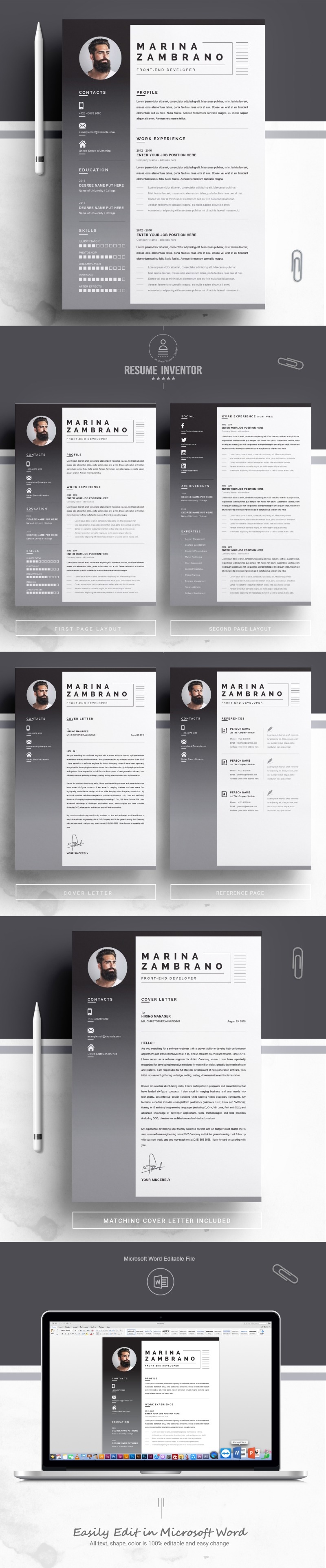 Every template features 2-3 unique page layouts and includes a matching Cover Letter template, all delivered in Docx, Apple Pages, PSD & EPS file formats, fully editable & customizable to your liking, with links to the free fonts used on the dummy texts