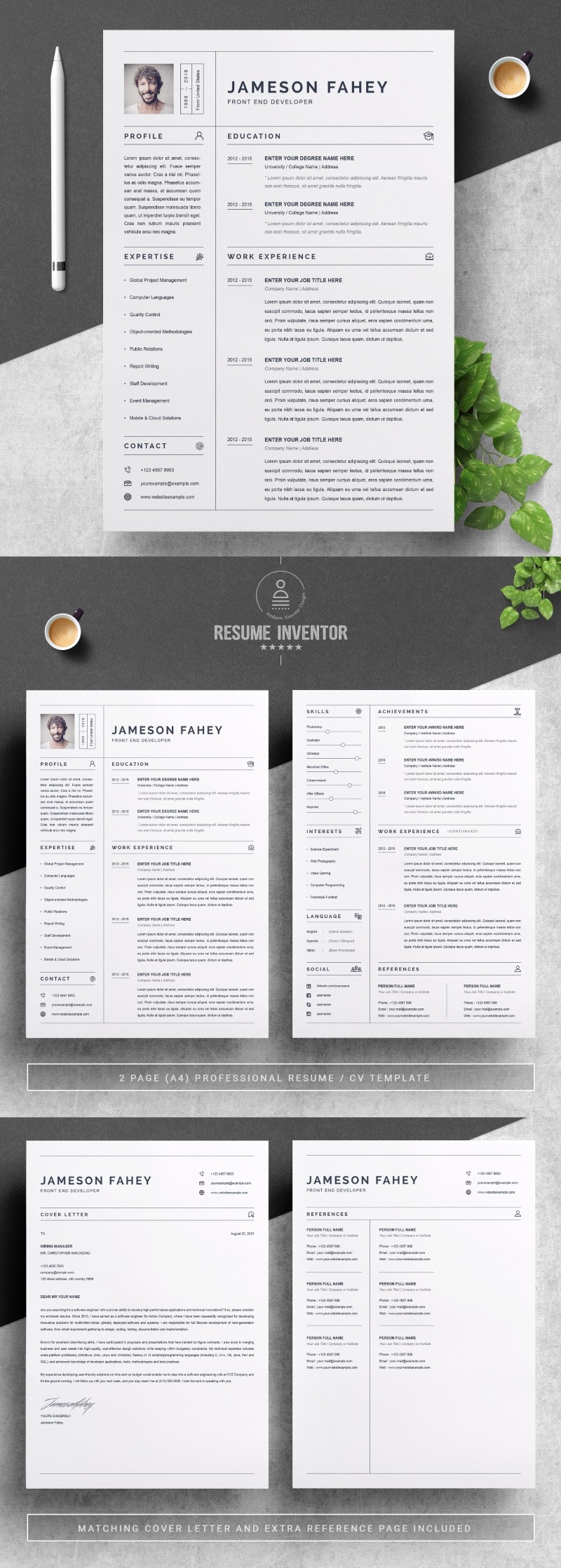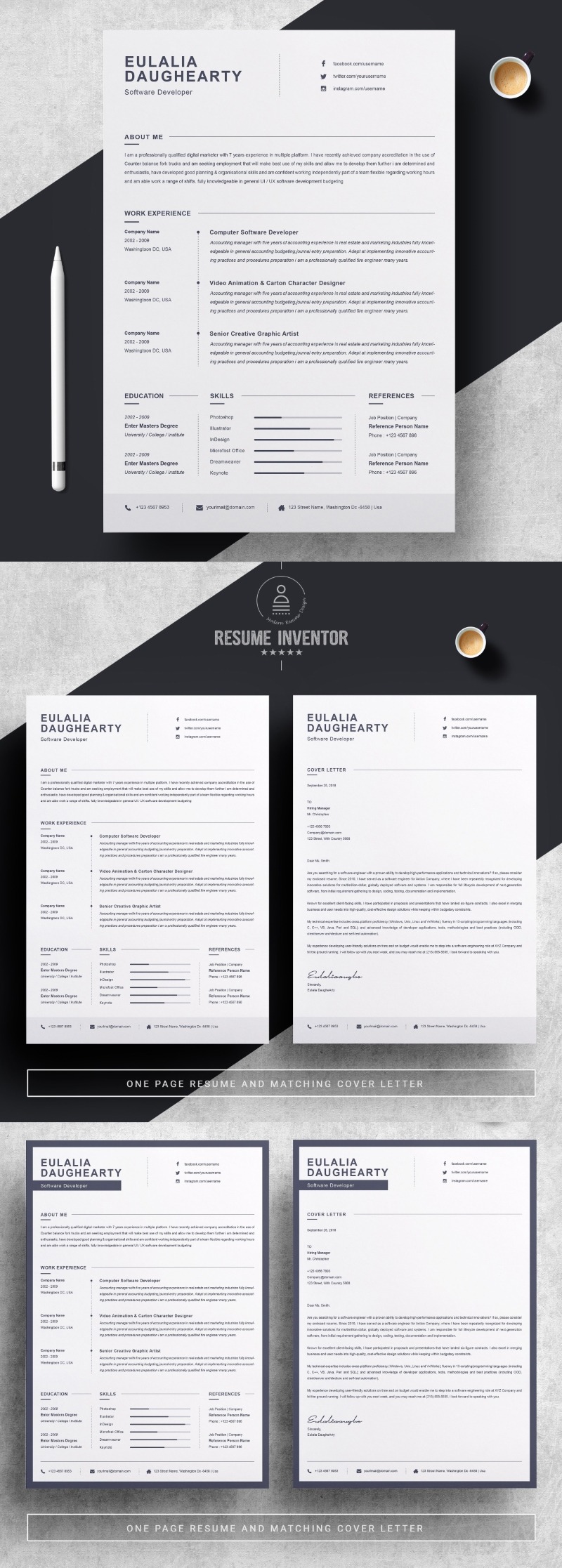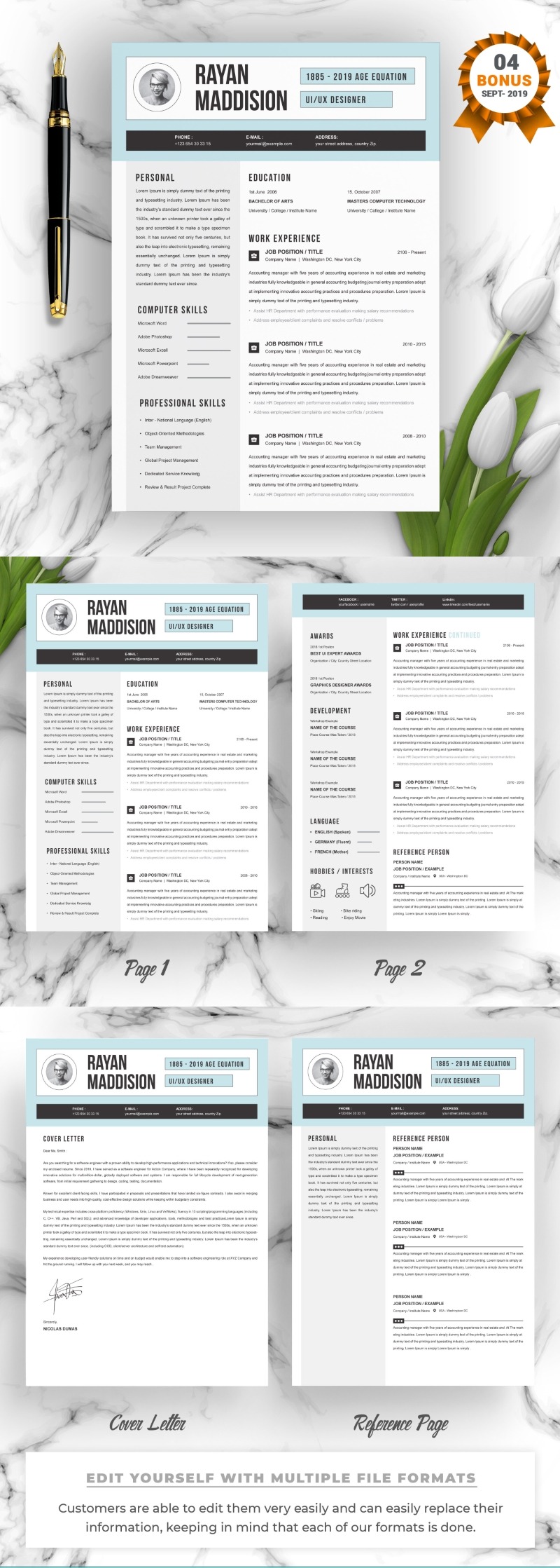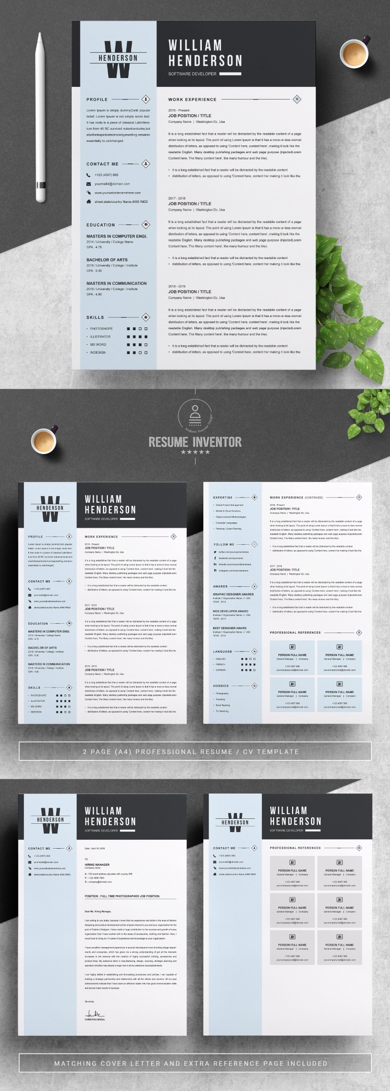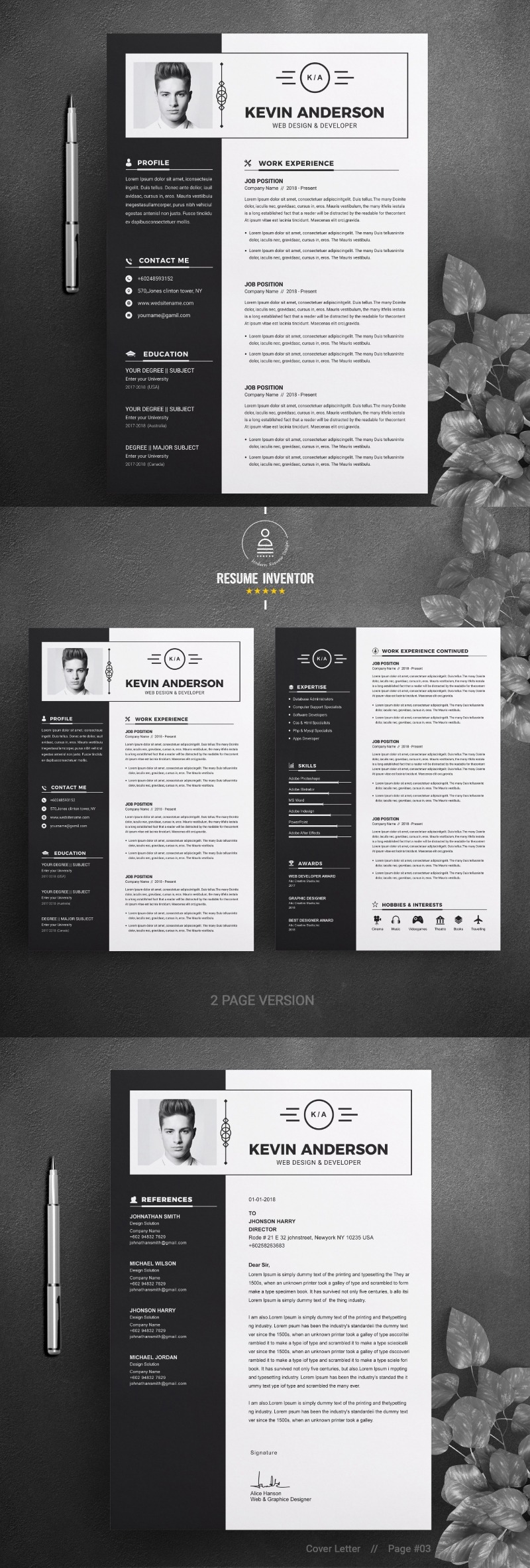 Every template features 2-3 unique page layouts and includes a matching Cover Letter template, all delivered in Docx, Apple Pages, PSD & EPS file formats, fully editable & customizable to your liking, with links to the free fonts used on the dummy texts