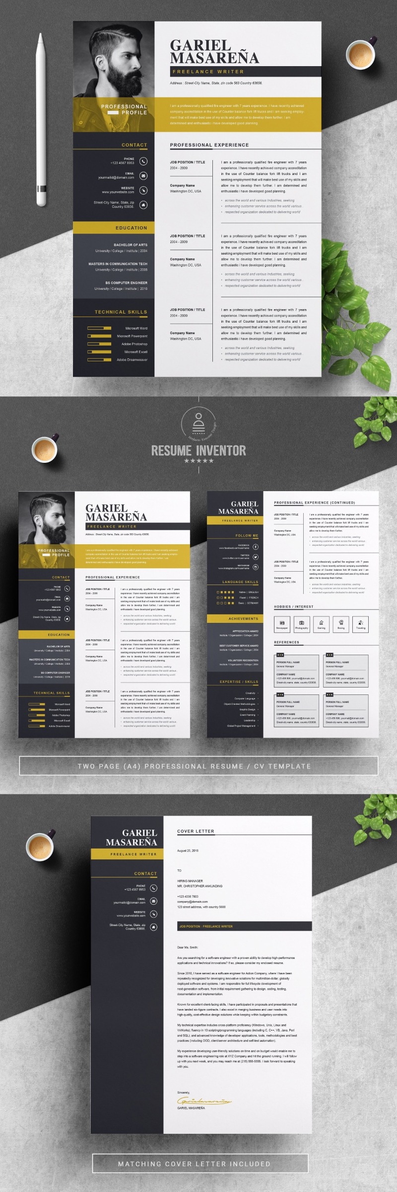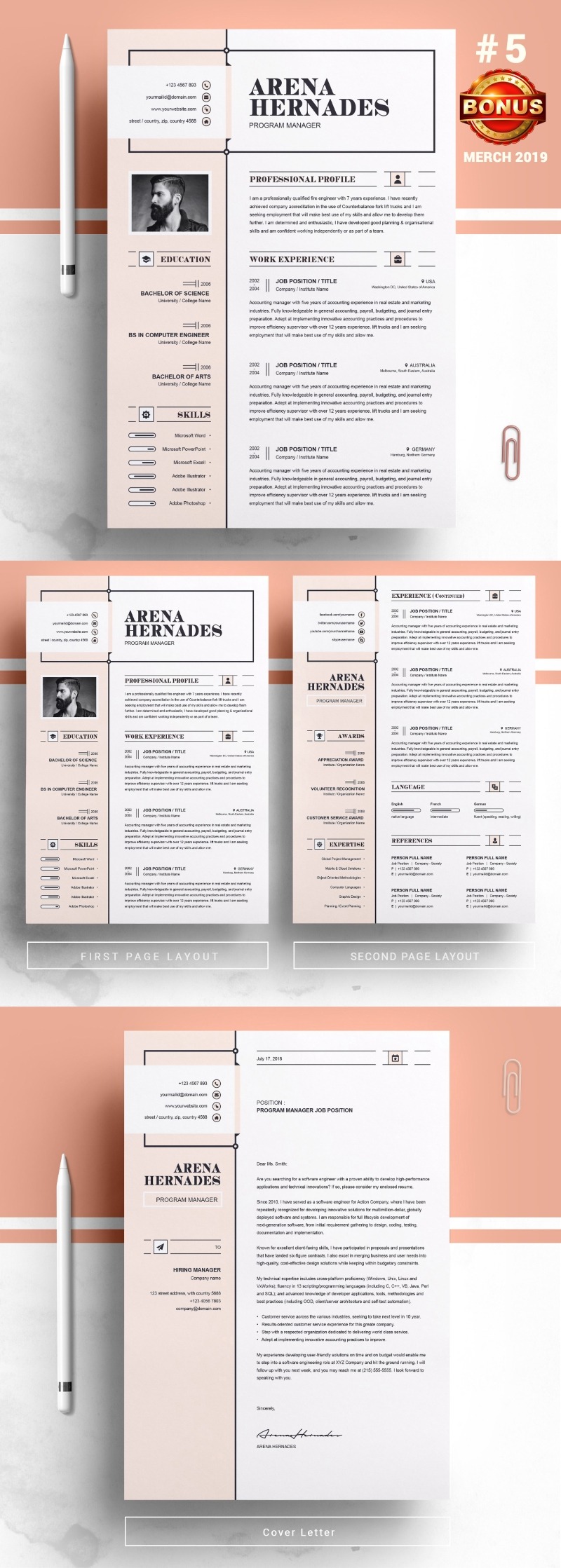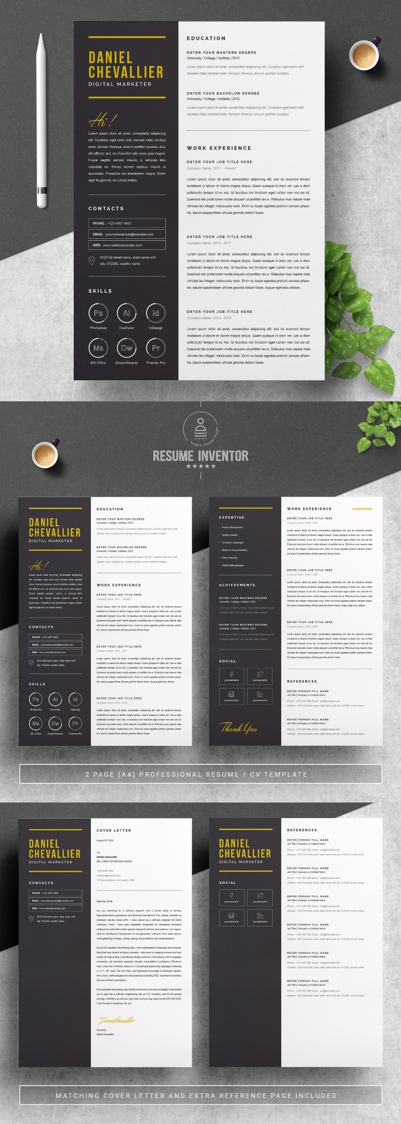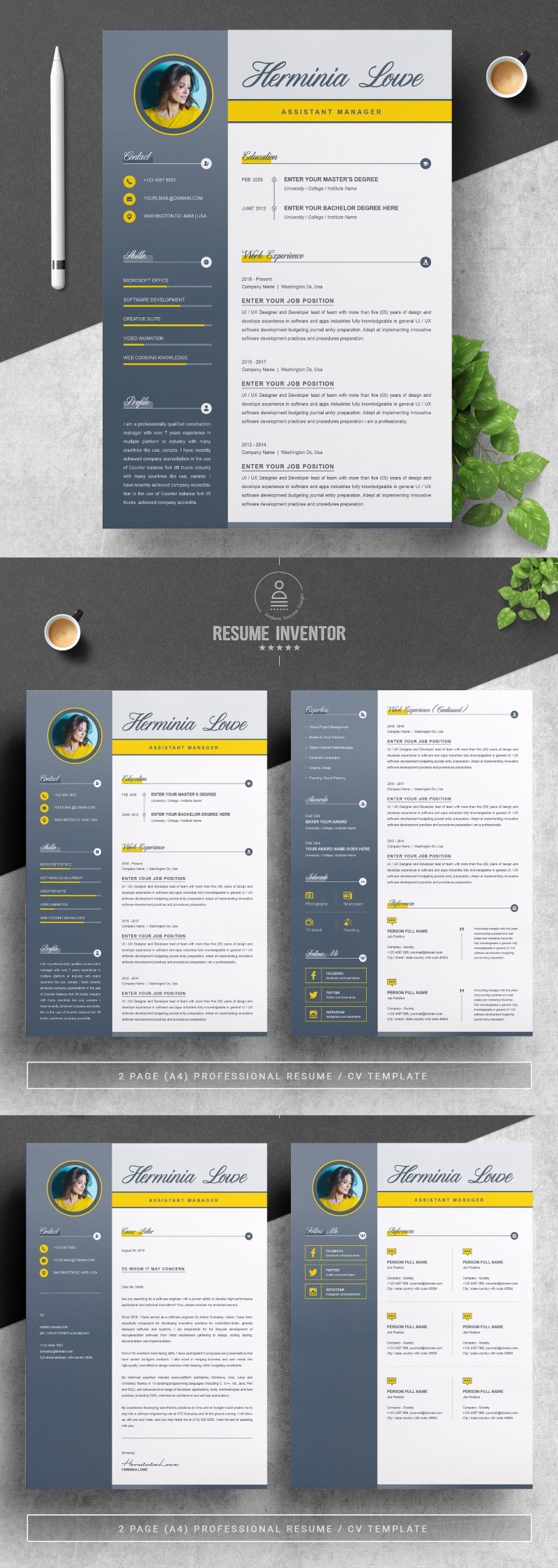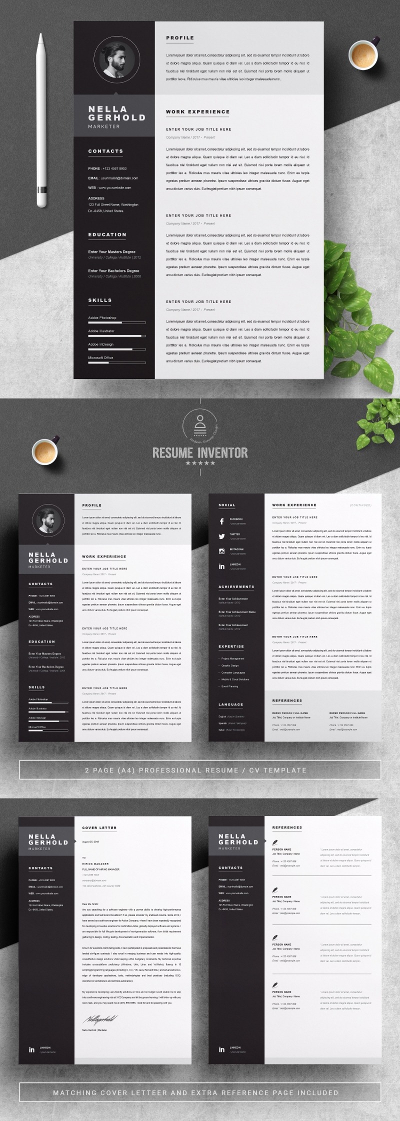 Every template features 2-3 unique page layouts and includes a matching Cover Letter template, all delivered in Docx, Apple Pages, PSD & EPS file formats, fully editable & customizable to your liking, with links to the free fonts used on the dummy texts