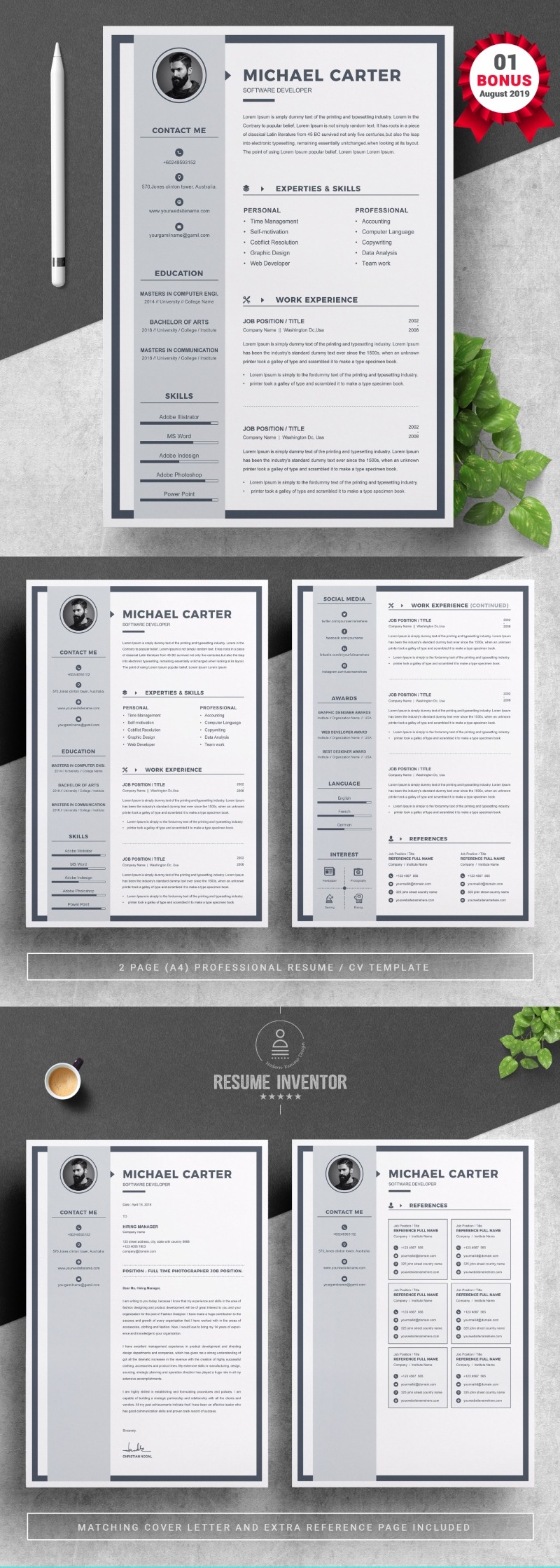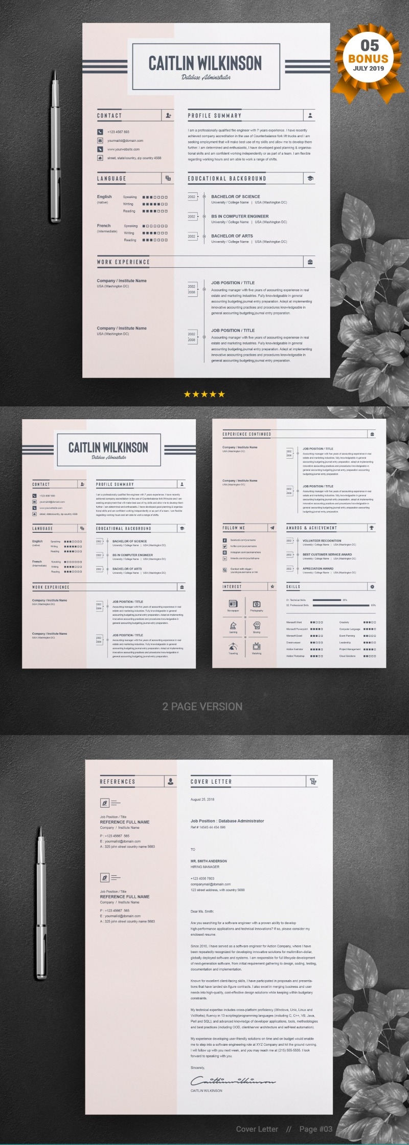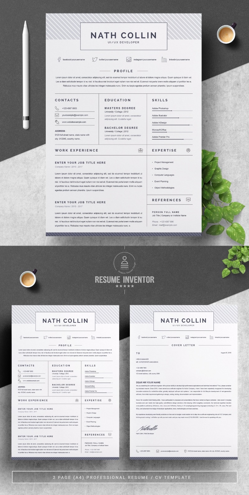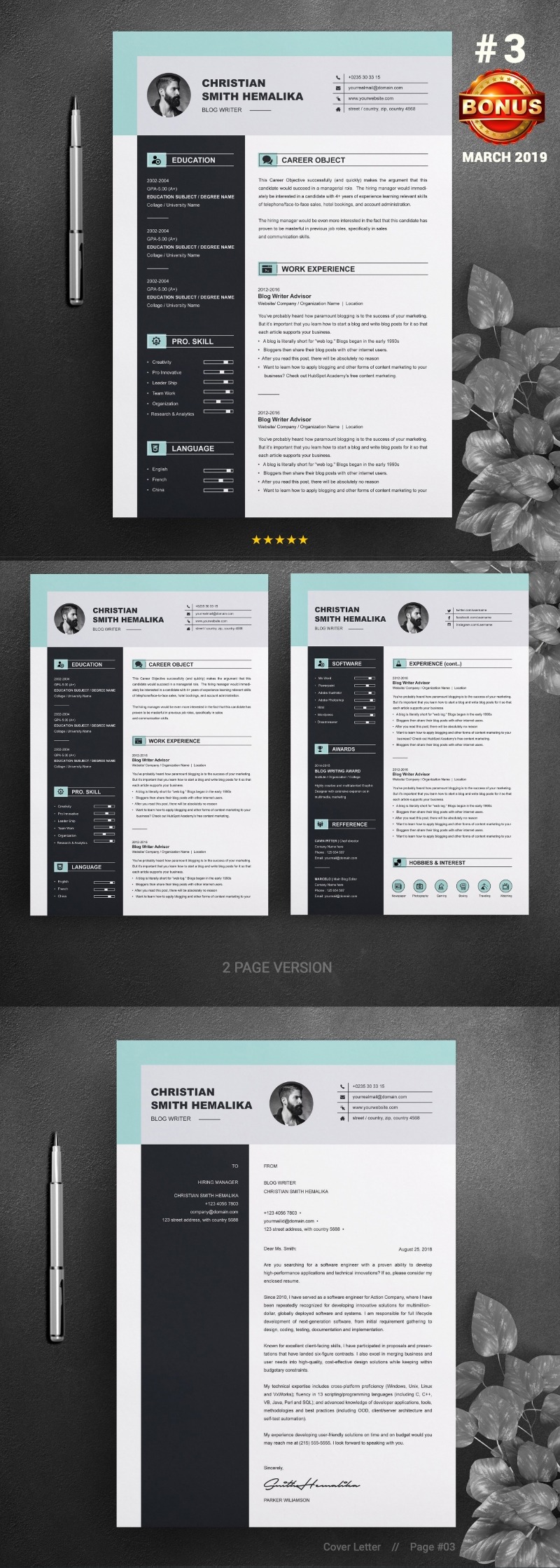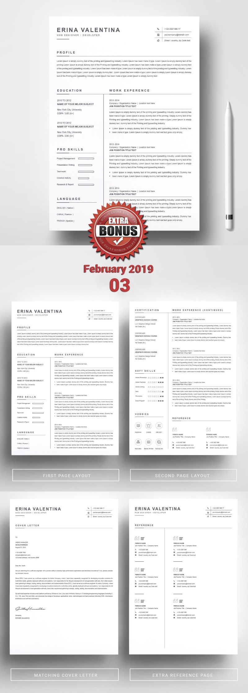 Every template features 2-3 unique page layouts and includes a matching Cover Letter template, all delivered in Docx, Apple Pages, PSD & EPS file formats, fully editable & customizable to your liking, with links to the free fonts used on the dummy texts