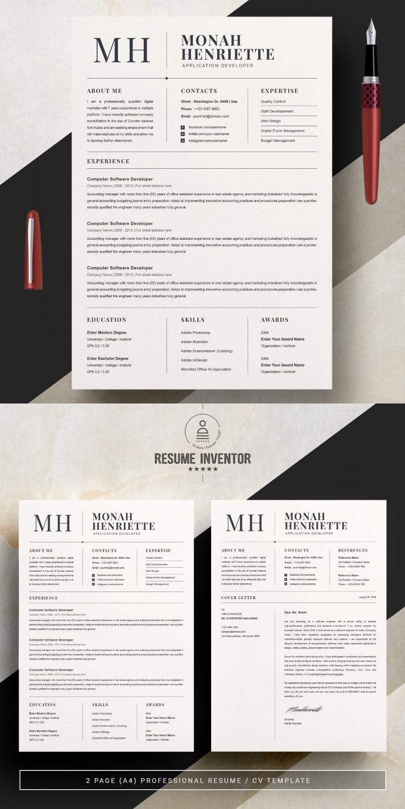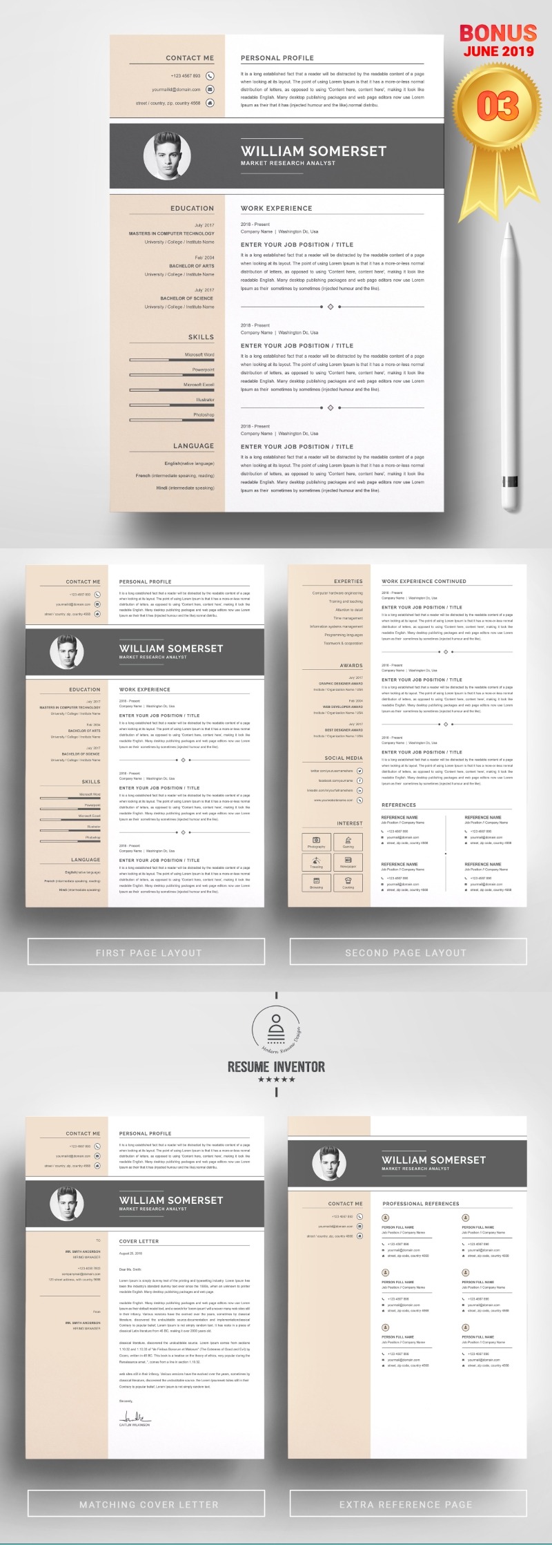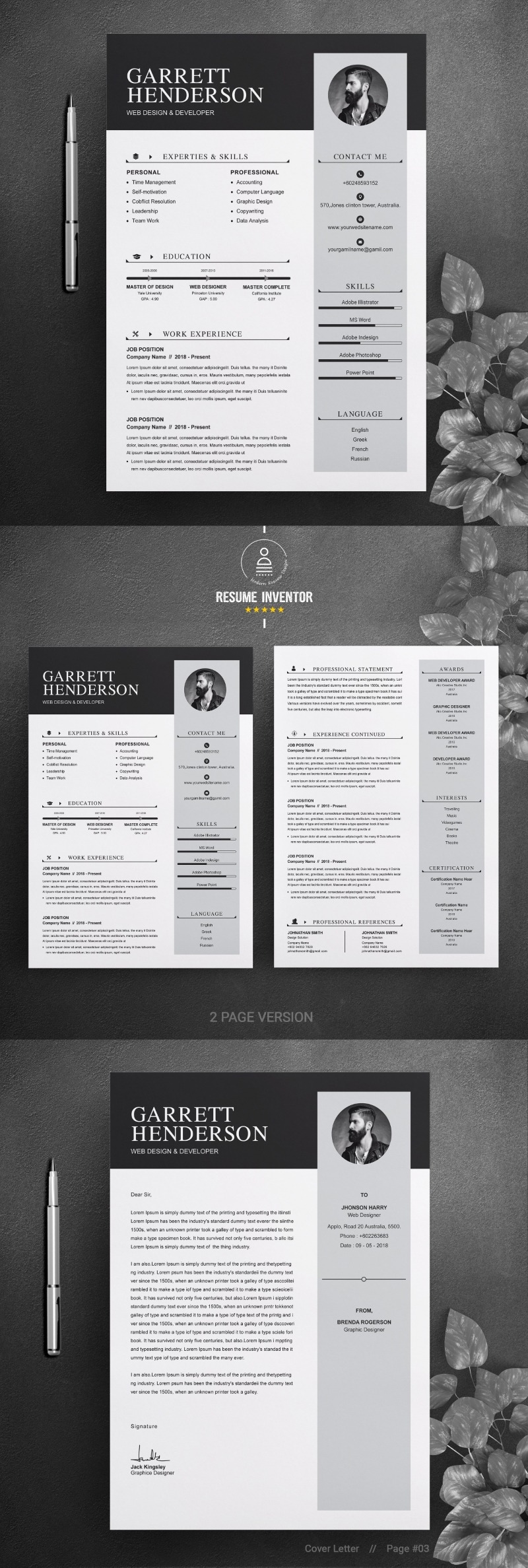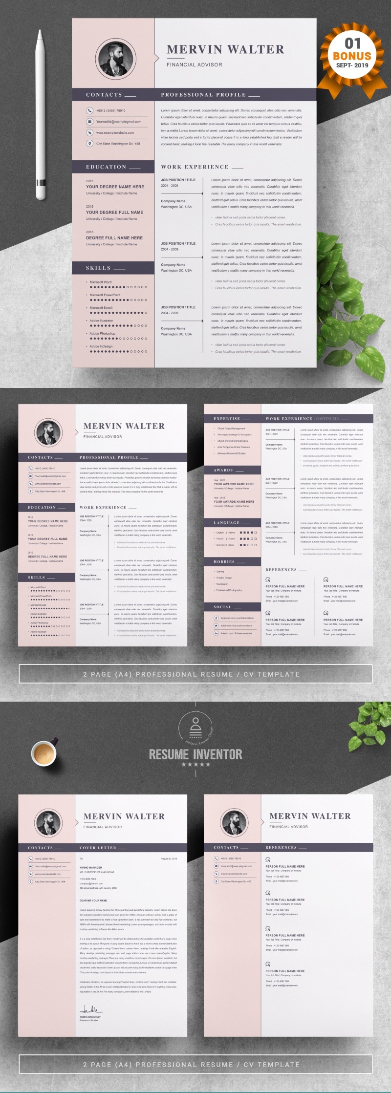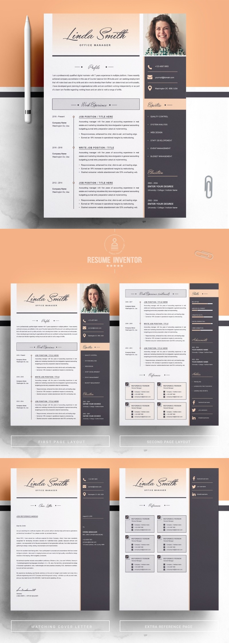 Every template features 2-3 unique page layouts and includes a matching Cover Letter template, all delivered in Docx, Apple Pages, PSD & EPS file formats, fully editable & customizable to your liking, with links to the free fonts used on the dummy texts