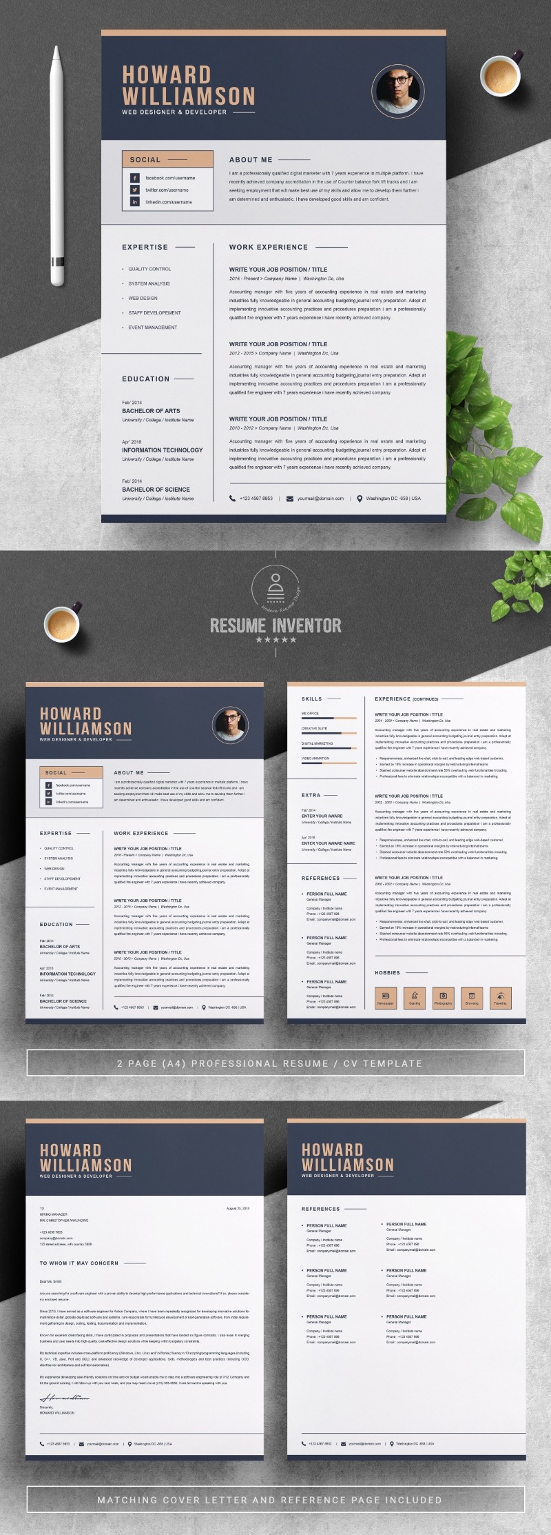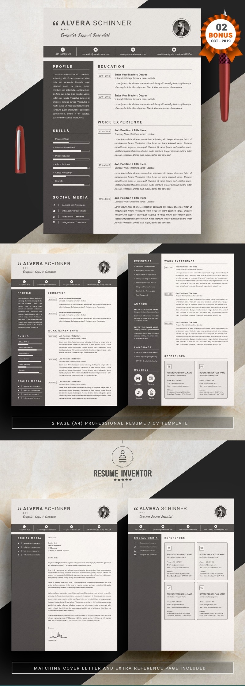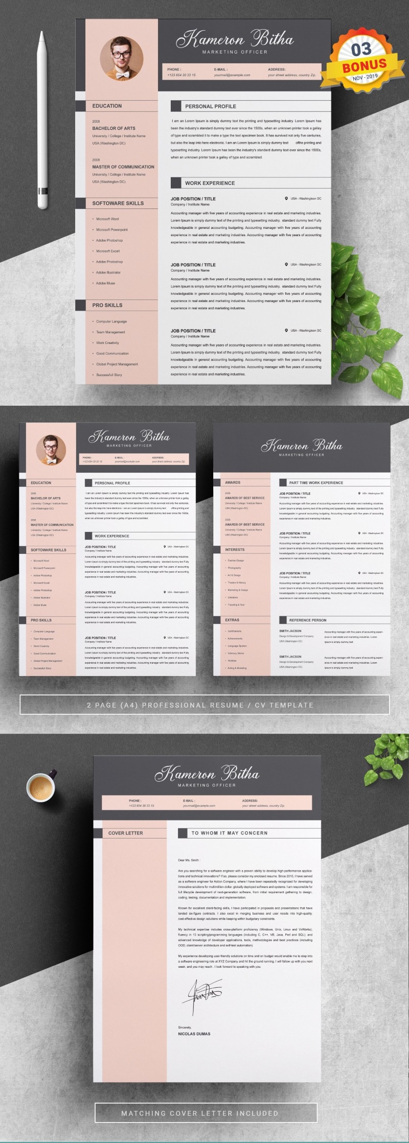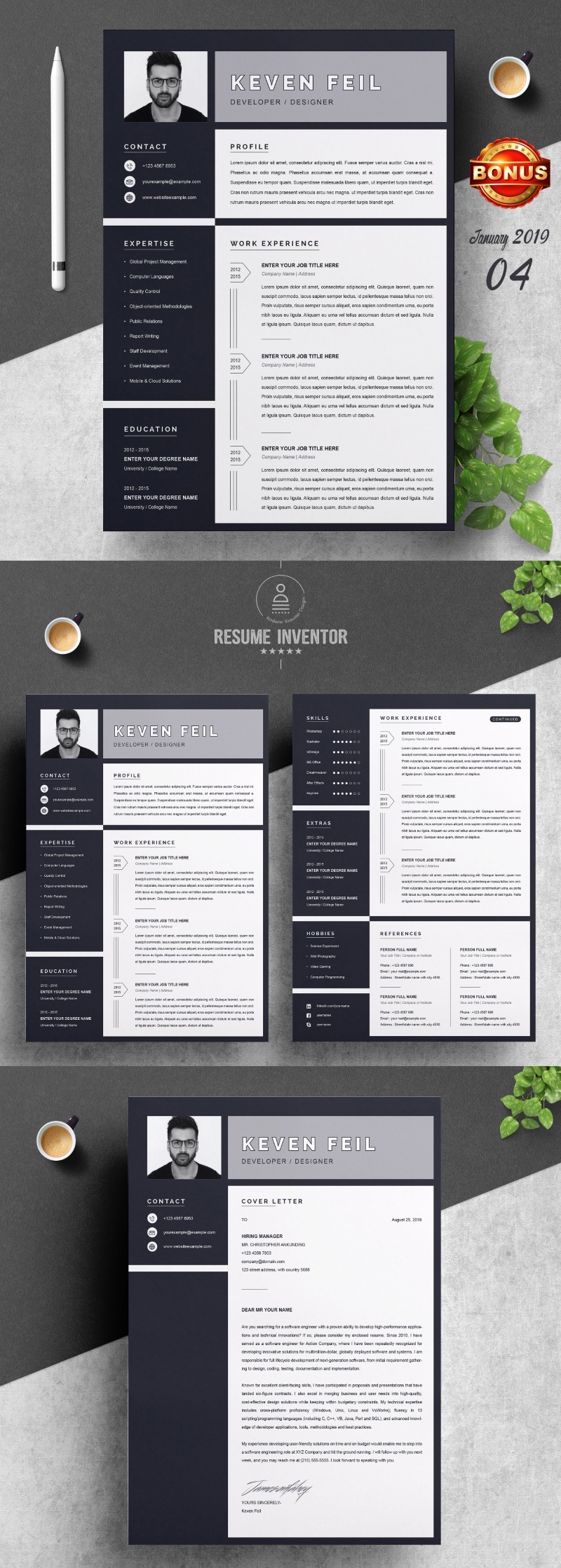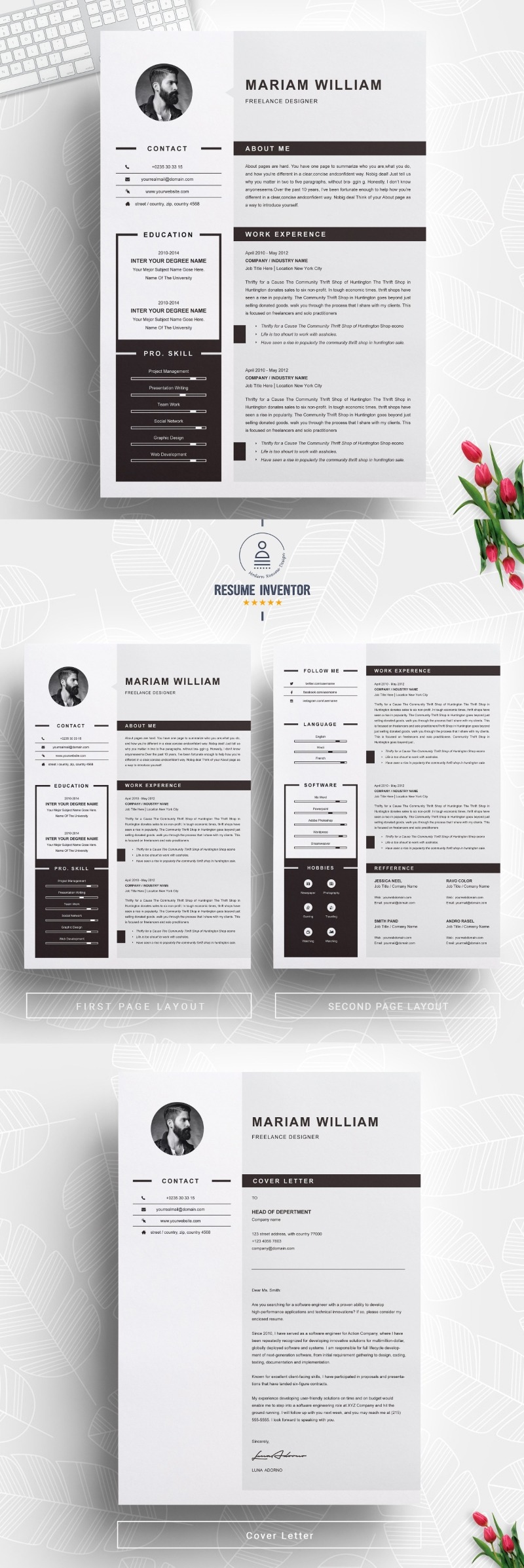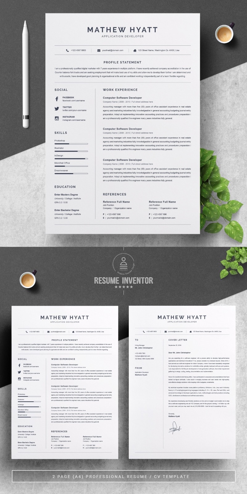 Every template features 2-3 unique page layouts and includes a matching Cover Letter template, all delivered in Docx, Apple Pages, PSD & EPS file formats, fully editable & customizable to your liking, with links to the free fonts used on the dummy texts