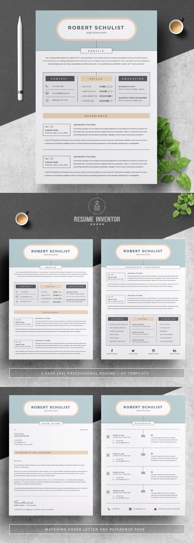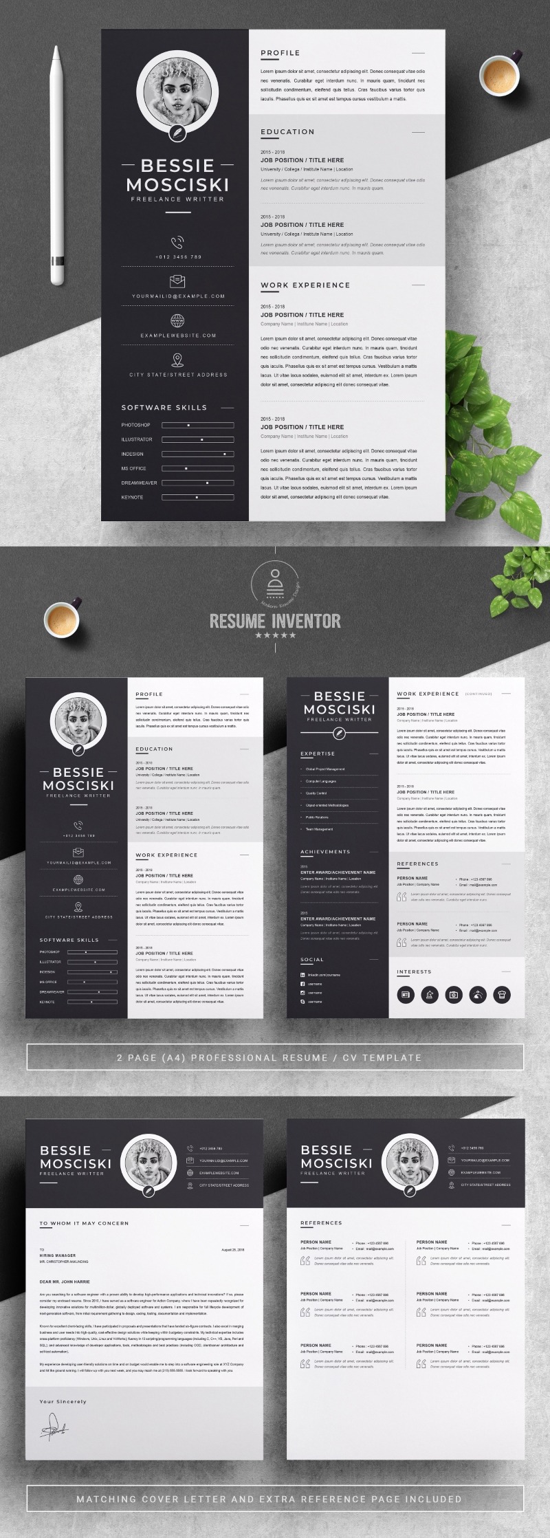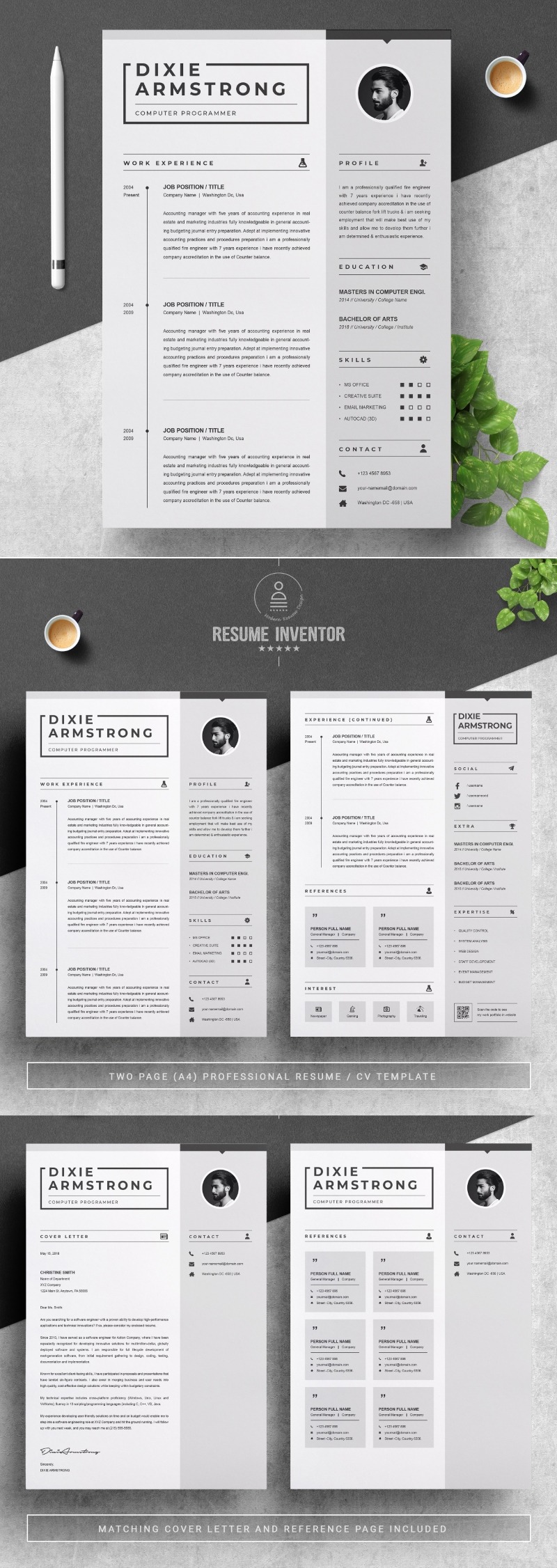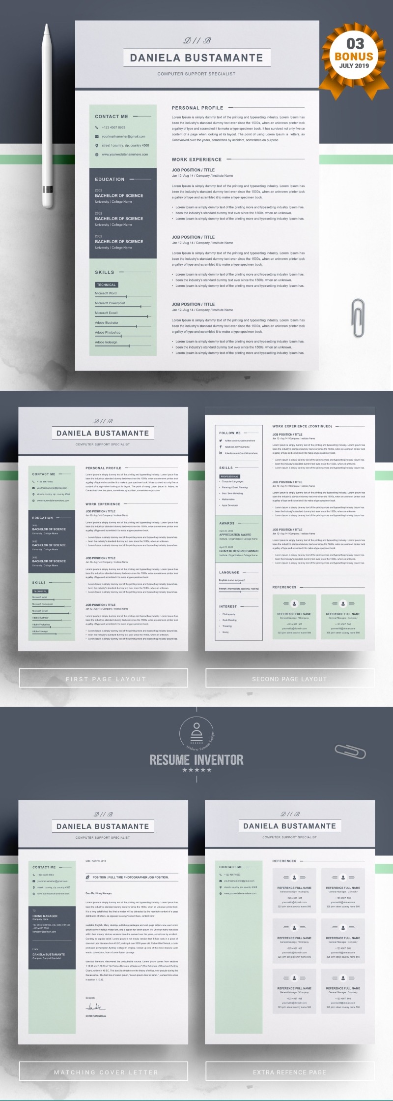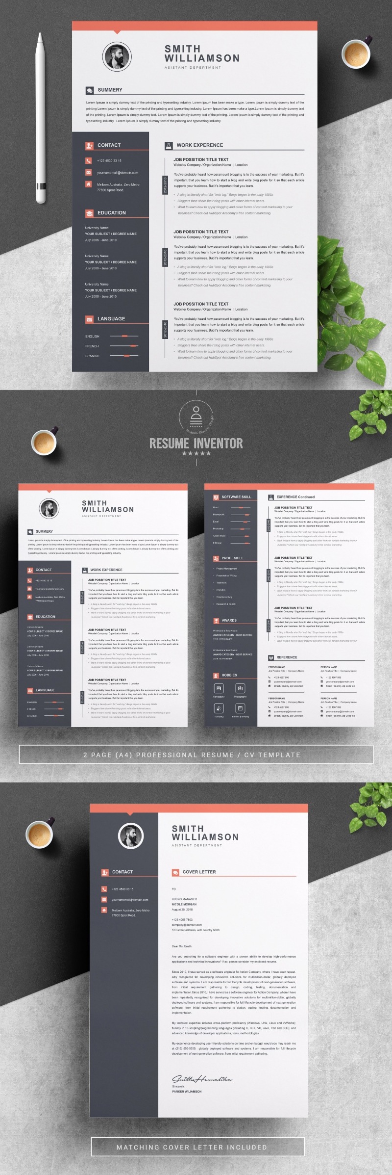 Every template features 2-3 unique page layouts and includes a matching Cover Letter template, all delivered in Docx, Apple Pages, PSD & EPS file formats, fully editable & customizable to your liking, with links to the free fonts used on the dummy texts