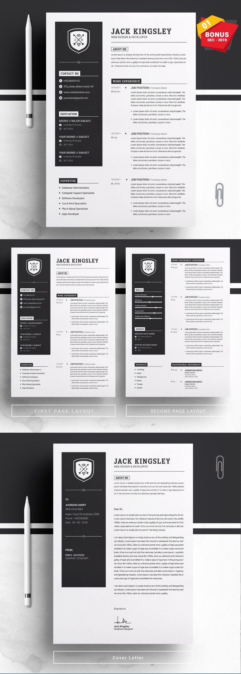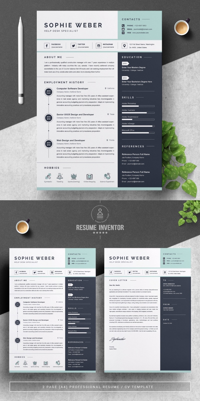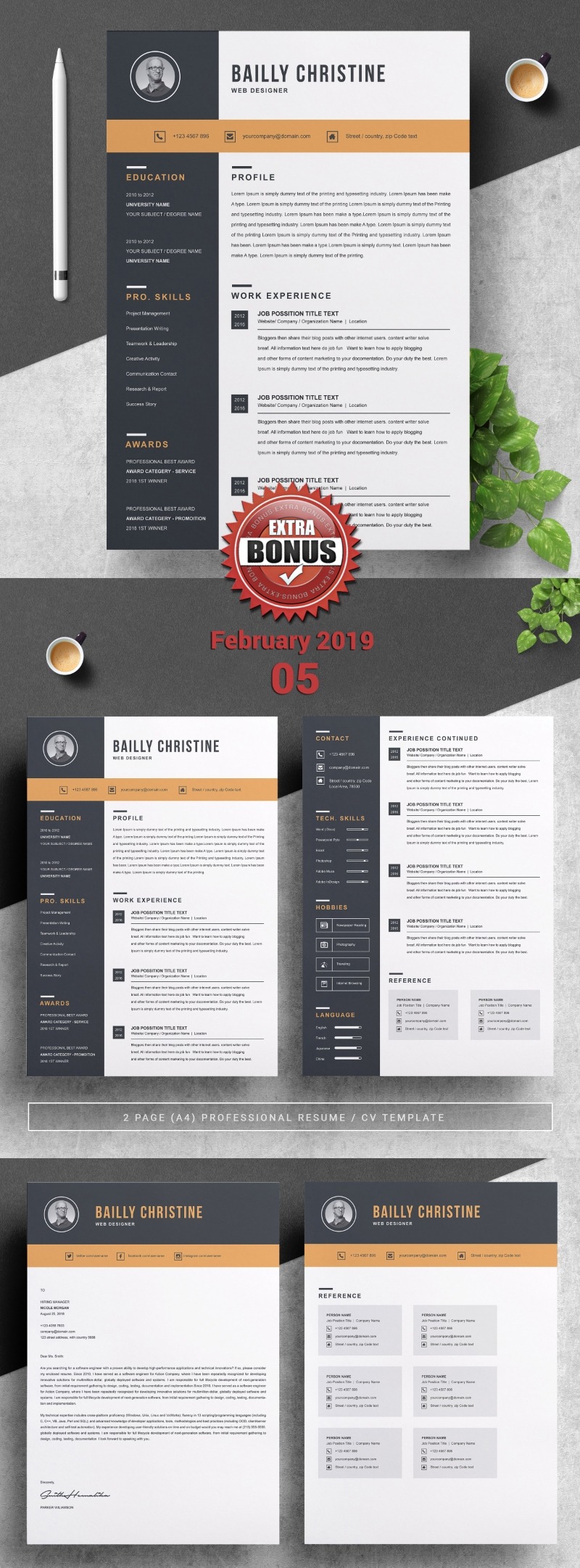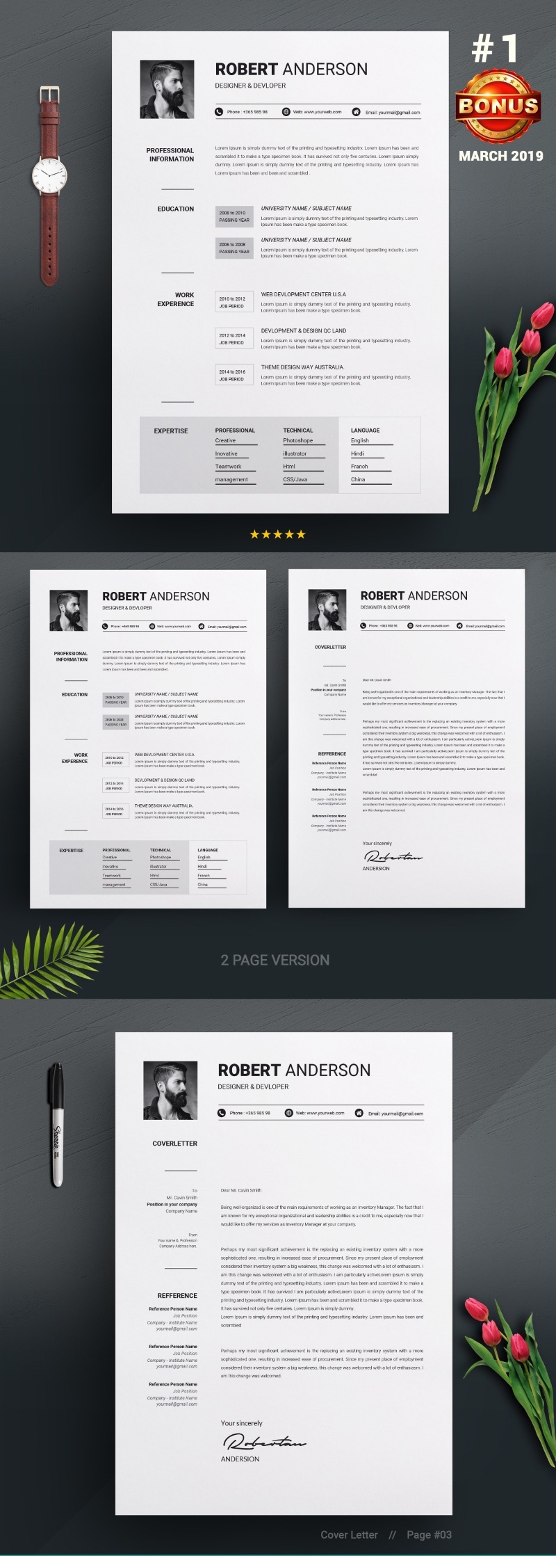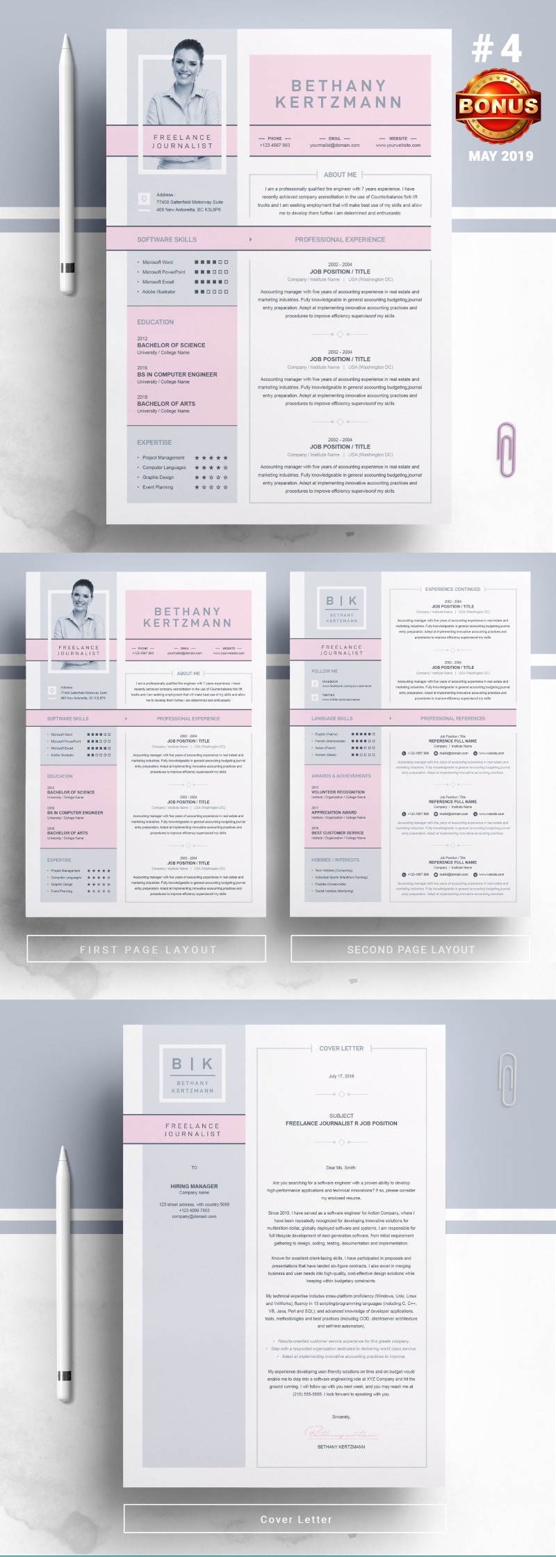 Every template features 2-3 unique page layouts and includes a matching Cover Letter template, all delivered in Docx, Apple Pages, PSD & EPS file formats, fully editable & customizable to your liking, with links to the free fonts used on the dummy texts