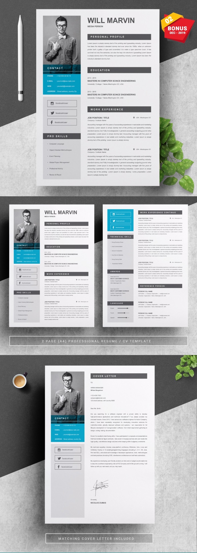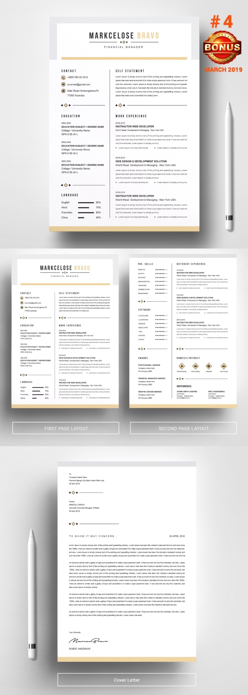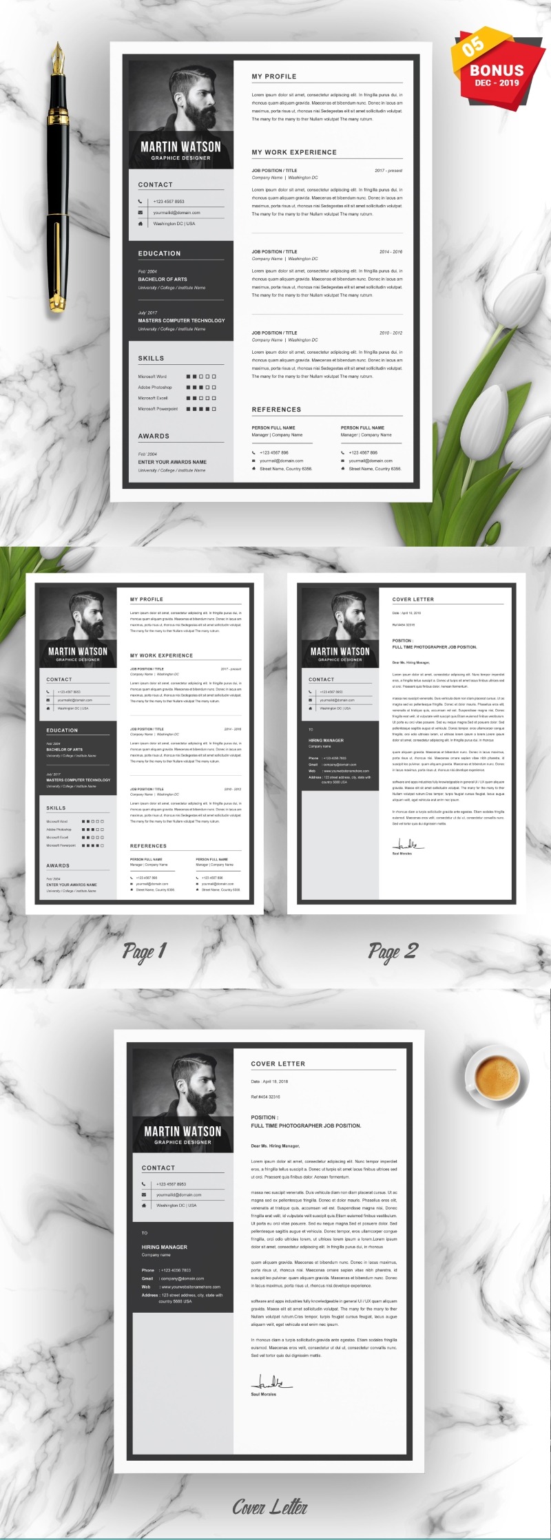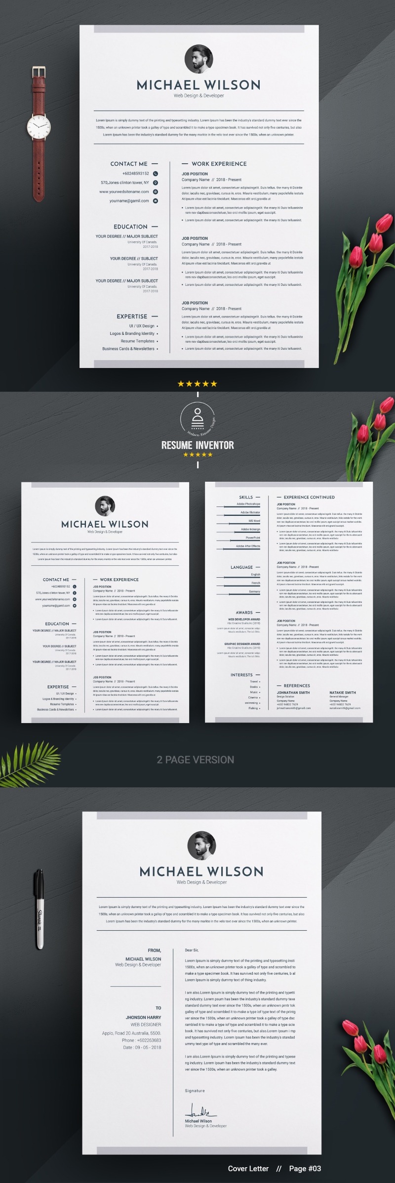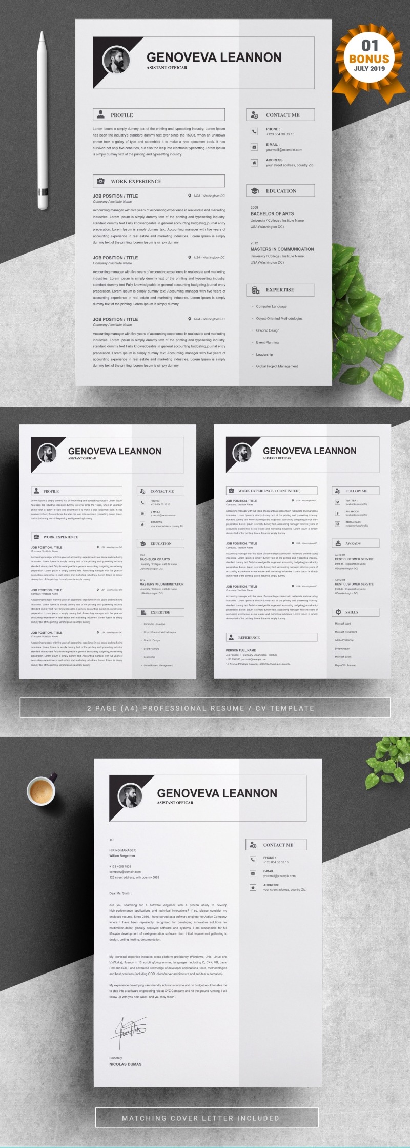 Every template features 2-3 unique page layouts and includes a matching Cover Letter template, all delivered in Docx, Apple Pages, PSD & EPS file formats, fully editable & customizable to your liking, with links to the free fonts used on the dummy texts