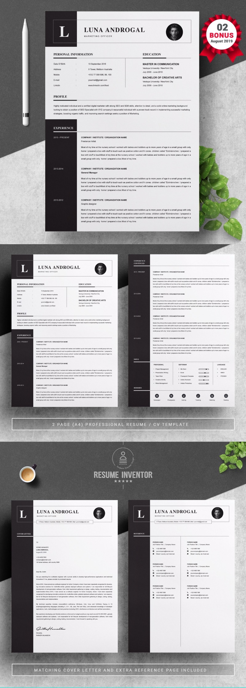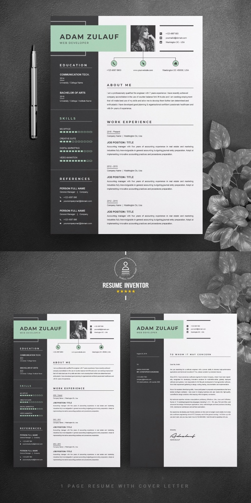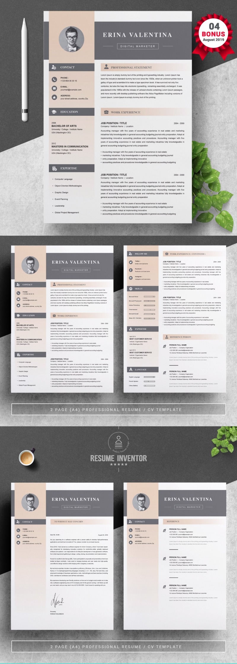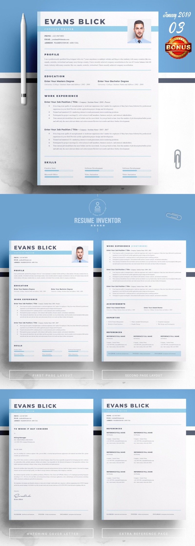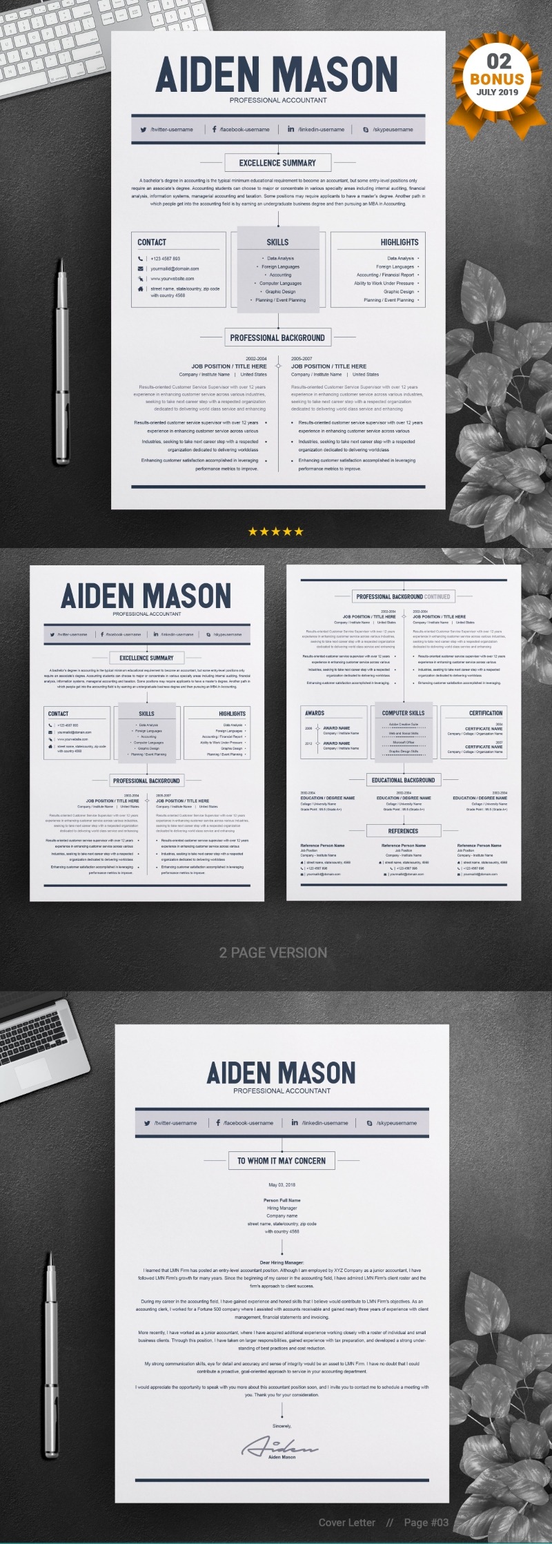 Every template features 2-3 unique page layouts and includes a matching Cover Letter template, all delivered in Docx, Apple Pages, PSD & EPS file formats, fully editable & customizable to your liking, with links to the free fonts used on the dummy texts