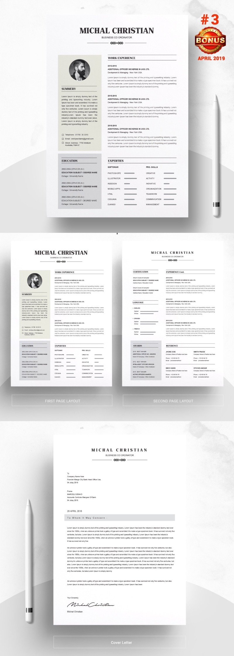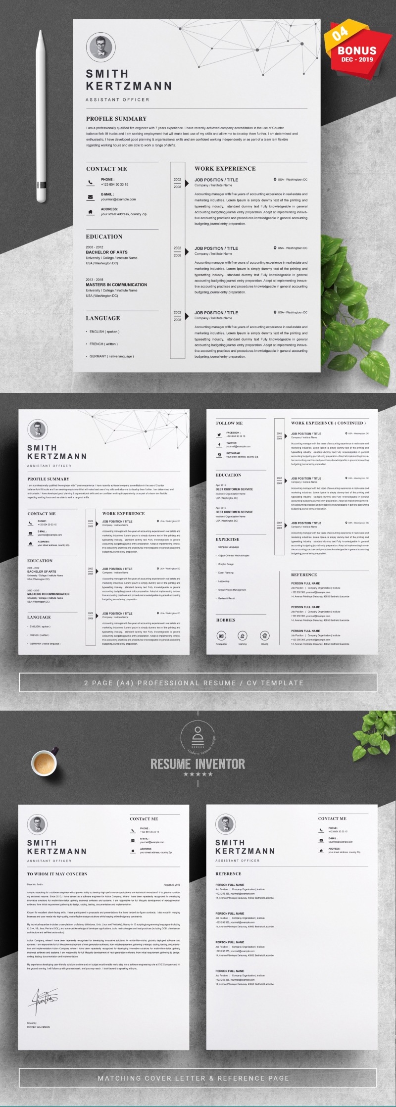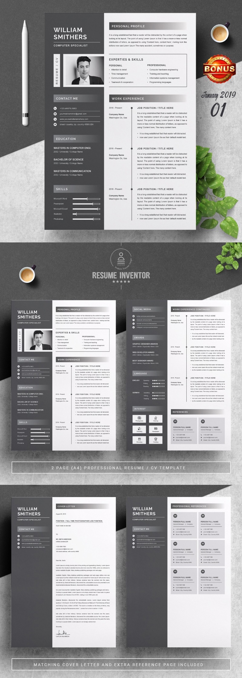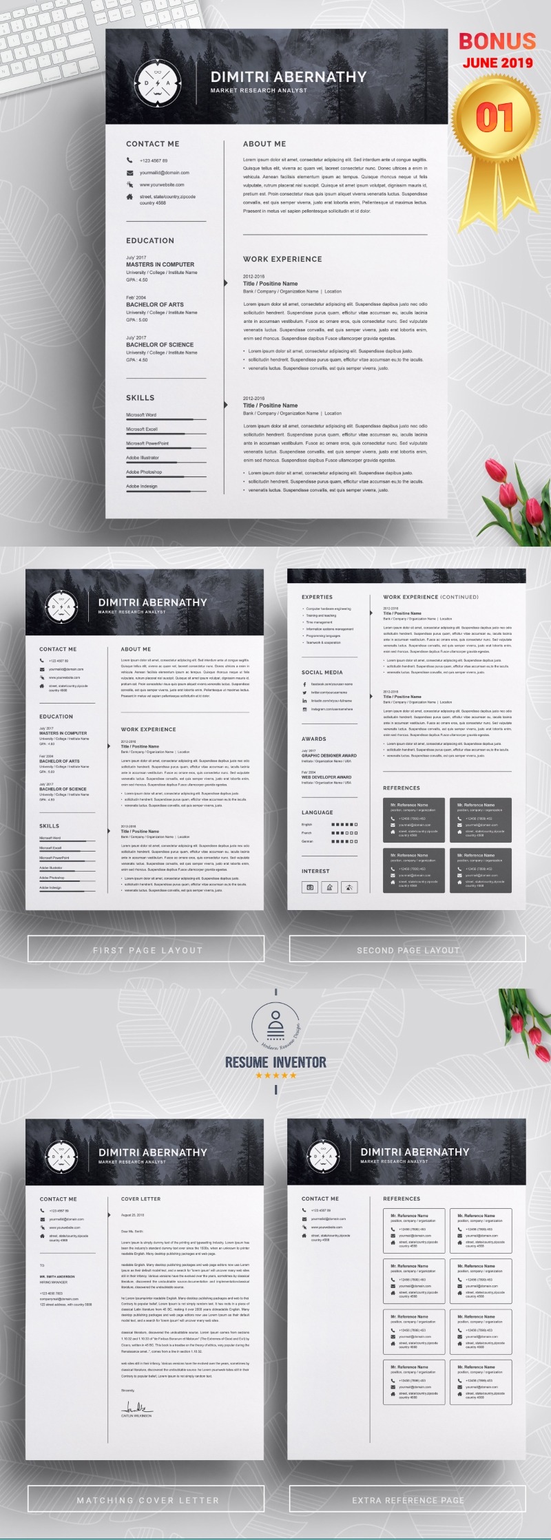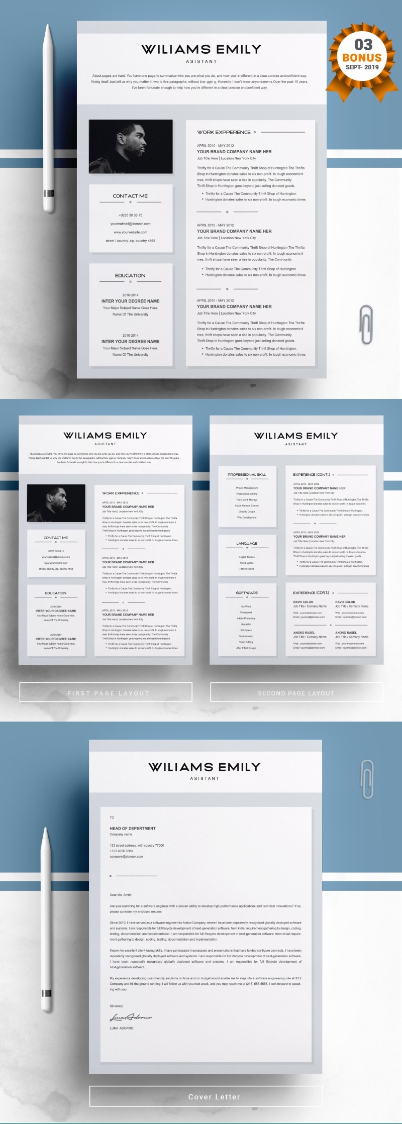Every template features 2-3 unique page layouts and includes a matching Cover Letter template, all delivered in Docx, Apple Pages, PSD & EPS file formats, fully editable & customizable to your liking, with links to the free fonts used on the dummy texts