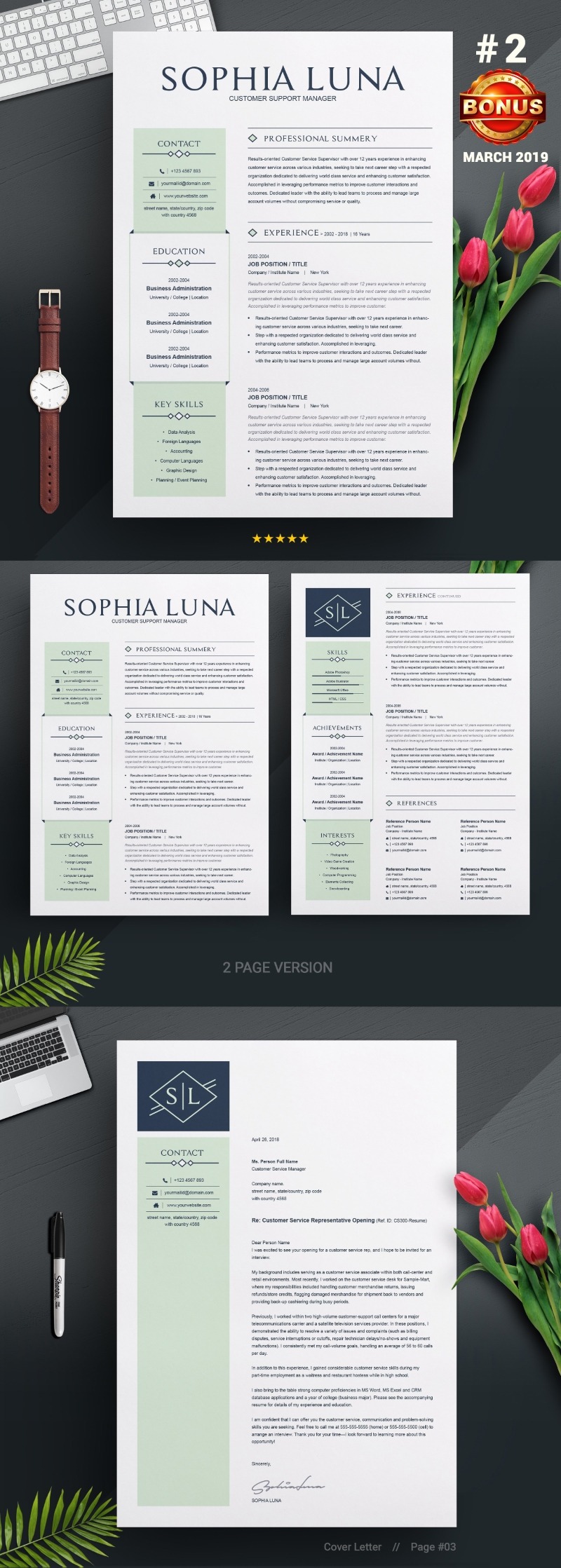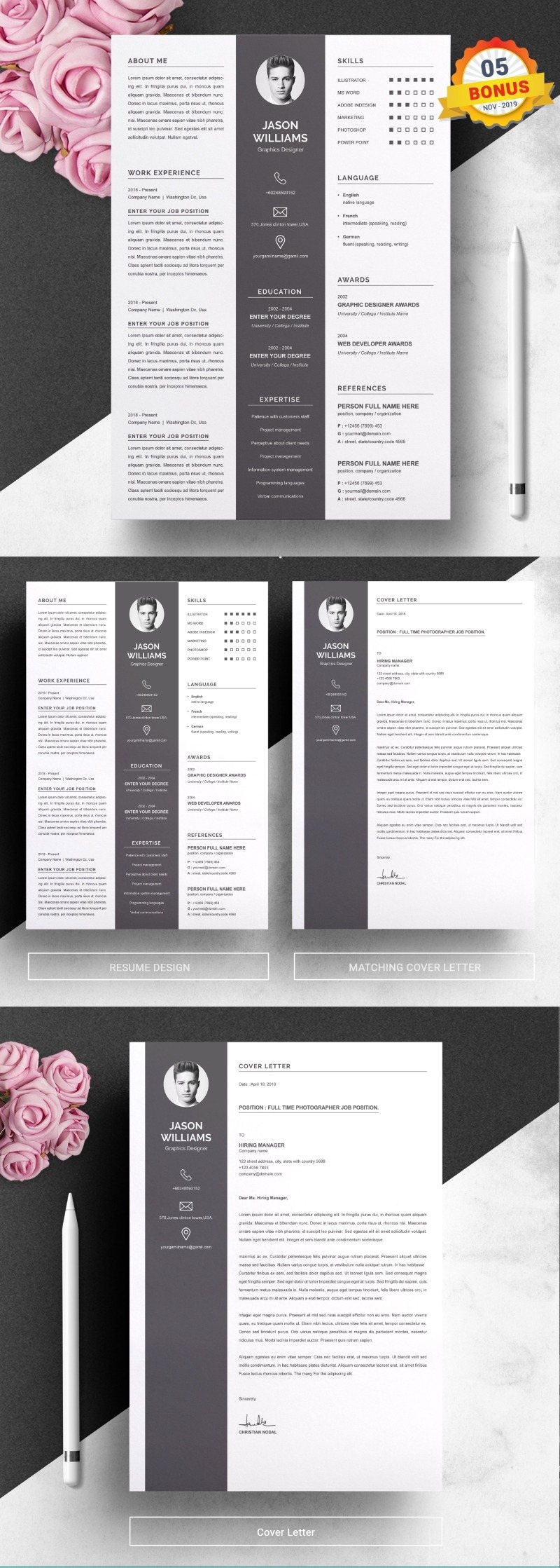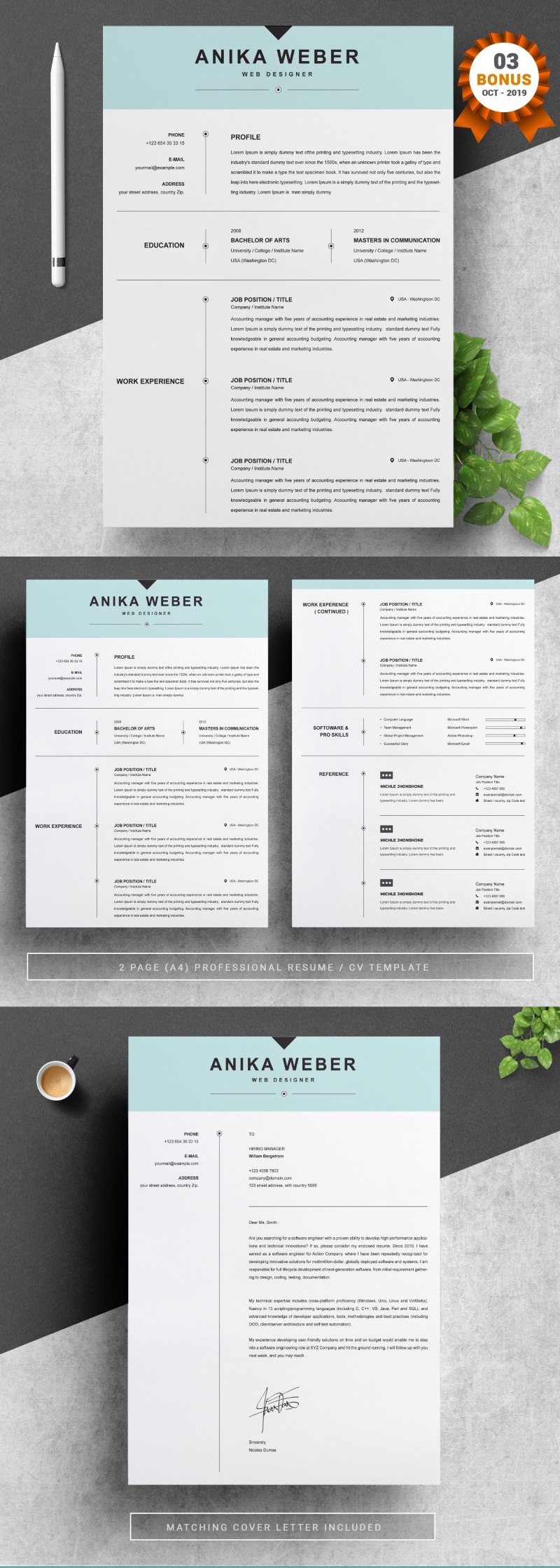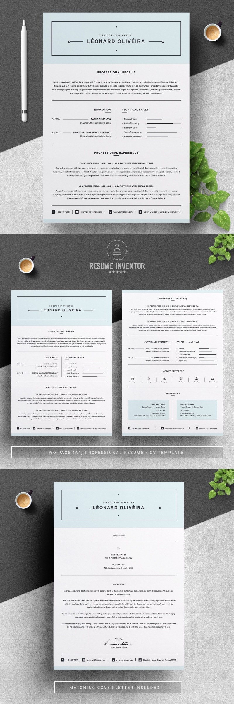 - Matching cover letter template for every CV template (can also use as a Thank You letter)