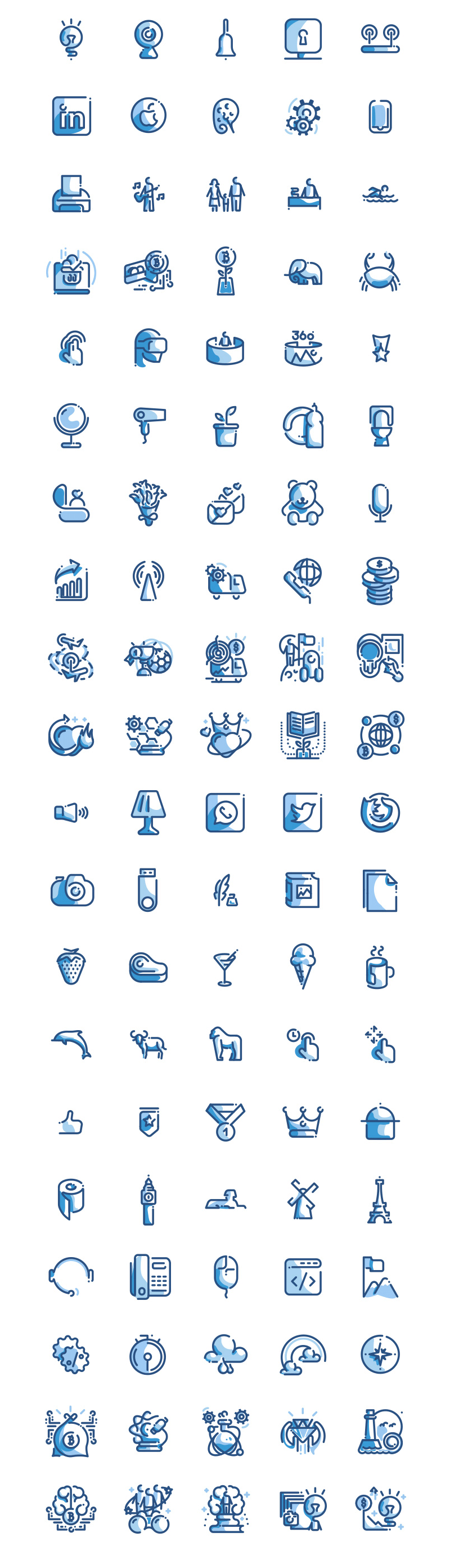 A pack of 100 vector icons with a line art style. The icons have a duo-tone color in shades of blue with accents that makes them complex and yet minimal. The pack includes the icons in Iconjar, EPS, PNG, SVG and AI file formats. Designed by Dribbble user Ramy Wafaa.
