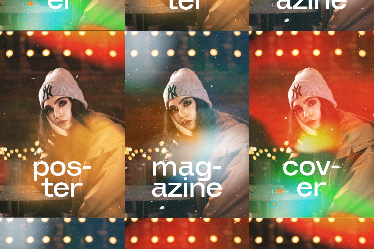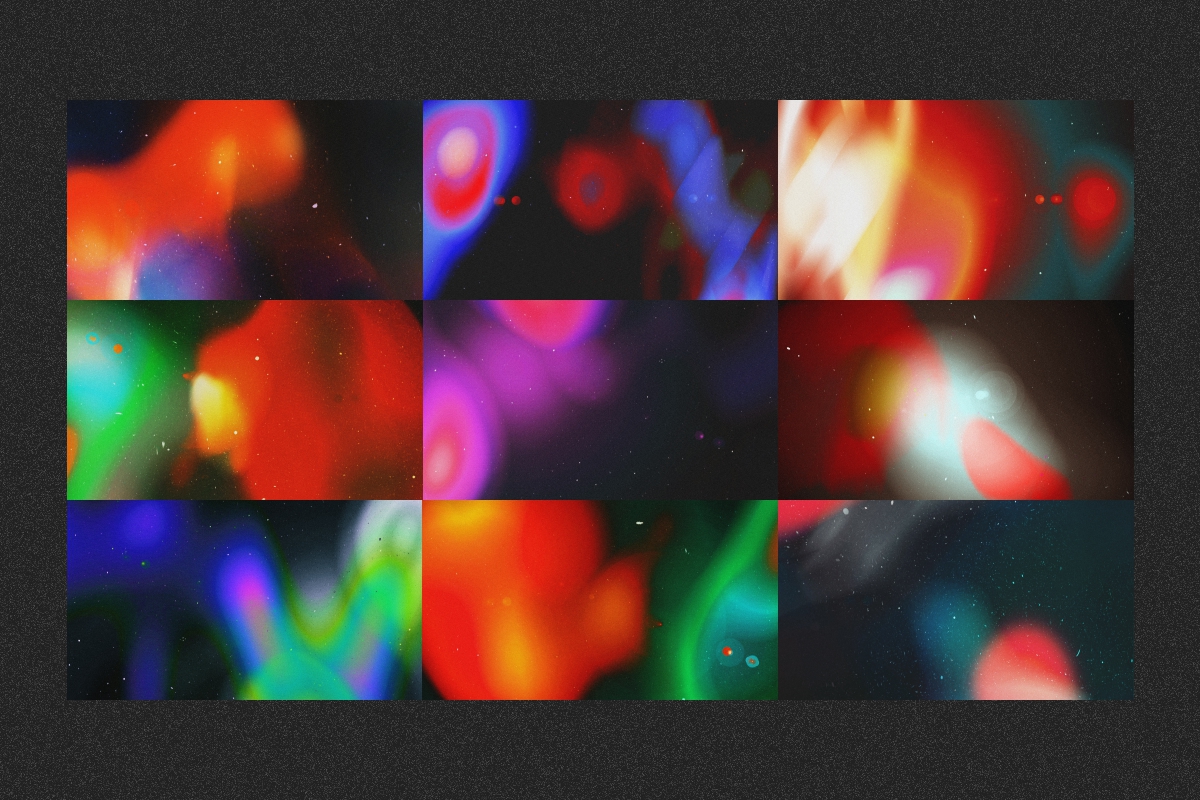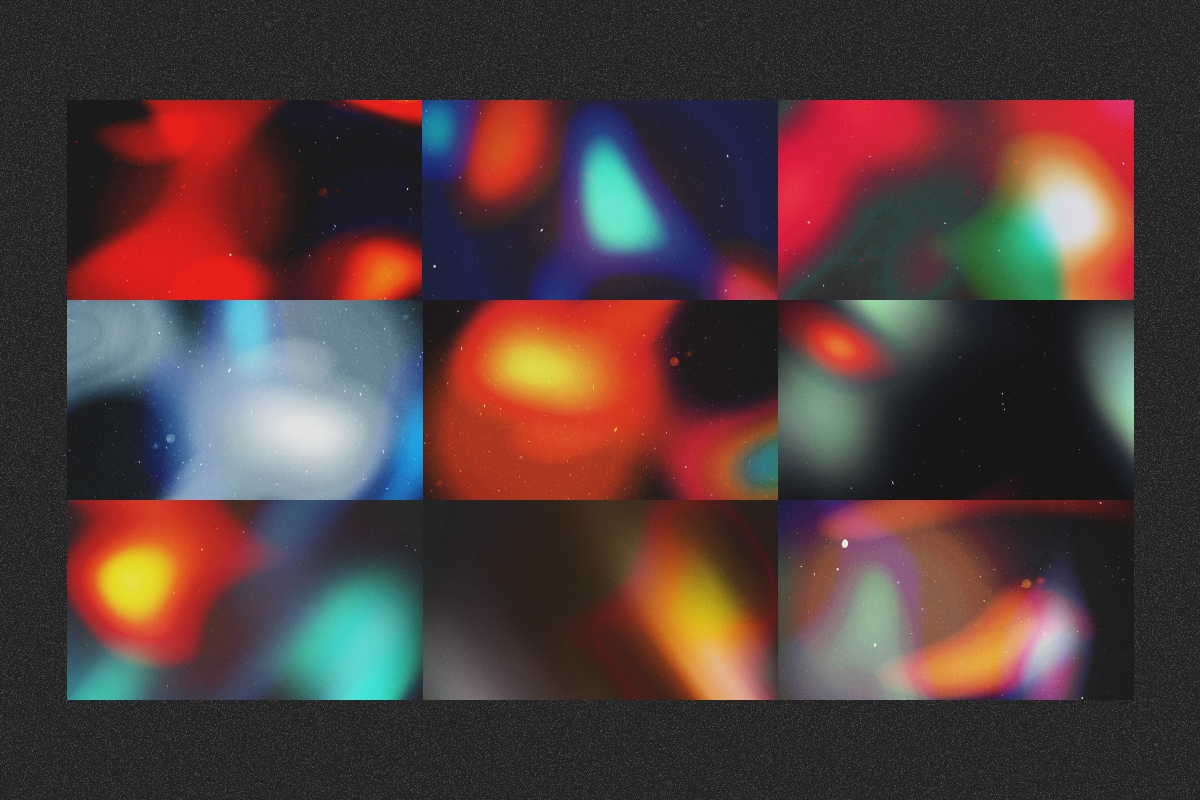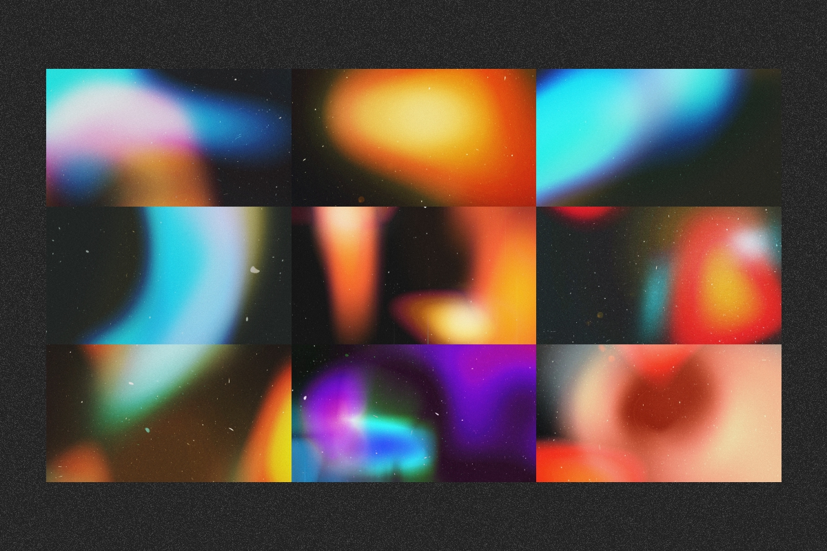 130 Light Leak Noisy Gradient Backgrounds; JPG File Format; Dimensions: 5760×3240 px; 300 DPI; Textured Finish
