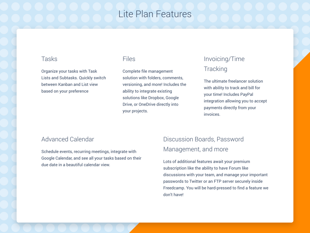 - Discussion Boards, Password Management, and more: Hundreds of additional features await your premium subscription like the ability to have Forum like discussions with your team, and manage your important passwords to Twitter or an FTP server securely inside Freedcamp. You will be hard-pressed to find a feature we don’t have!