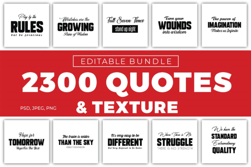 All the quote files are delivered in PSD file format, fully editable, with links to their respective fonts so you can tweak them as you need, and the textures pack delivers high resolution JPG files with dimensions ranging from 3000x2000px to 6000x4000px