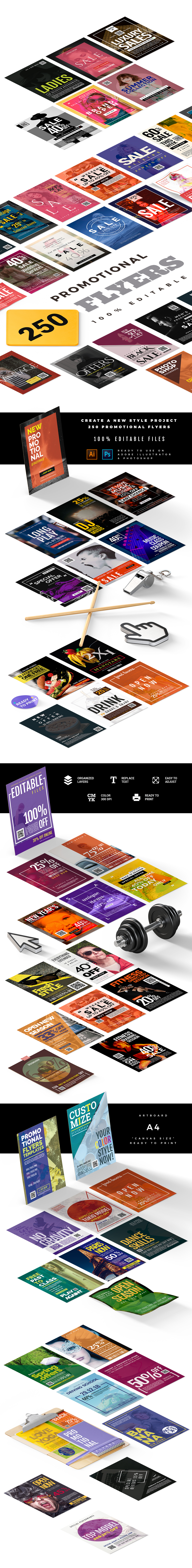 This pack contains 250 Promotional Flyer Templates created in Adobe Illustrator & Photoshop format, files are fully editable, scalable, & customizable to your specific needs. The bundle includes templates for several different commercial products and events like clothing stores, fashionists, sports, marketing, restaurants, concerts, lifestyles, travels, and everything else in between. Every Flyer features organized layers, dimensions 2480x3508px for digital files, as well as print size 8.3″x 11.7″ in 300 dpi.