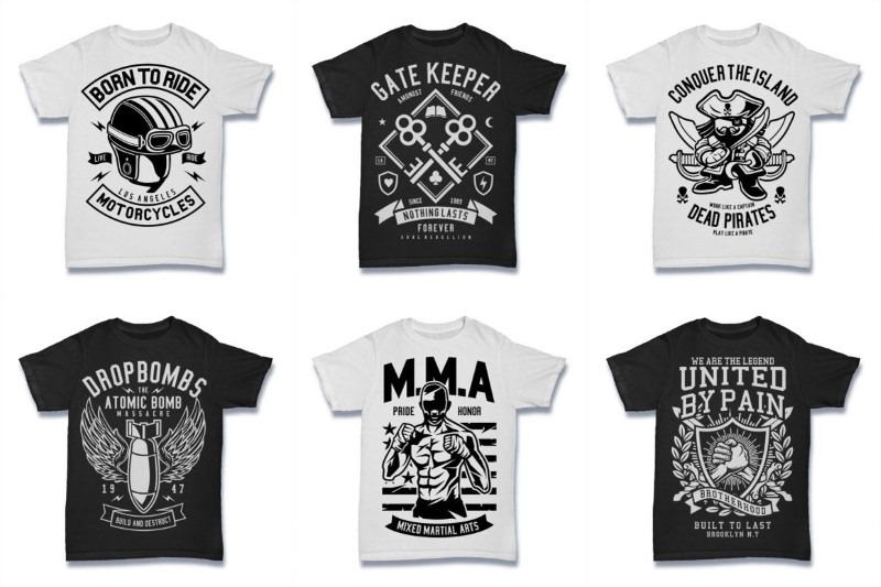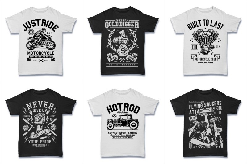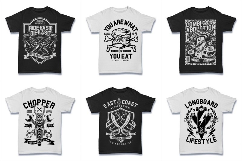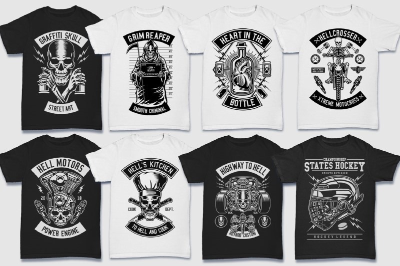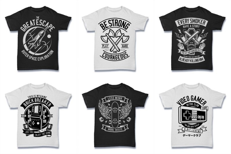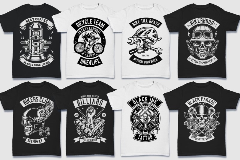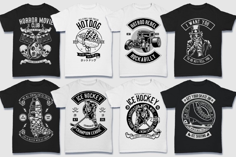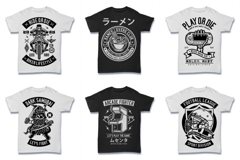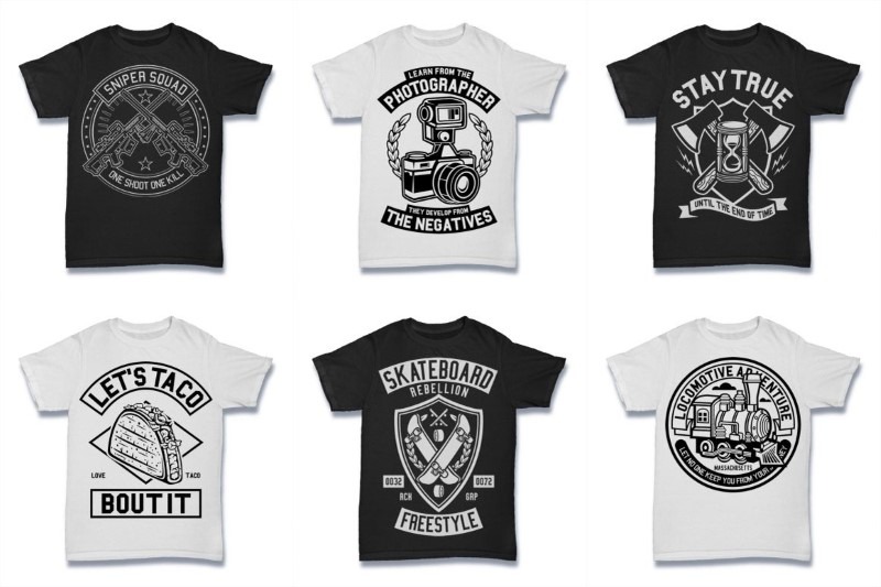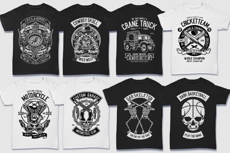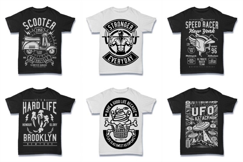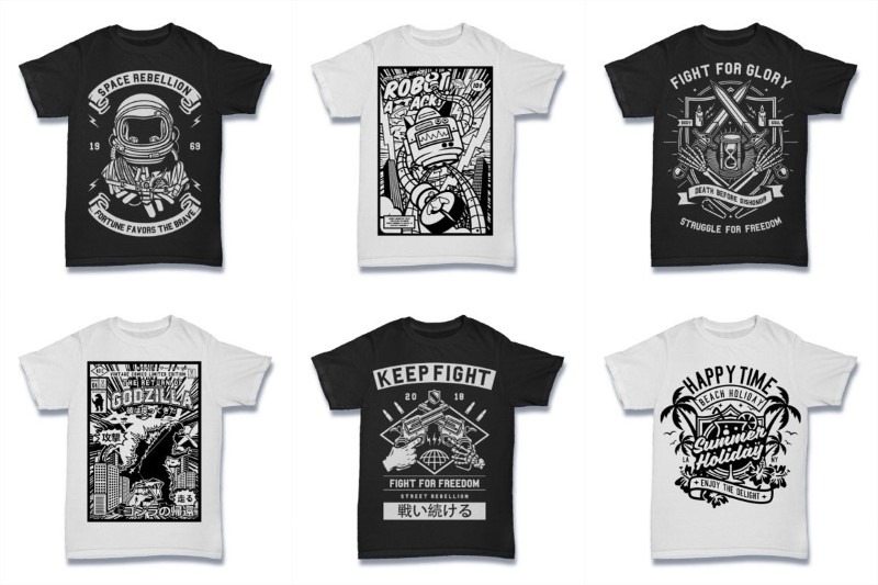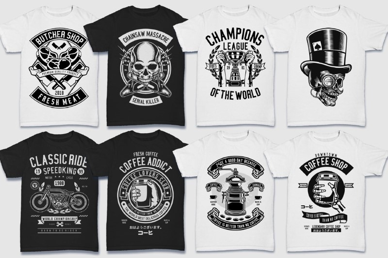 Huge pack of black & white tshirt designs featuring 300 unique illustrations delivered in a variety of vector formats for maximum compatibility