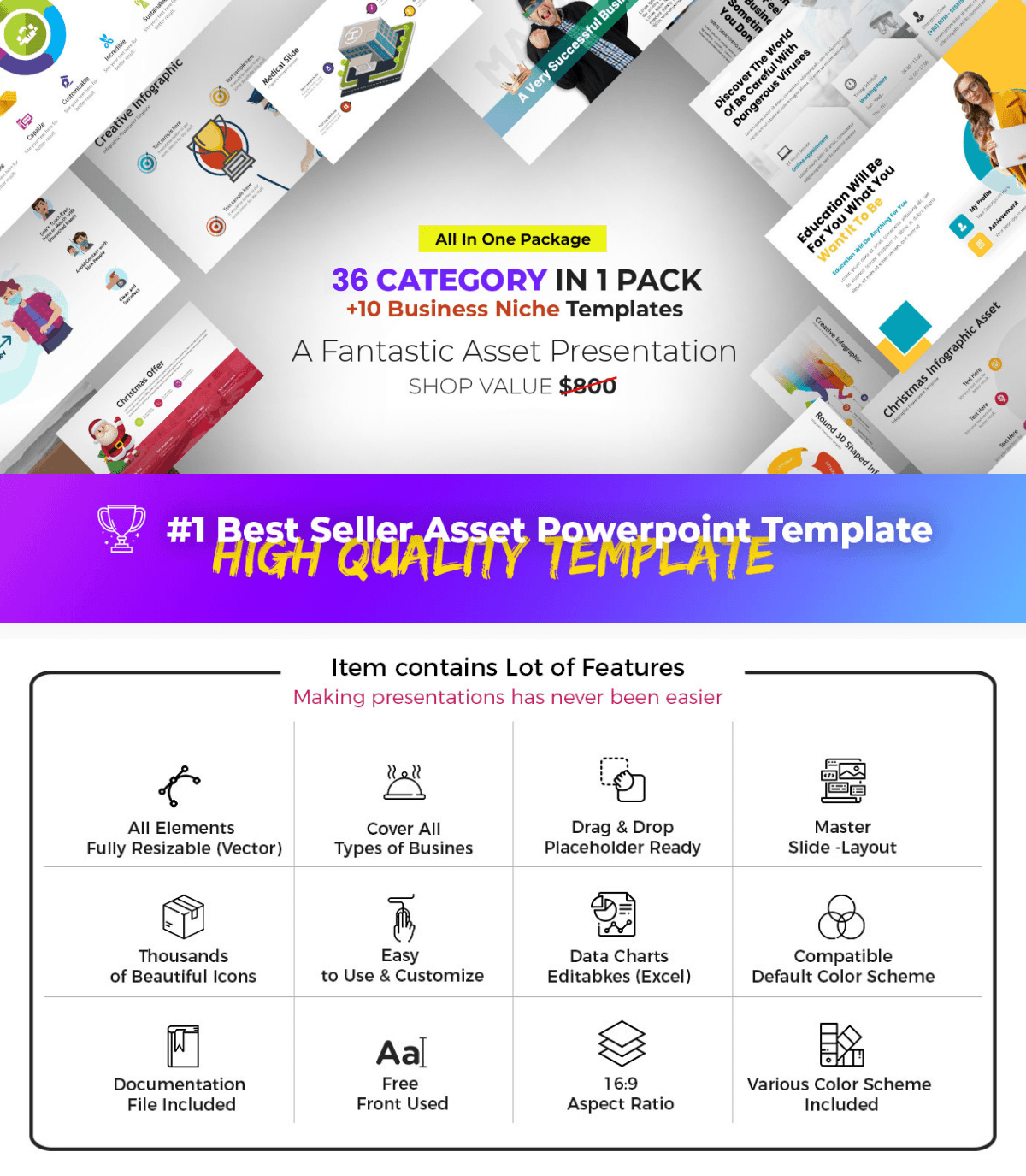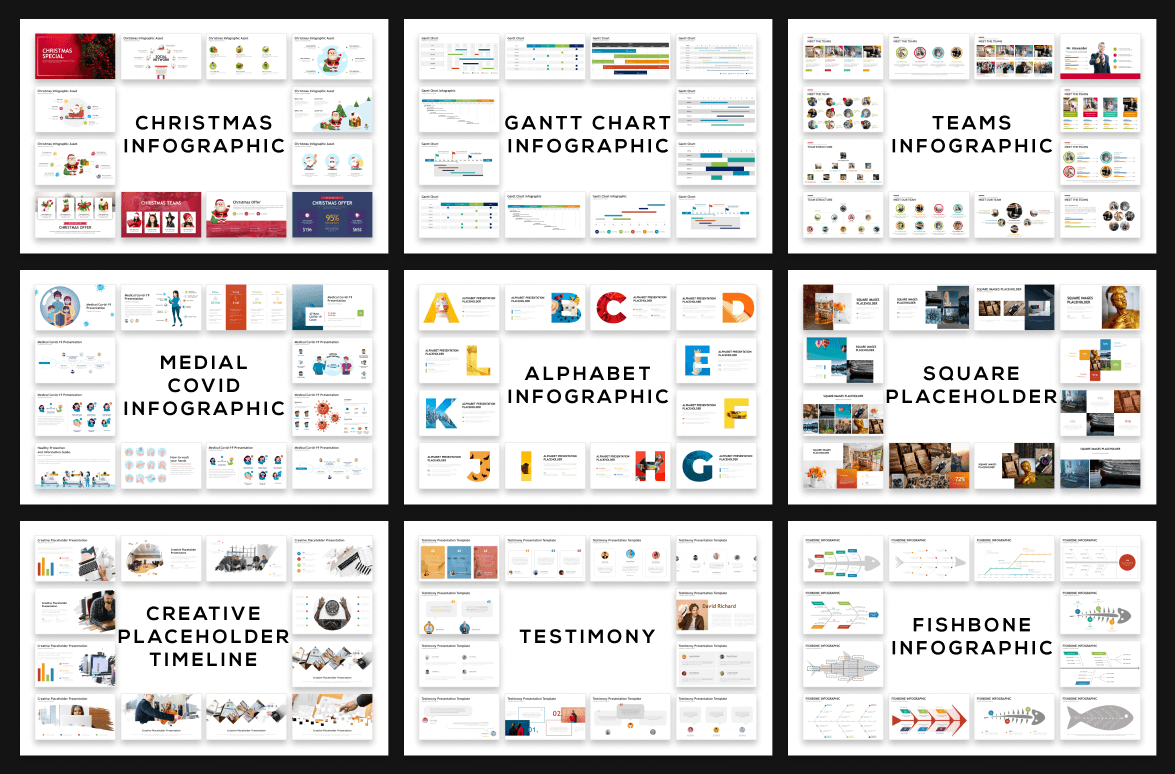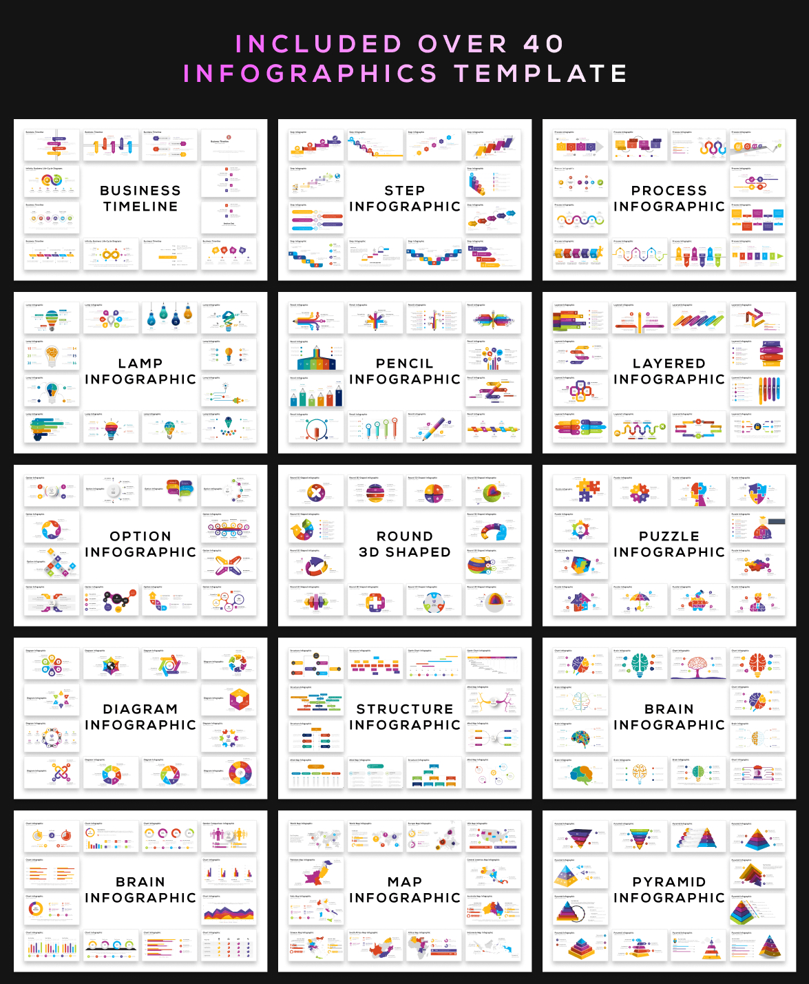 A massive bundle of infographic presentation templates featuring 46 templates, over 30.000+ total infographic slides with a huge variety of shape categories that you can use to create presentations for every occasion, from business to school, freelance, product presentations and more