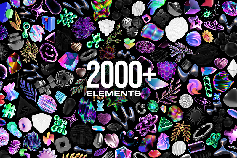 3D BUNDLE: 2,000+ Elements from 16 Collections; Holographic Geometry, Fluid Glass, Y2K, & More; High-Quality 3D Renders (PNG Files)