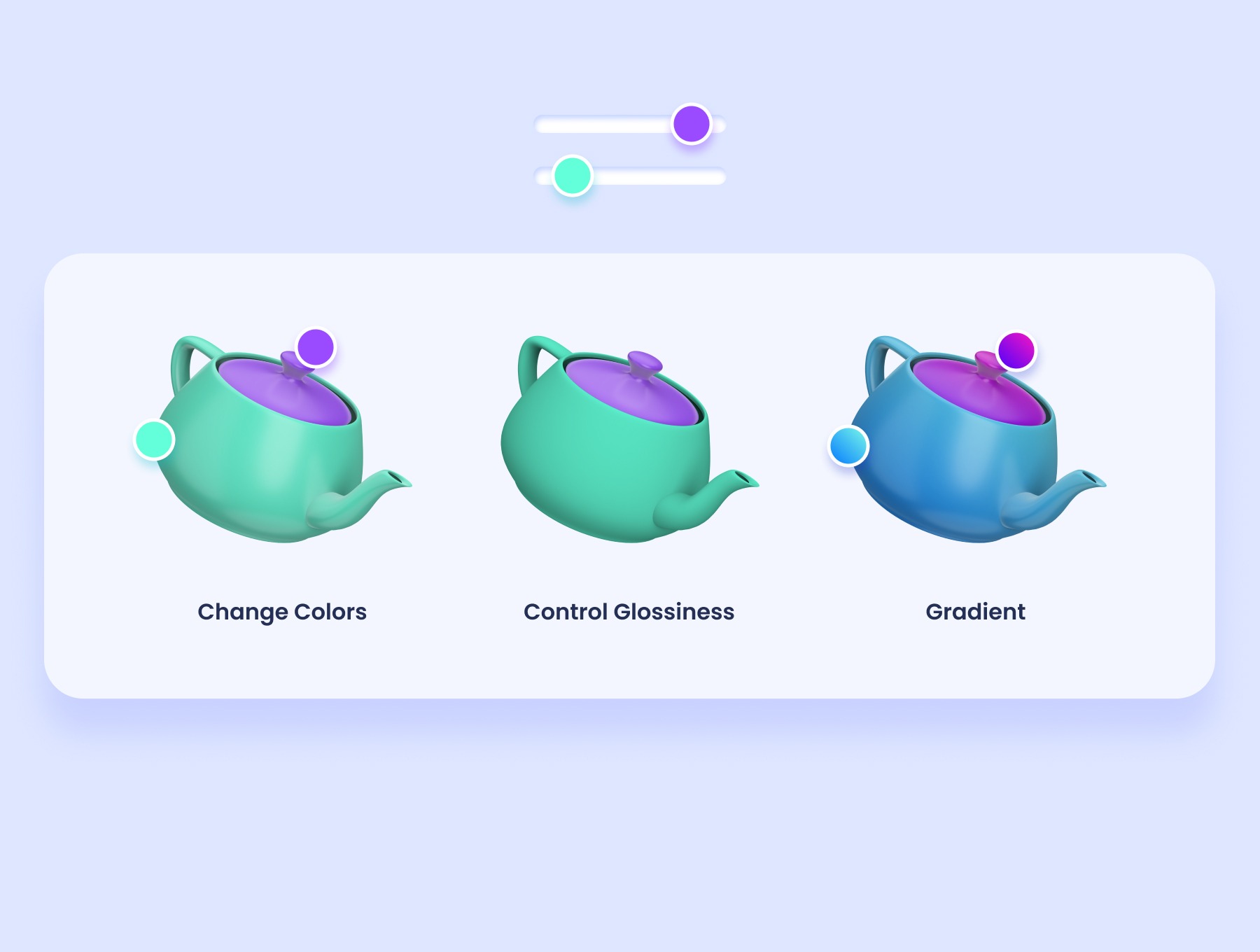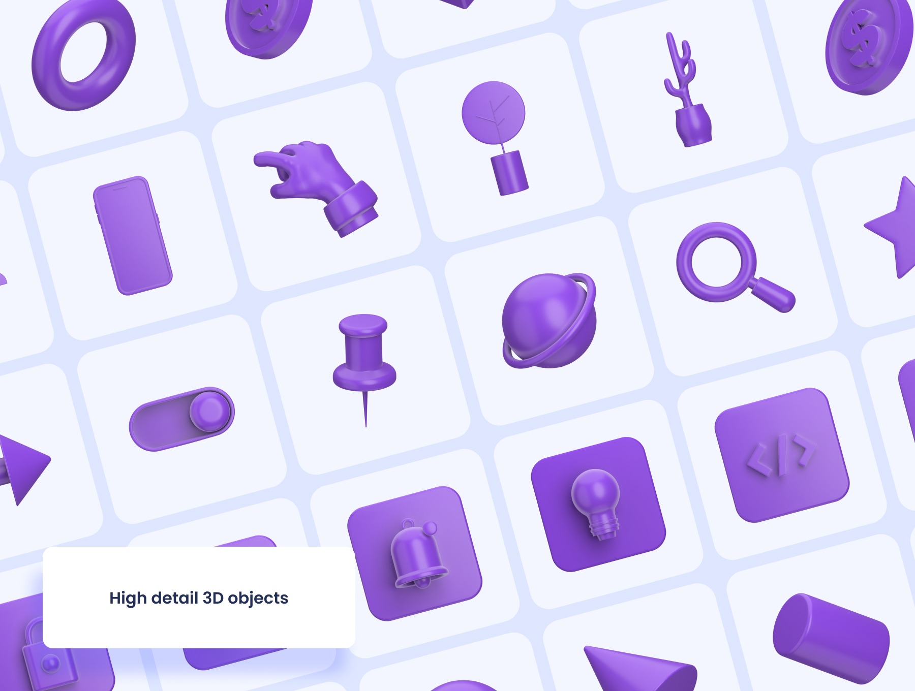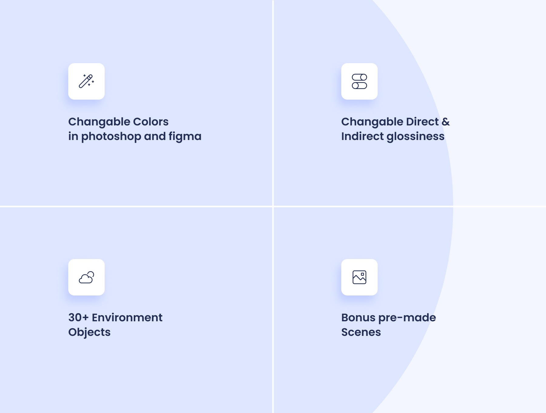 Every asset in this 3D illustrations builder is delivered in files for Figma, Blender & Photoshop, as well as transparent PNG files in high resolution – the files are fully editable & well organized layers, you can easily change colors & glossiness to create your compositions or use one of the premade scenes included in the set