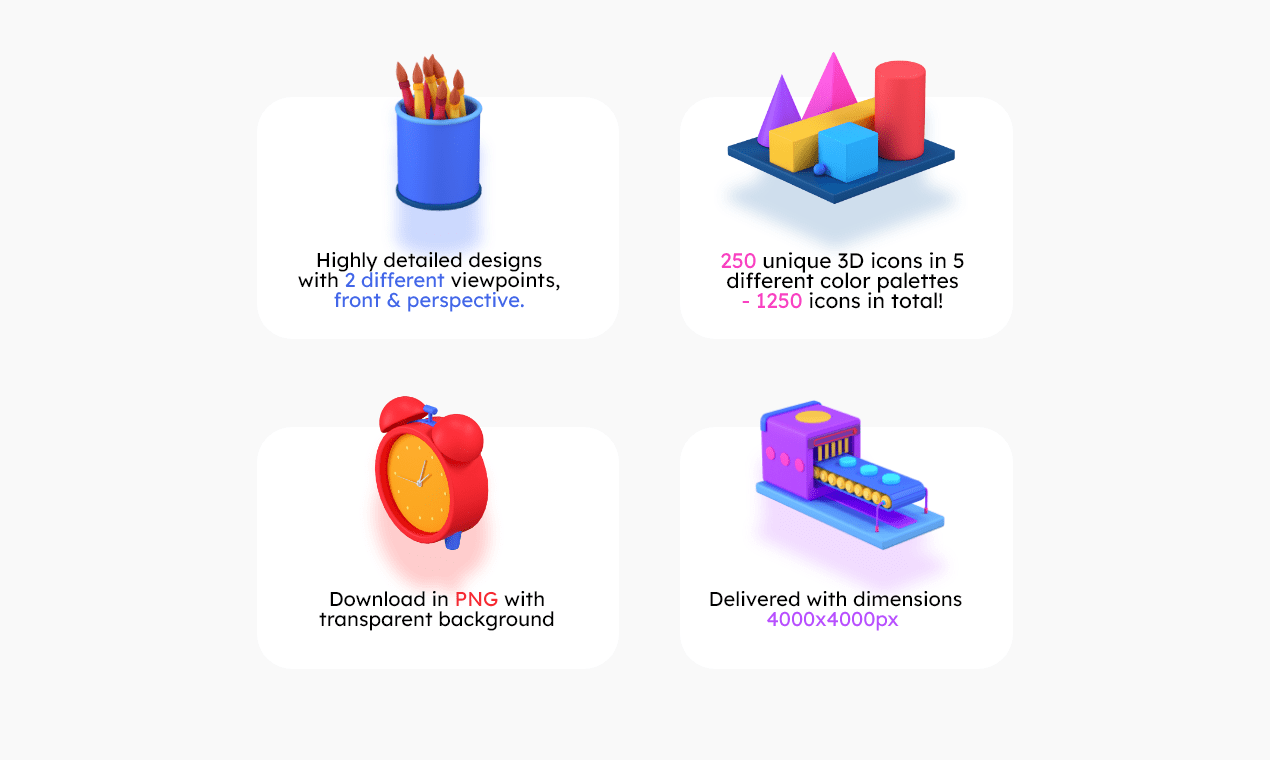 UPDATE 04/13/2021 – we’ve added a new collection with 70 new unique icons in 5 color palettes & 2 view points (front & perspective) over 650+ new icons added to the collection! (This set now features 1925 3D icons in total!)