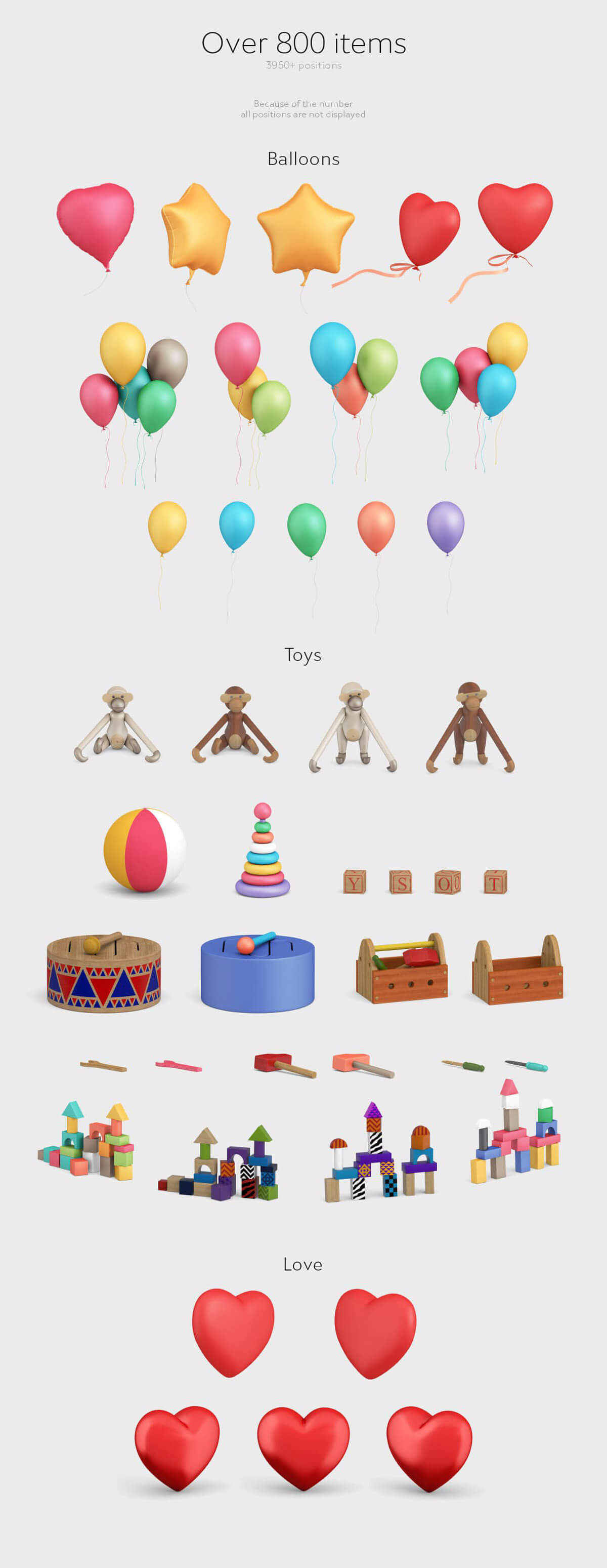 The package includes a scene creator with two views (top and front), logo mockups, print mockups, Apple device mockups including iPads and Apple Watches, iMacs, iPhones, accessories, and thousands of objects from different categories, such as electronics, plants and flowers, gadgets, office supplies, food, miscellaneous accessories, instruments, different perfumes and cosmetic containers, christmas ornaments, shoes, accessories, art supplies, packaging, tags, party stuff, decorations, toys, furniture, alphabet and numbers, cars, ad displays, and more.