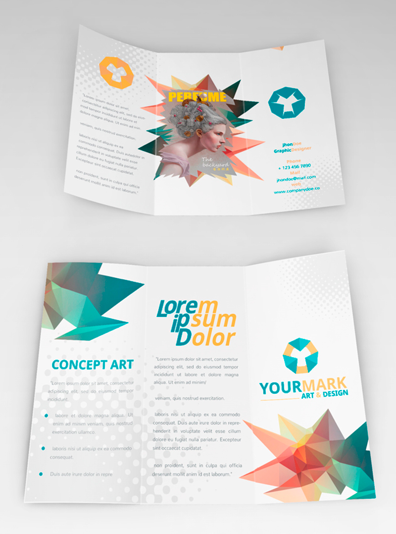 A trifold that comes in 3 formats: PSD, AI, and INDD. With a decoration alluding to 3D designs and illustrations, this template is perfect for graphic presentations and idealistic expositions, also due to its information-focused crafting.