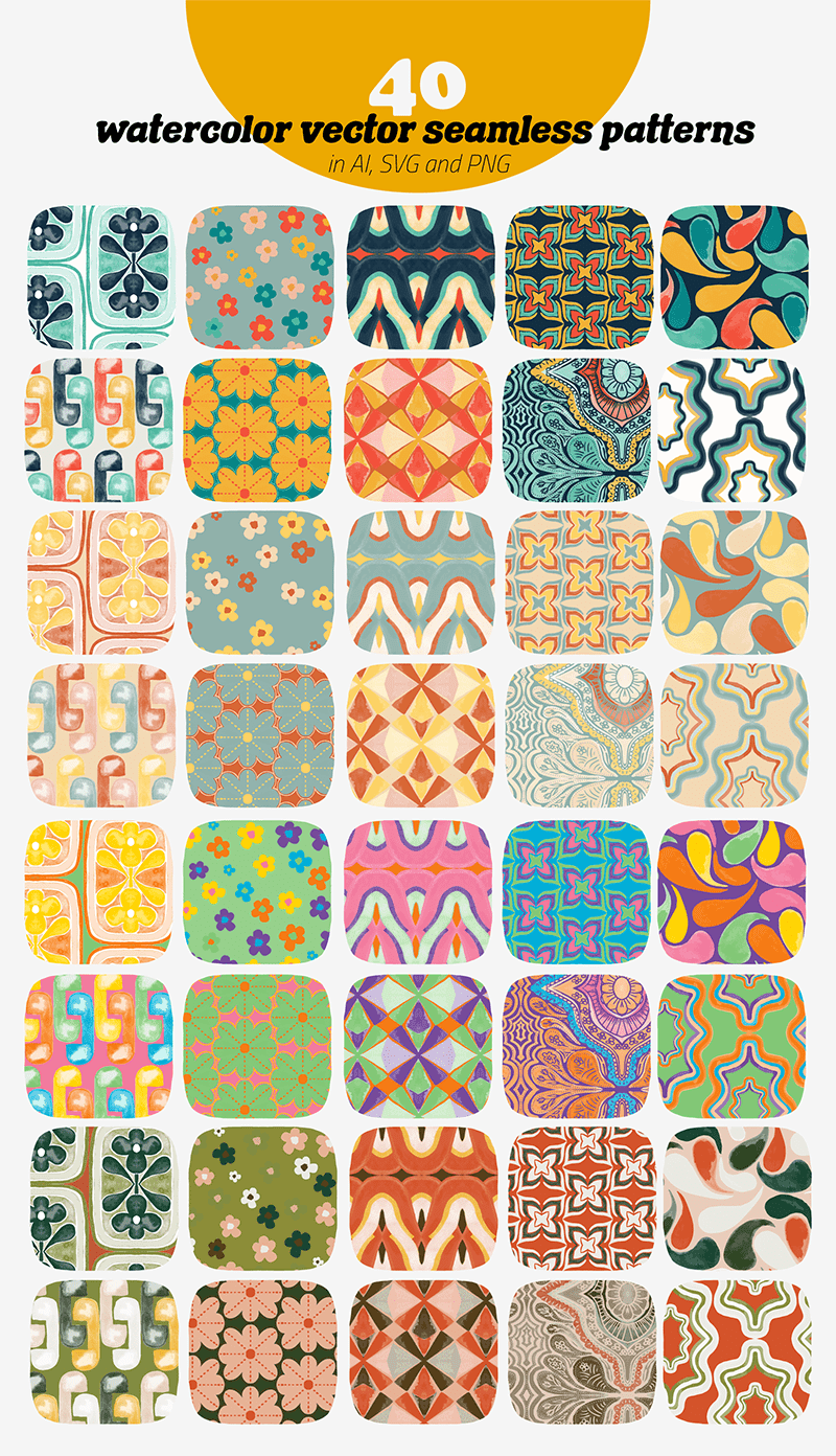 - 202 vector patterns (in AI, SVG and PNG format)
