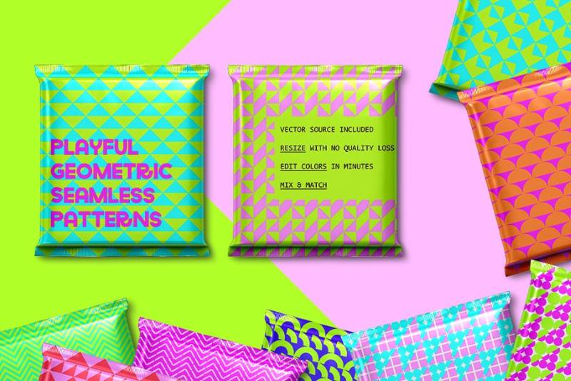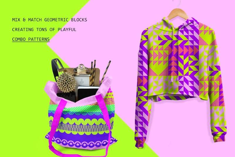 A big bundle of colorful geometric vector shapes & seamless patterns featuring blocks with tons of different designs & colors, delivered in Ai, EPS & PSD file formats as well as PAT patterns & high resolution transparent PNG files
