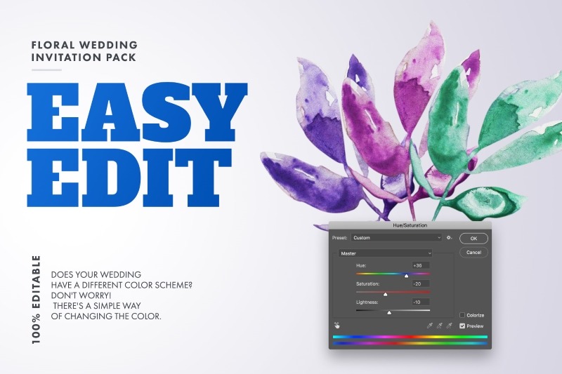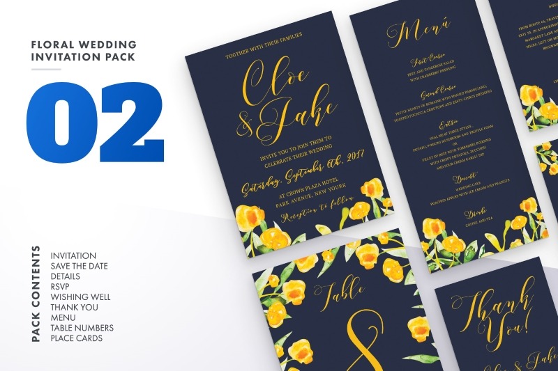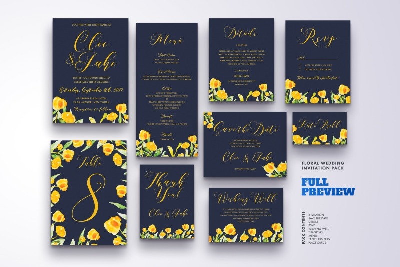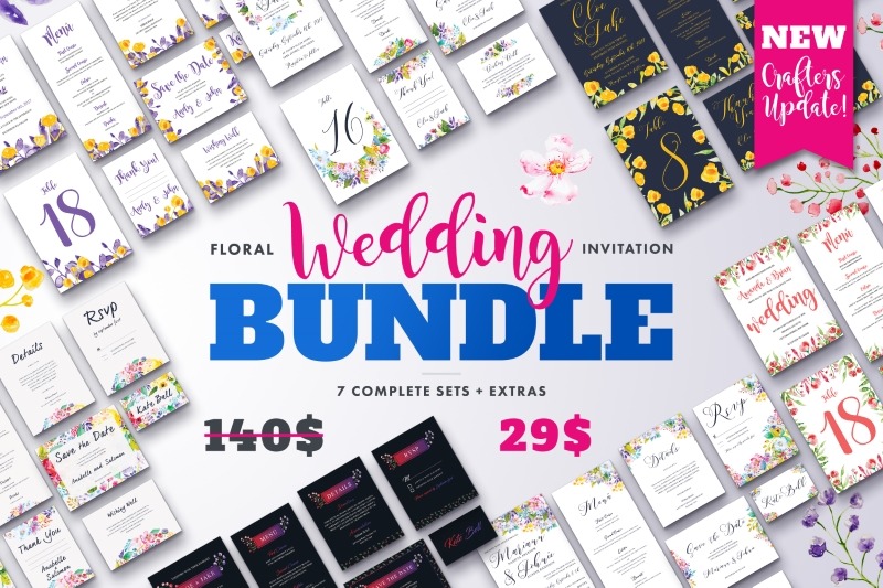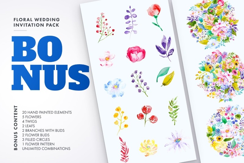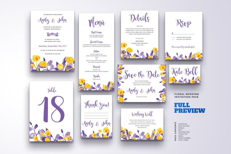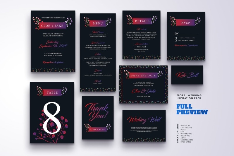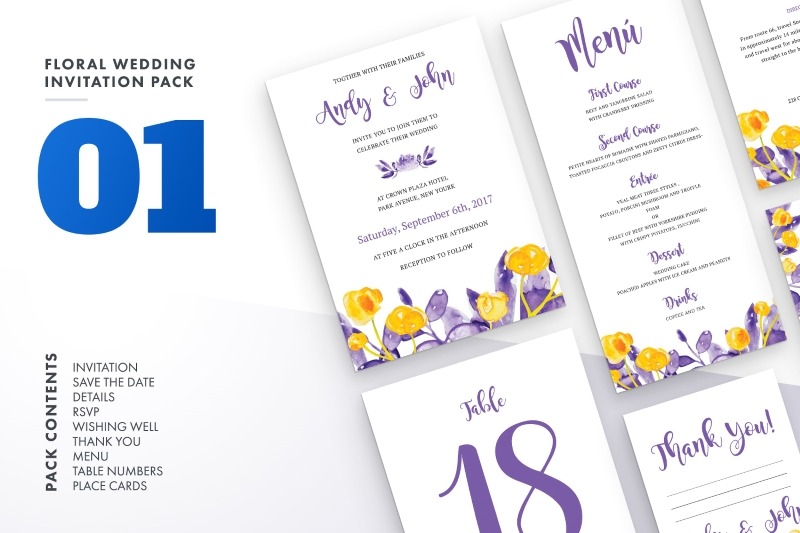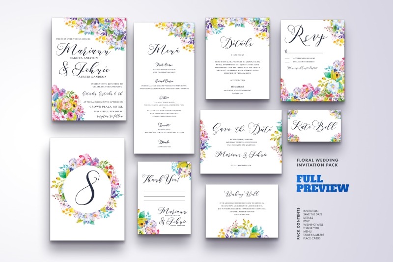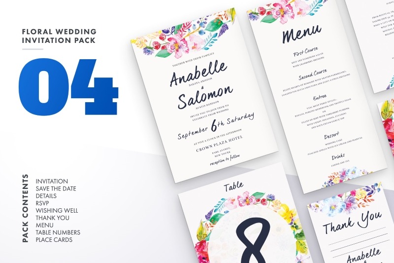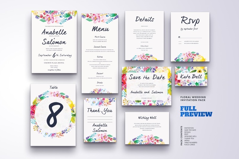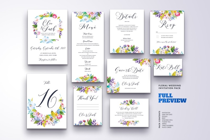 This design pack delivers a collection of 60+ floral wedding templates divided in 7 different sets as well as 28 isolated watercolor flowers & flower circles – the collection contains premade templates for wedding invitations, detail cards, menus, RSVP, Place Card, Thank You Cards, Save the Date & several others!