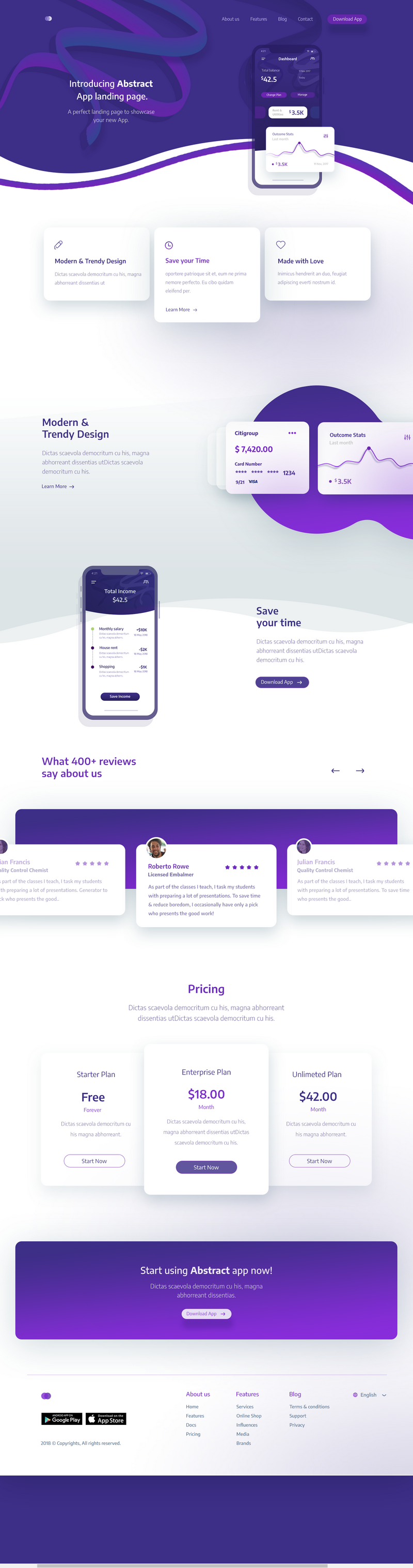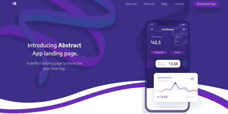 This is a layered landing page perfect to feature your new app. It makes an smart use of gradients over shapes and backgrounds, all encased in a flat material style. Designed by Mostafa Hisham.