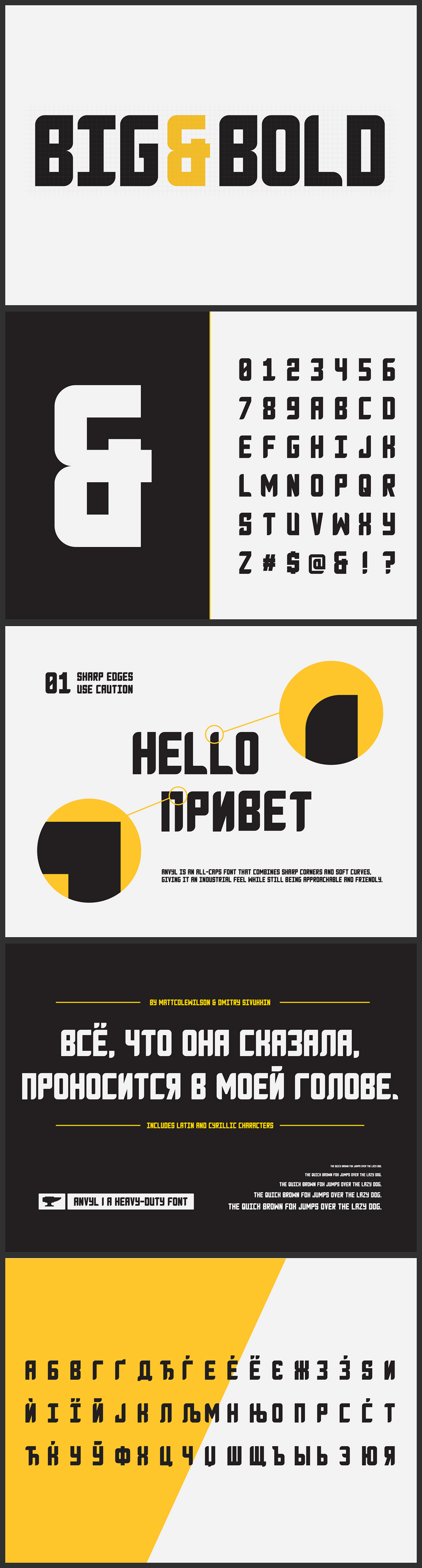 Anvyl is a typeface that blends soft curves with sharp edges, and somehow makes it work, an this approach gives it a great looking industrial sort of style. Great for display purposes, logos, etc. It features Latin and Cyrillic characters, numerals 0 to 9, basic punctuation, and a total of 213 glyphs. Collaborative work by Behance users Matt Cole Wilson and Dmitry Sivukhin.