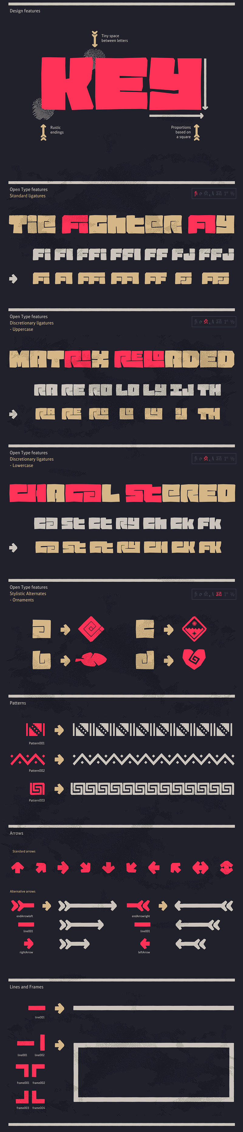 Pacha is a one of a kind display typeface inspired by ancient Latin American cultures counting on unicase characters that look like a solid block when writing, it comes along with a full set of ligatures, ornaments, patterns, arrows, and frames.