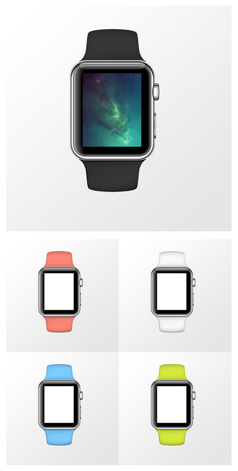 A set of Apple Watches in its Sport version to customize your designs or to use it alone as a mockup. It is available in 5 colors and it includes vector shapes for easy edition, as well as a smart object to allow you the addition of your own design. The image resolution is 1200x1200px and it’s fully layered.