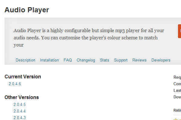 Audio Player is a highly configurable but simple mp3 player for all your audio needs.Features include:configurable colour scheme to match your blog themevolume controlright-to-left layout switch for Arabic and Hebrew language sitesmany options such as autostart and loopID3 tag support (custom track info also available)