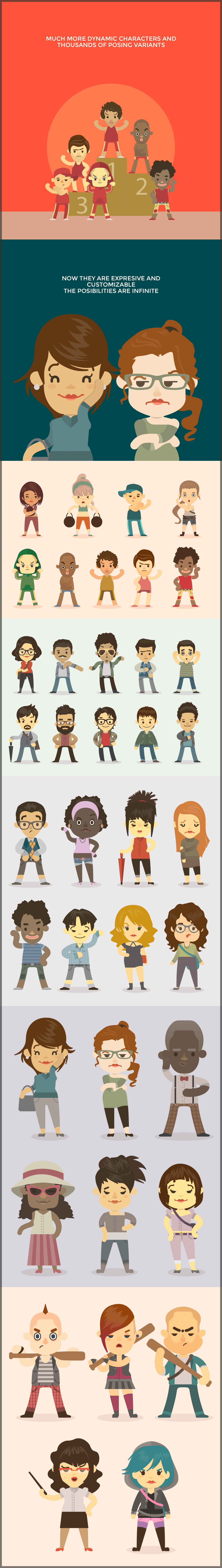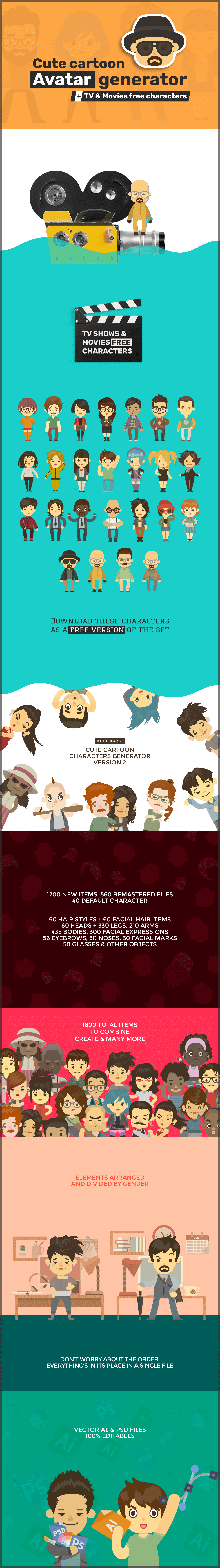 A huge collection with over 1800 unique vector elements for Adobe Illustrator and Photoshop that you can combine to compose beautiful cartoon avatars and characters! With this massive collection you’ll be able to create customized vector cartoons from scratch through drag & drop simplicity – make female and male characters with their own unique personalities, from all ethnicities, with this diverse collection of elements, perfect for designers working on branding, company avatars, animations, printable & digital banners and more