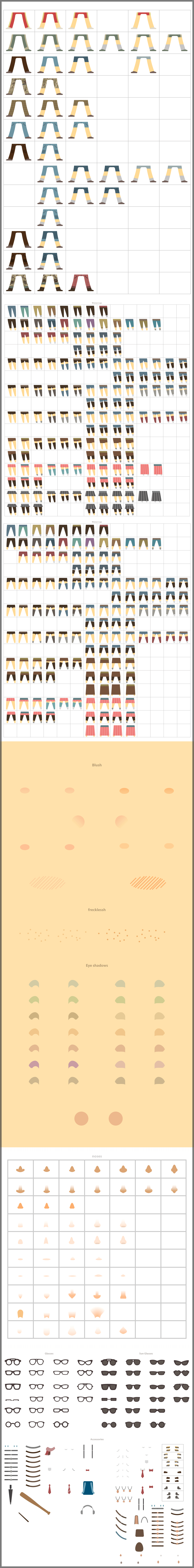 You’ll get access to a massive variety of elements including outfits, cosmetics & articles, hairstyles, facial and body accessories, facial components like expressions, eye shapes, eyebrows, mouths, noses, body components in different postures like arms and legs, different effects like blushes and freckles, eyeshadows, different shoes and eyewear, belts, backpacks, pants, skirts, beards & everything else in between! Near endless combinations that you can mix & match in different postures with the ability to give them their own unique facial expressions and personalities!