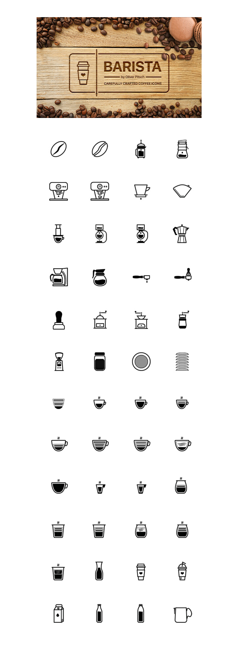 A fantastic set of 50 carefully crafted vector icons featuring tools, grains, and all the stuff needed to experience the best atmosphere around coffee, dedicated to all baristas and coffee lovers.