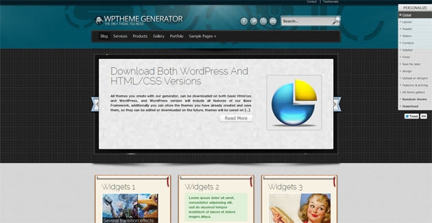 WordPress Theme Generator is an intuitive and pretty easy to use tool. The first advantage this tool has is that its homepage is a demo that anyone can test without having to sign up; there are dozens of default themes with several styles to modify, which makes easier for a visitor to create a great theme by improving a pre-designed theme rather than making one from scratch; the home page behaves as a playground, interface is user friendly and within the personalize menu in the right hand side are all the options we can use to modify our themes; you won’t need to have any coding skills to create your own theme.