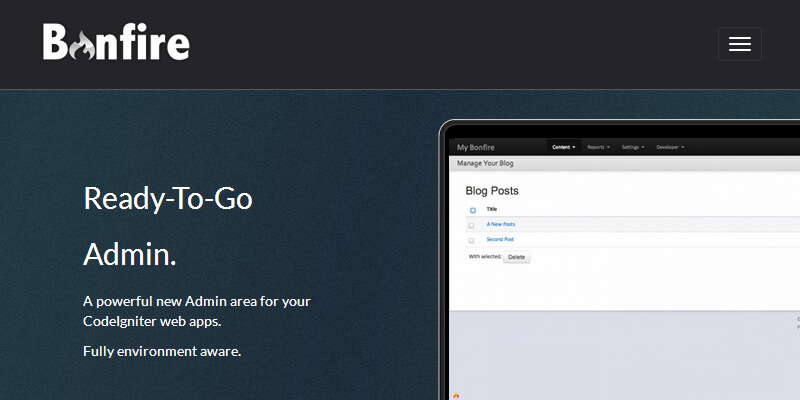 Bonfire helps you build CodeIgniter-based PHP web applications even faster than ever by providing powerful tools and a beautiful interface you won’t be ashamed to show your client. With it you have built in users, enhanced debugging and a significant set of developer tools.
