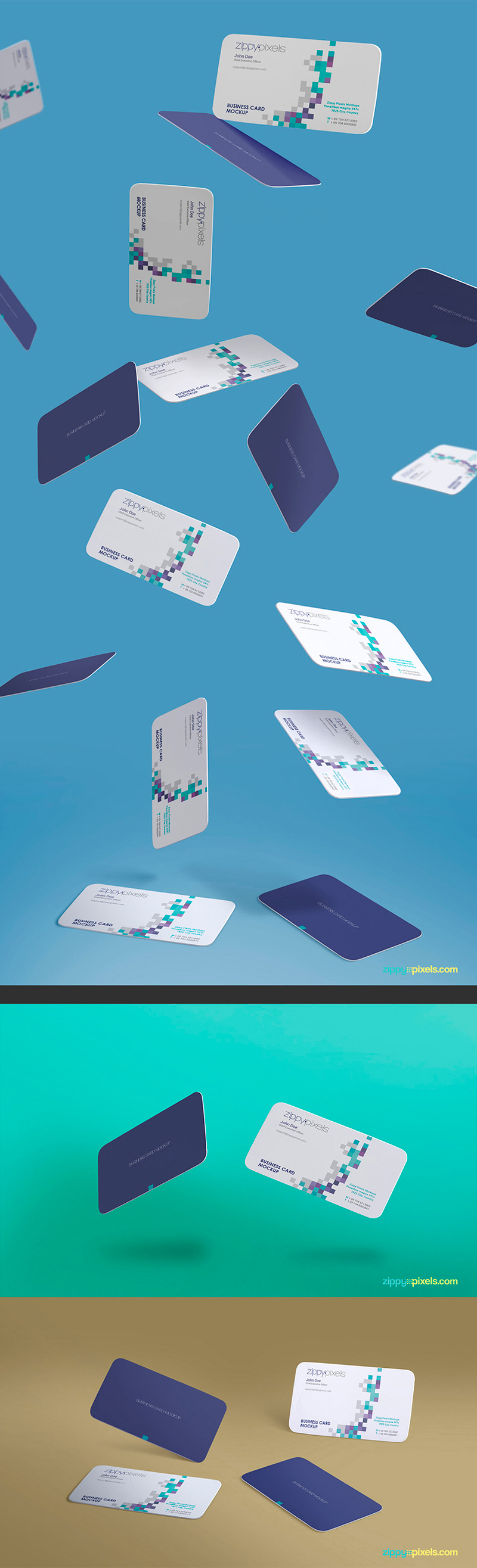 A mockup in PSD featuring beautifully crafted business cards using smart objects, in 16 individual views, where you can add your own designs either back or front, along with infinite arrangement options available as well.