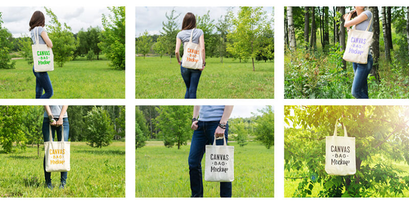 A set that contains 8 different PSD mockups, you can change the bag color and the model’s shirt color. High resolution of 4500x3000px and well-organized layers for an easy and fast edition through smart objects. The file weighs 165 MBs.
