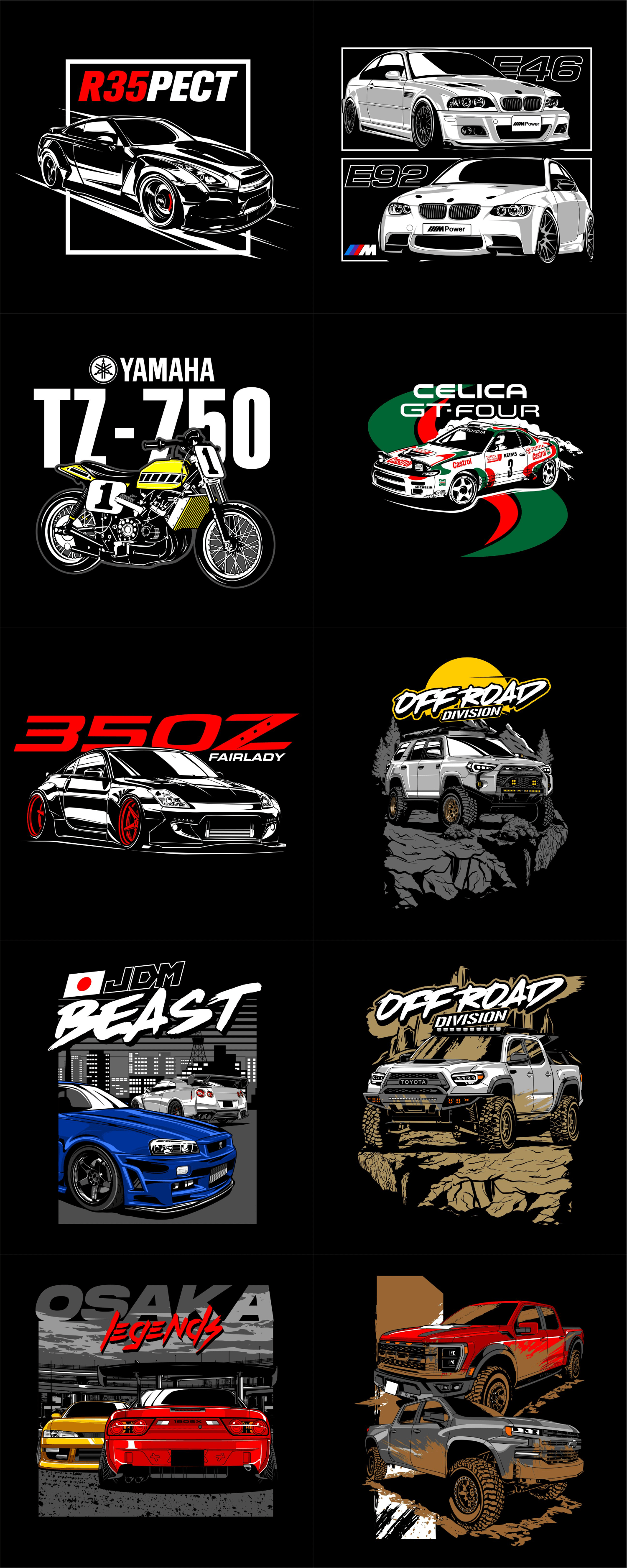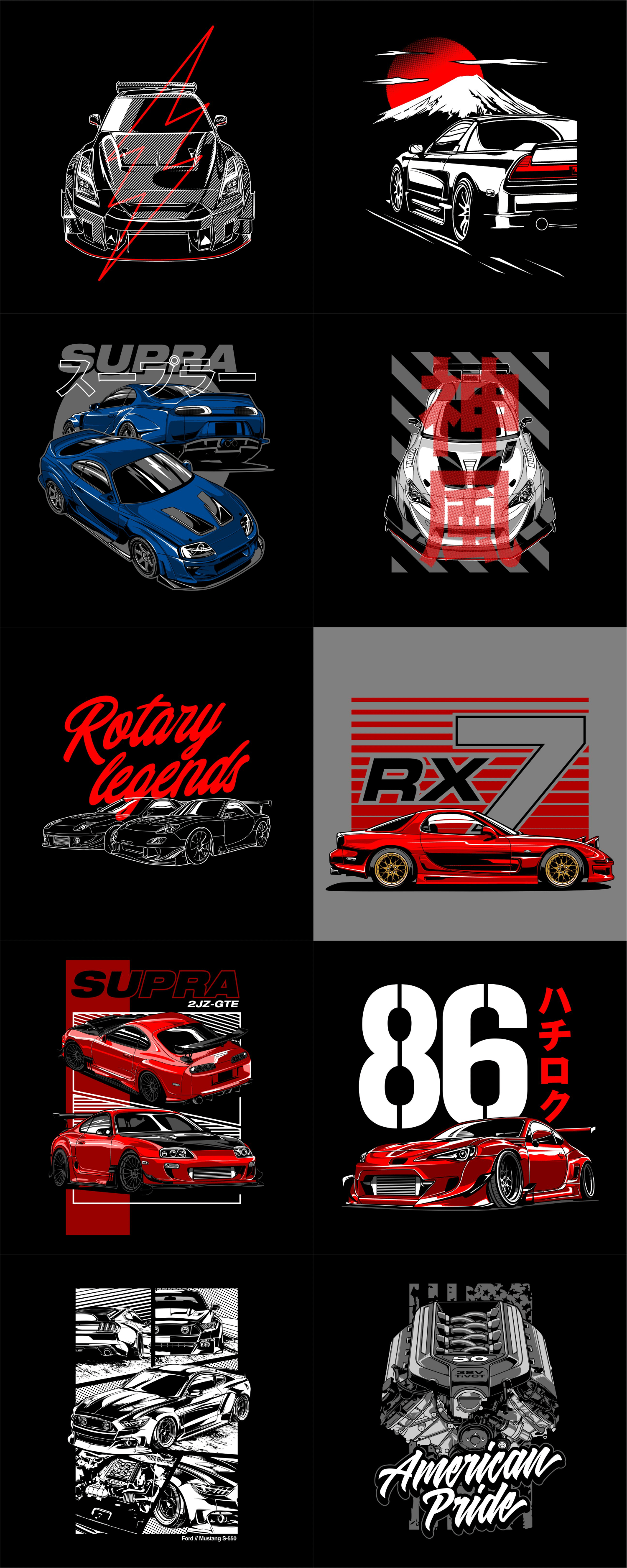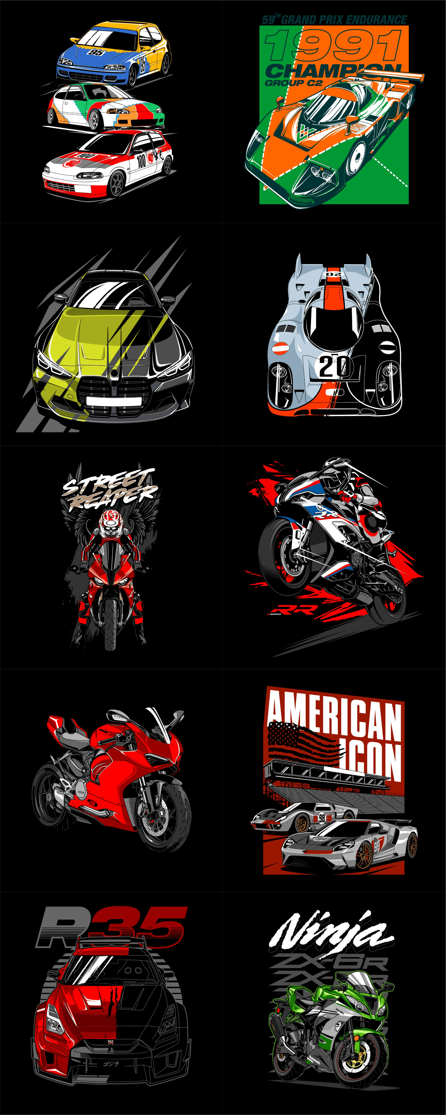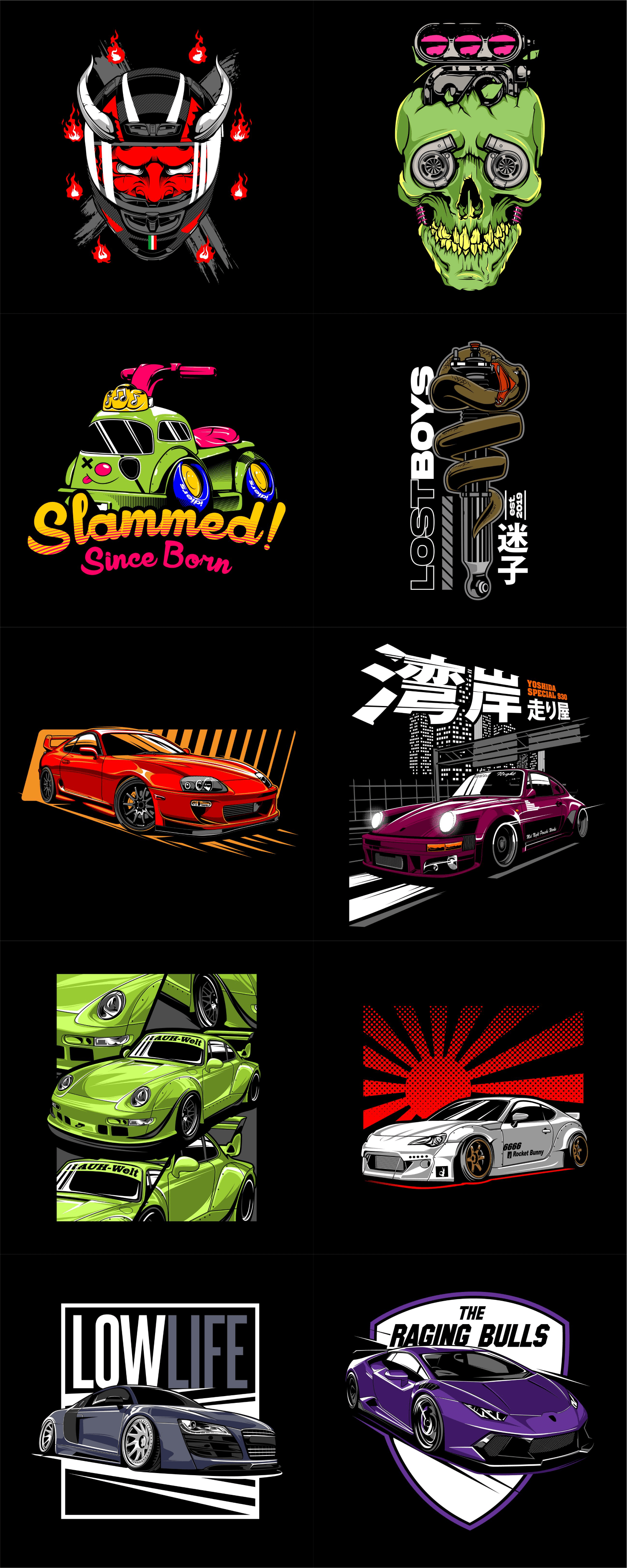 A new t-shirt designs pack featuring a collection of 100 illustrations with racing themes, cars, quotes & street designs, delivered with fully editable vectors as well as print ready versions of every design