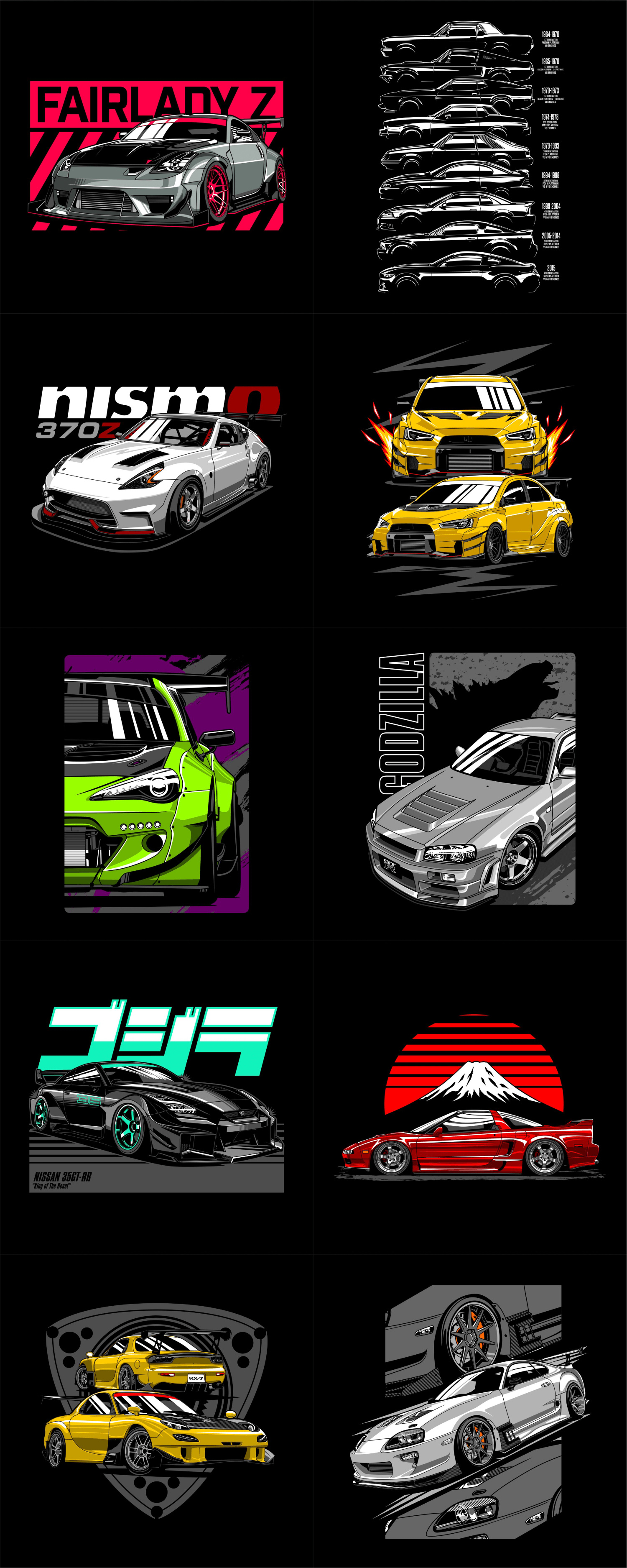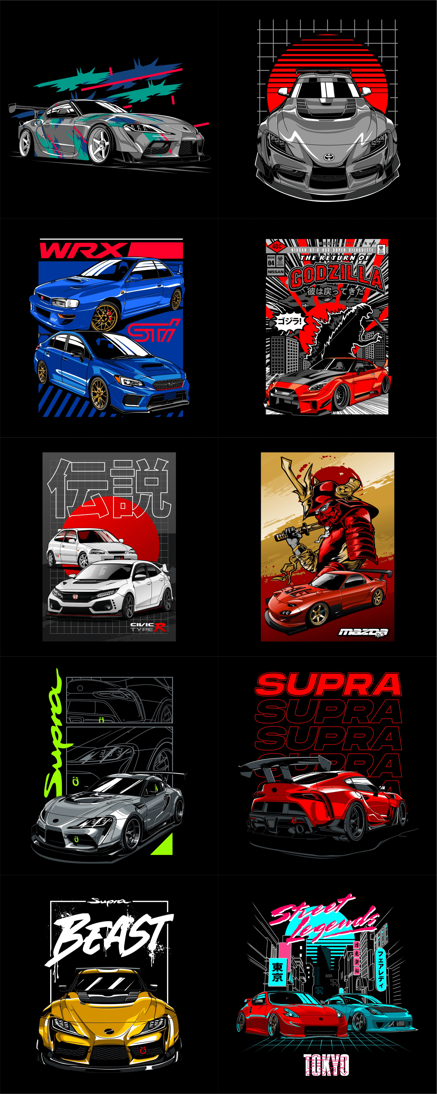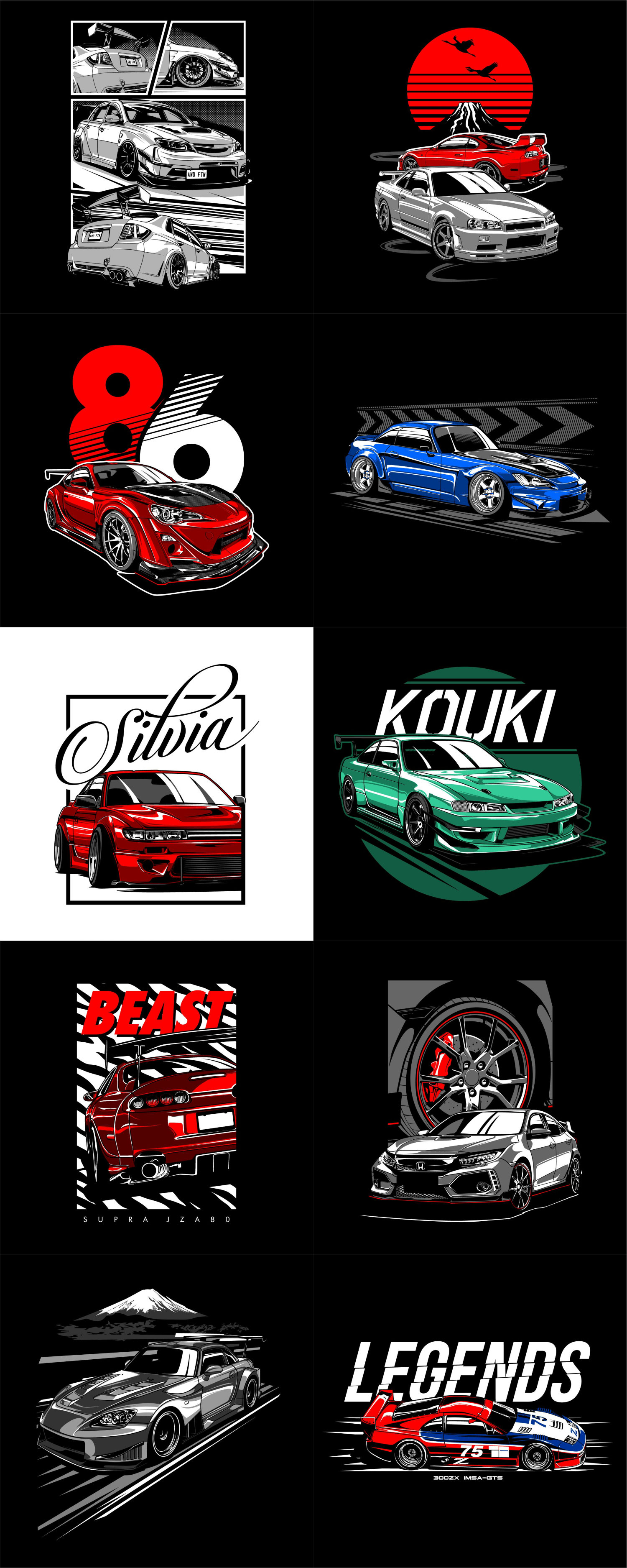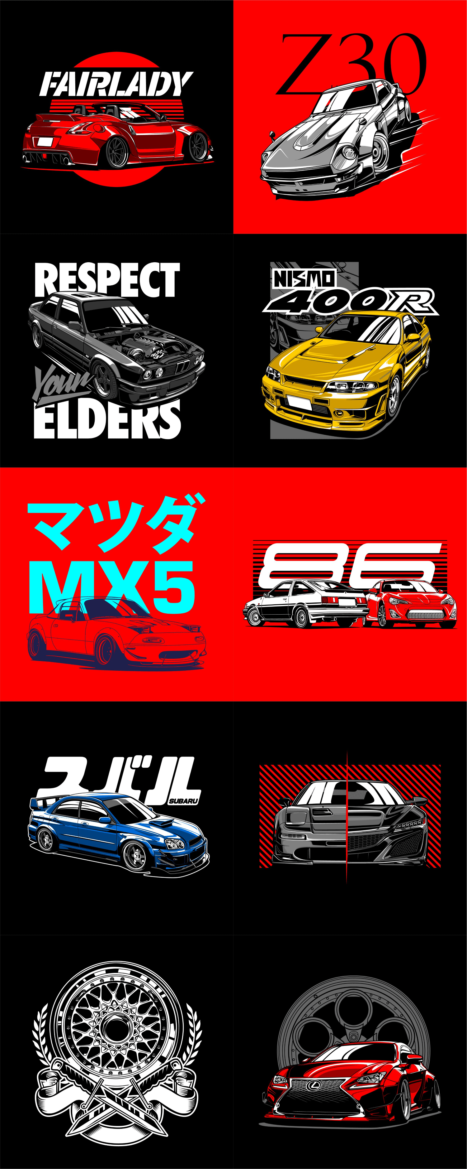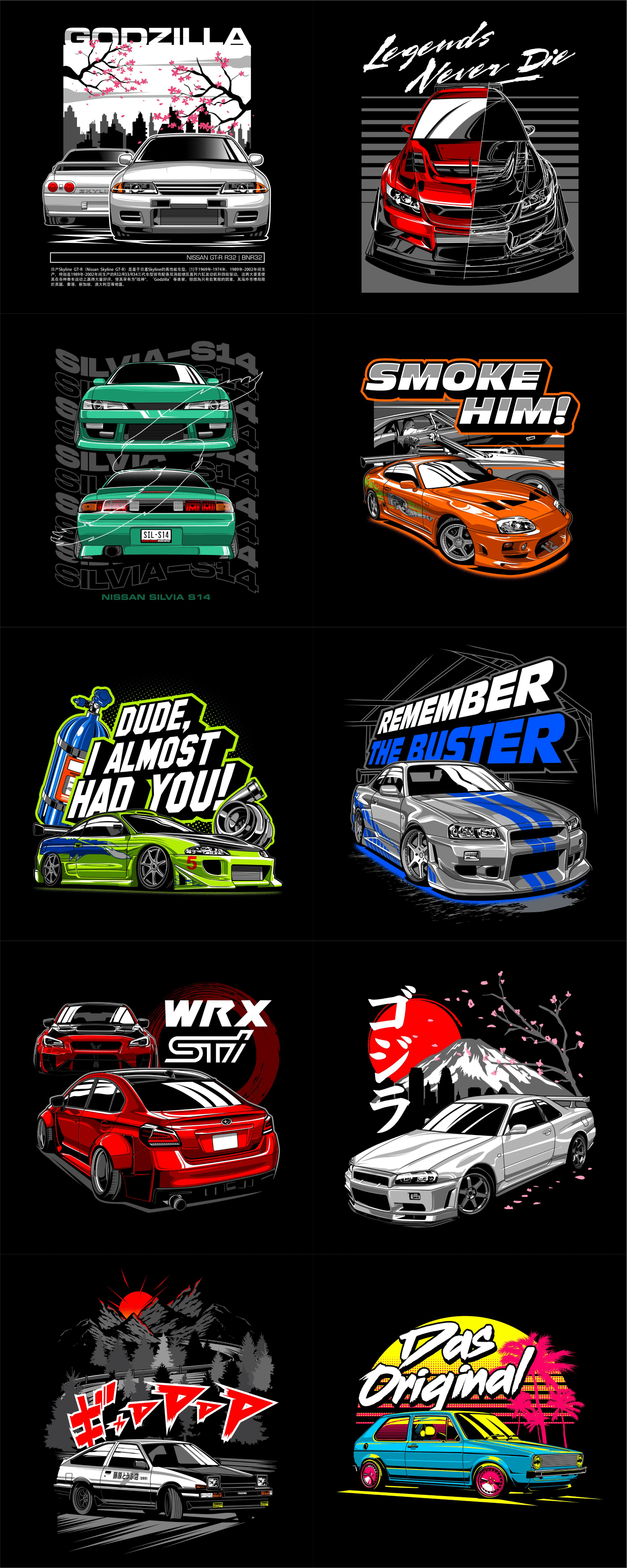 A new t-shirt designs pack featuring a collection of 100 illustrations with racing themes, cars, quotes & street designs, delivered with fully editable vectors as well as print ready versions of every design