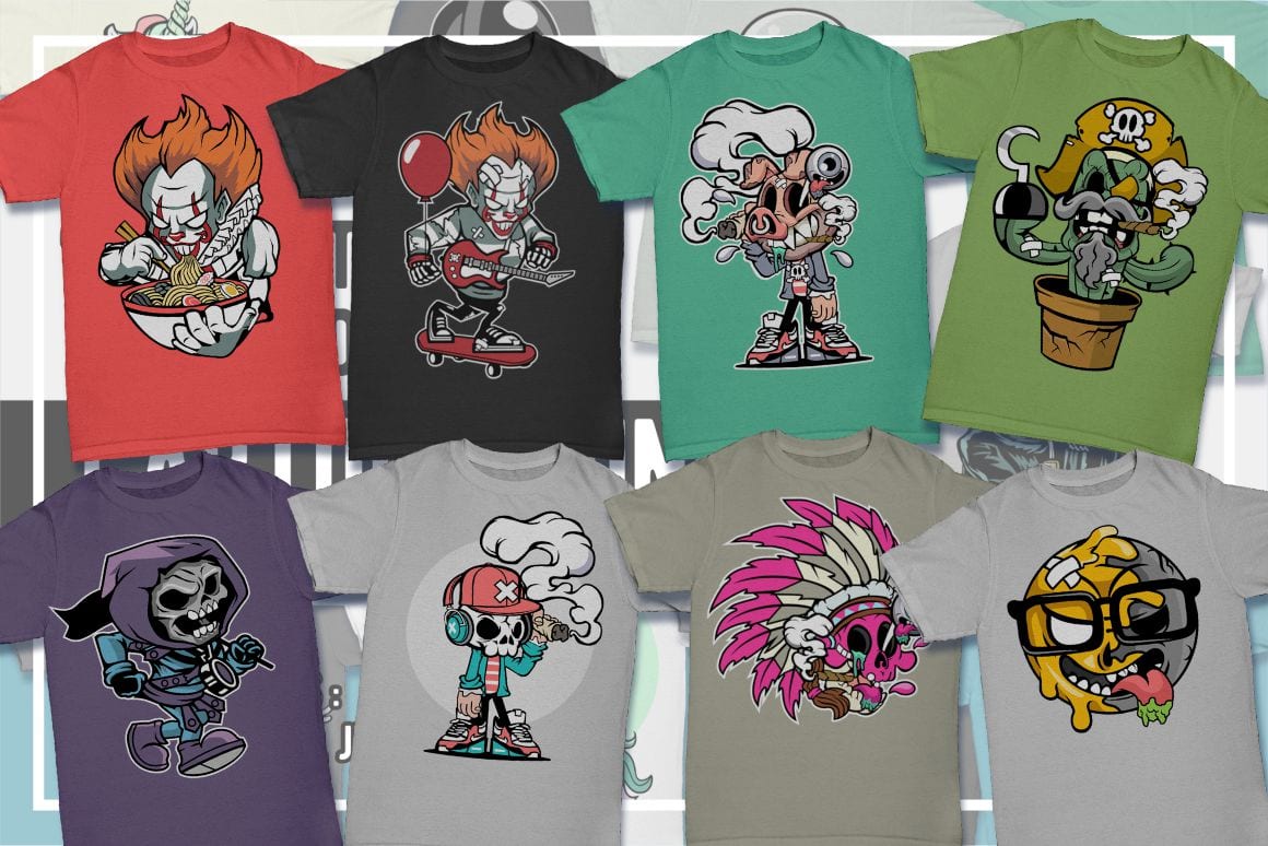 Grab this collection of cartoon characters for t-shirt design featuring 270+ colorful characters, 100% original illustrations as well as illustrations of characters from popular media like tv shows and video games, delivered with vector source files as well as use-ready files that you can starting printing right away