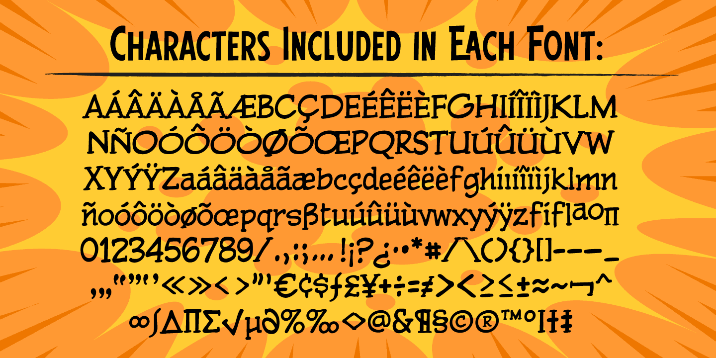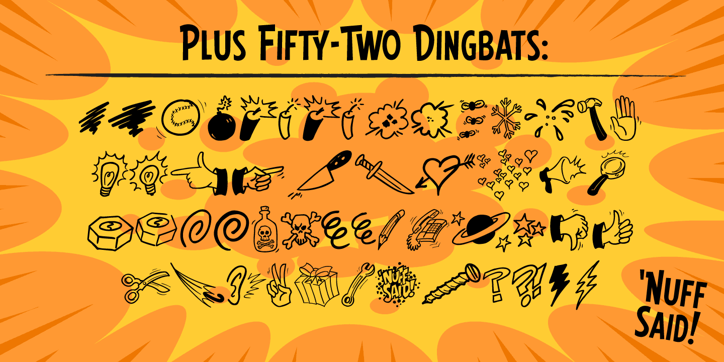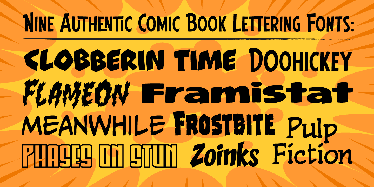 The package contains fonts that actual comic book letterers created and use to letter actual comic books, and have also saved the day in video games, TV shows, movie titles and wherever fun lively fonts were needed!