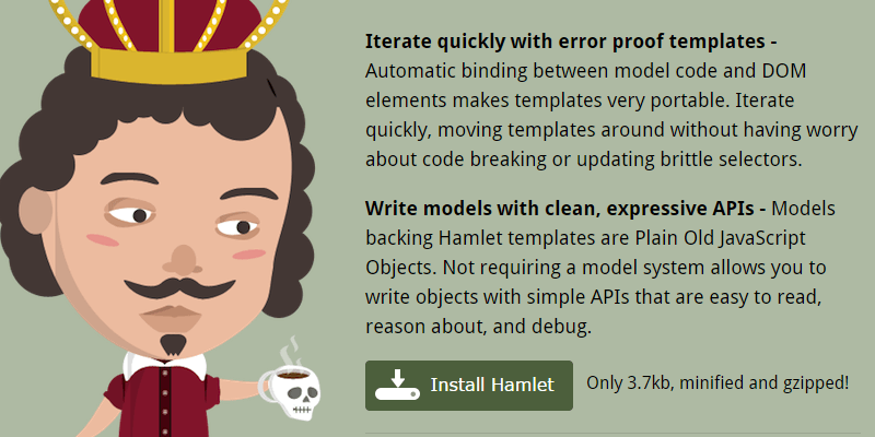 Hamlet is a simple and powerful client side template engine made in CoffeeScript. It allows you to create the templates with your favorite tools since it’s framework agnostic, and it keeps your data model and HTML elements in sync. This template engine was created by Inductor Labs and it’s free to download and use (MIT license).