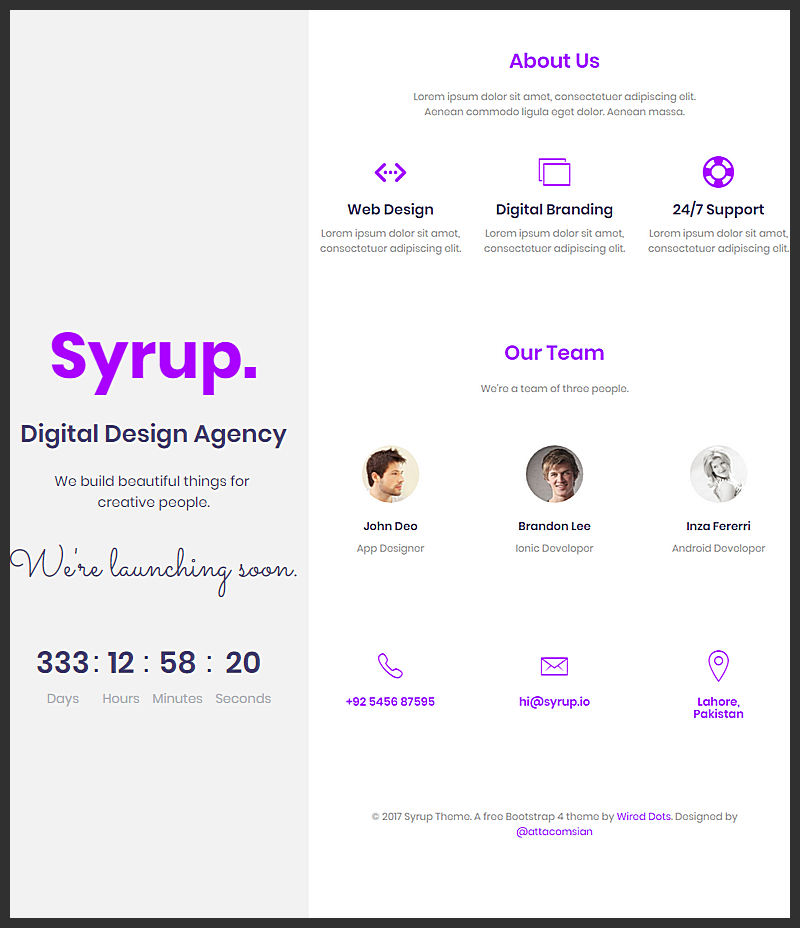 Syrup, a template for a “coming soon” landing page released by the wireddots team, features an elegant design with handwritten fonts, a small grid for services and team introduction, and contact information.