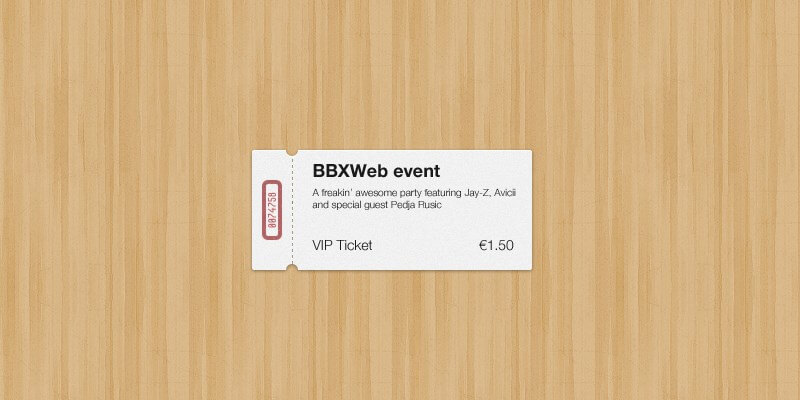 A fully editable Photoshop file offering a full ticket with a stub attached, featuring details such as serial number, big titles, soft shadows and a minimal design.